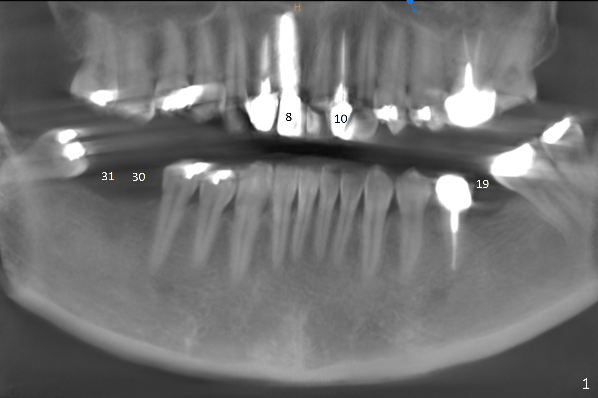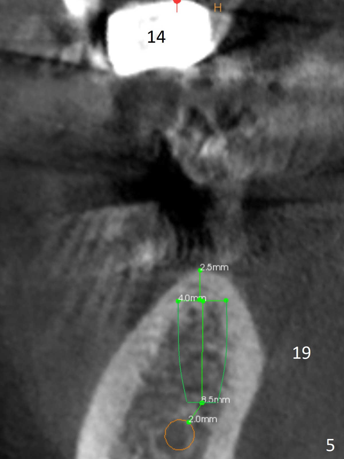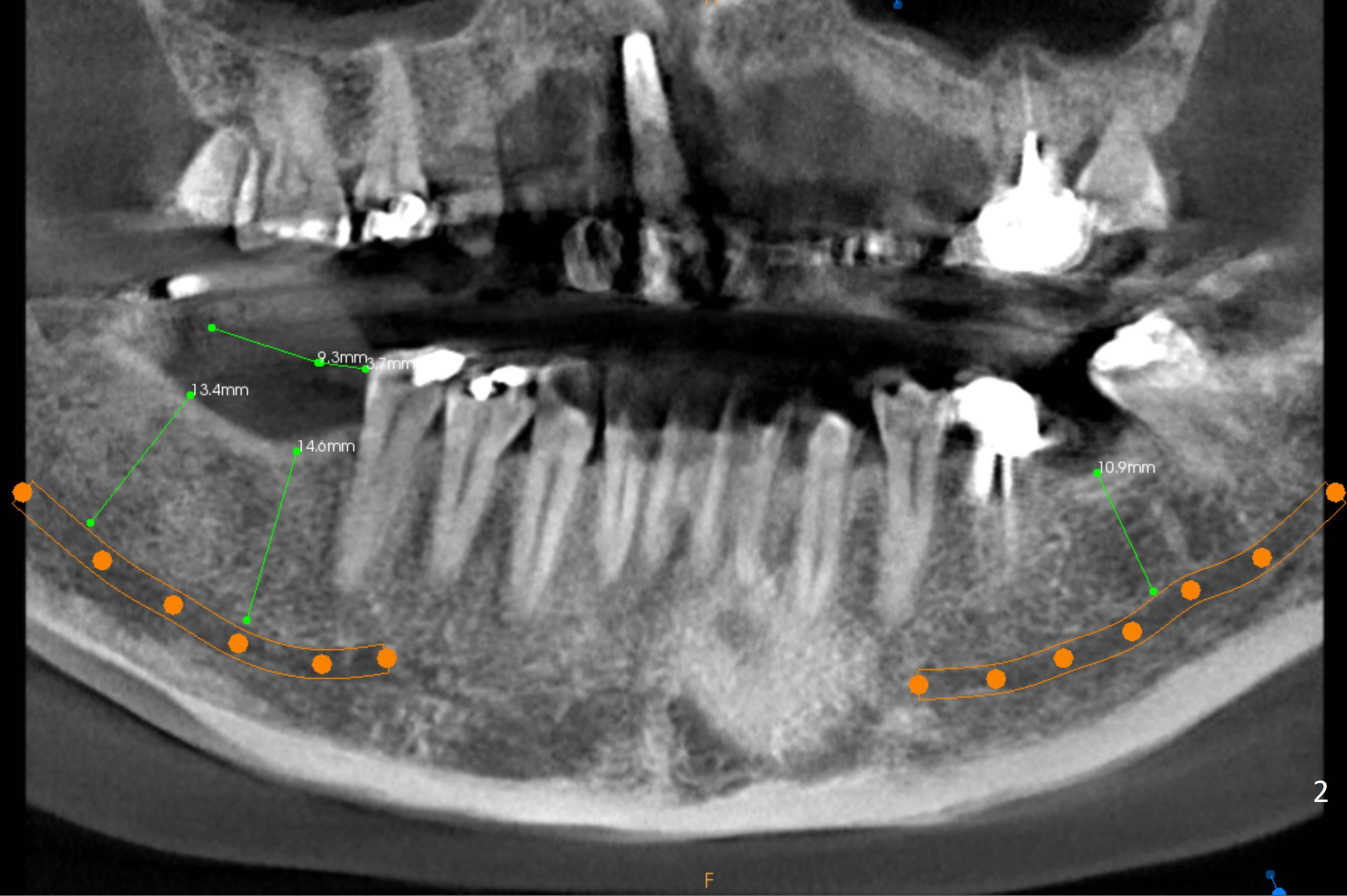 A healthy 37-year-old woman has 3 missing lower molars (Fig.1 panoramic view from CBCT). She has had implants at #8 and 10. The bone height for these molars is shown in Fig.2. The 1st molar ridges appear to be narrow (Fig.4,5,6), as compared to that of the 2nd molar (Fig.3 (B: buccal)). Ridge reduction seems to be necessary for the 1st molar sites prior to implant (green area) placement or deeper osteotomy.