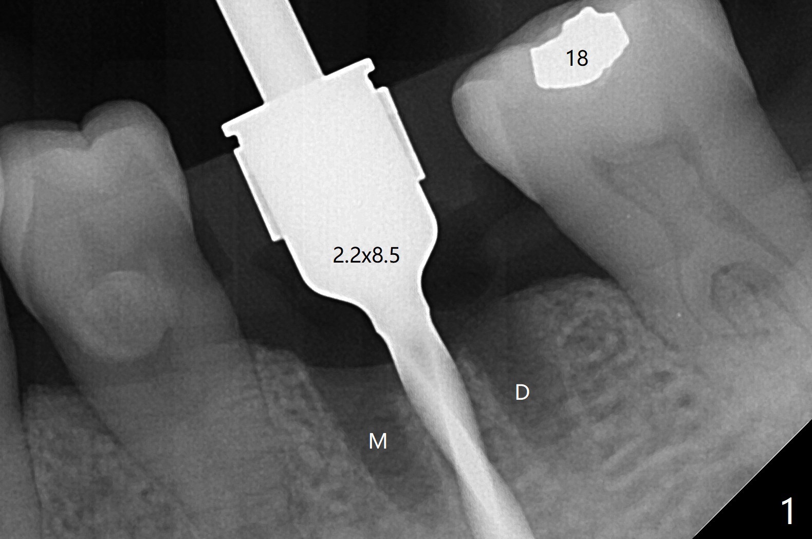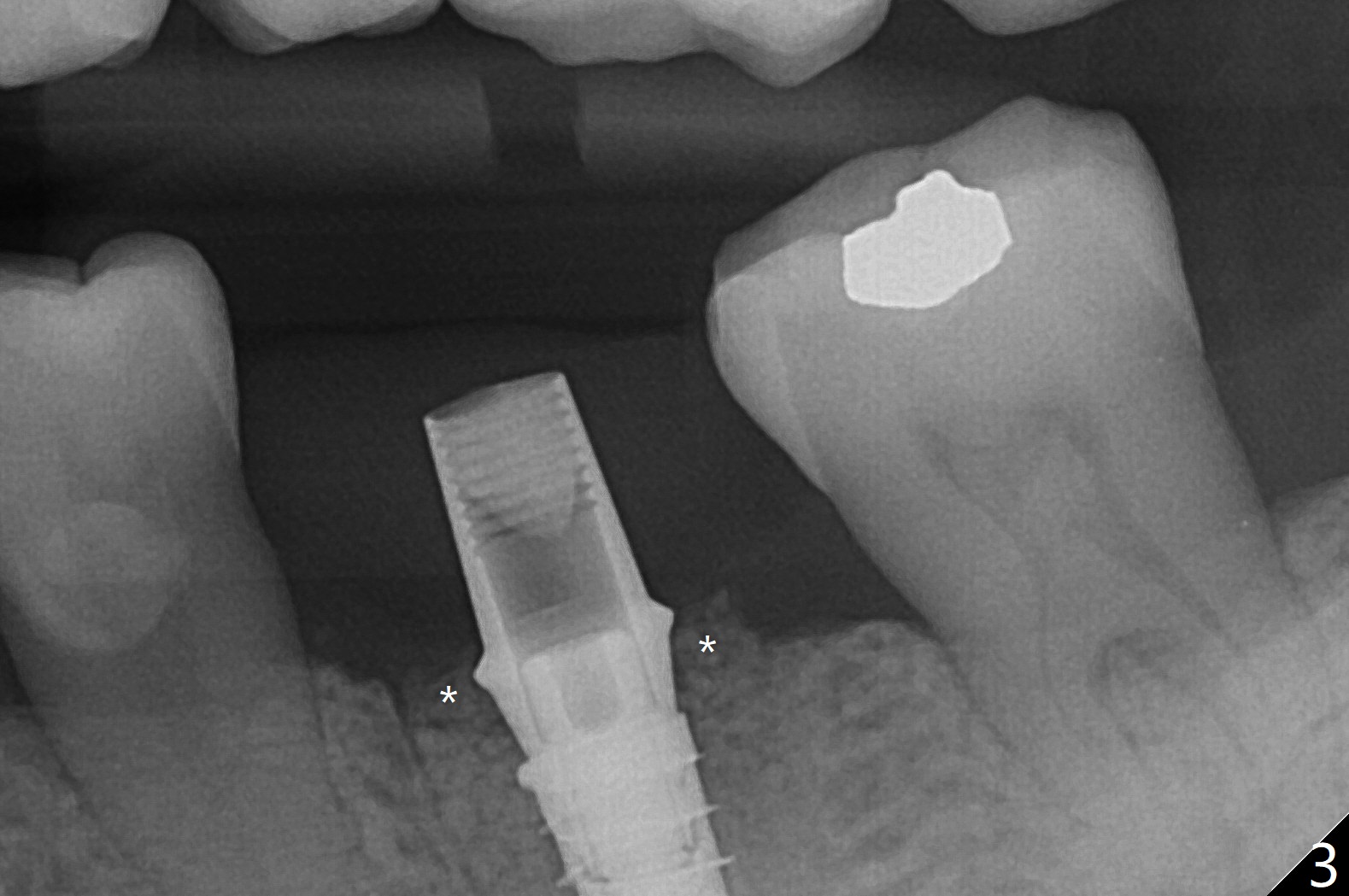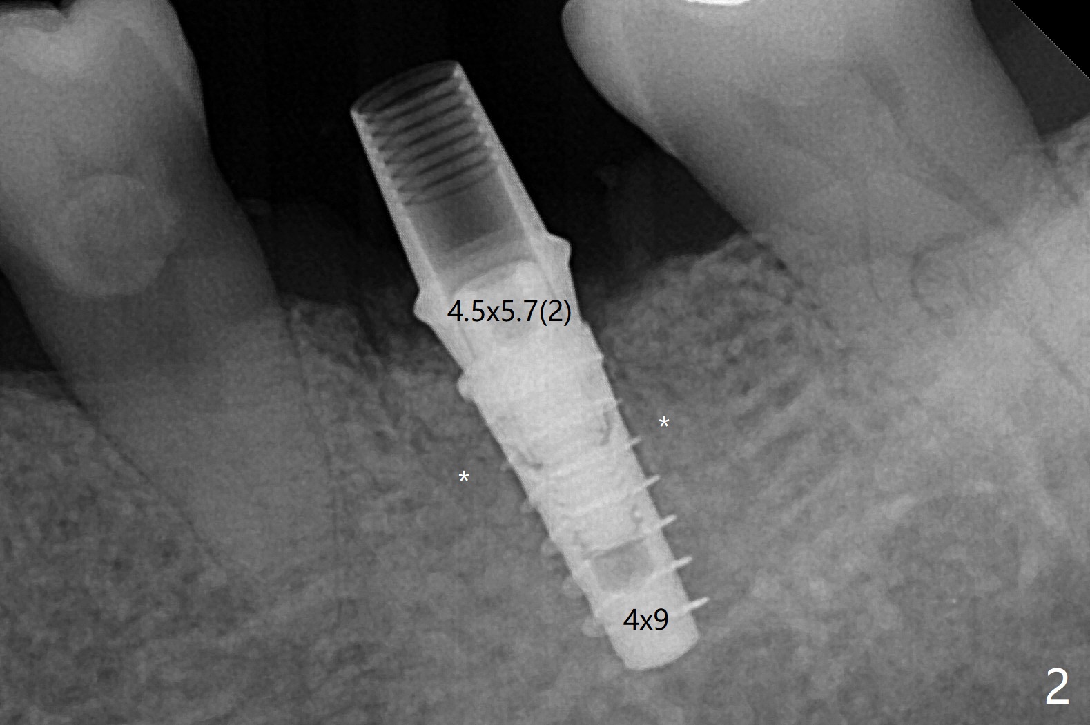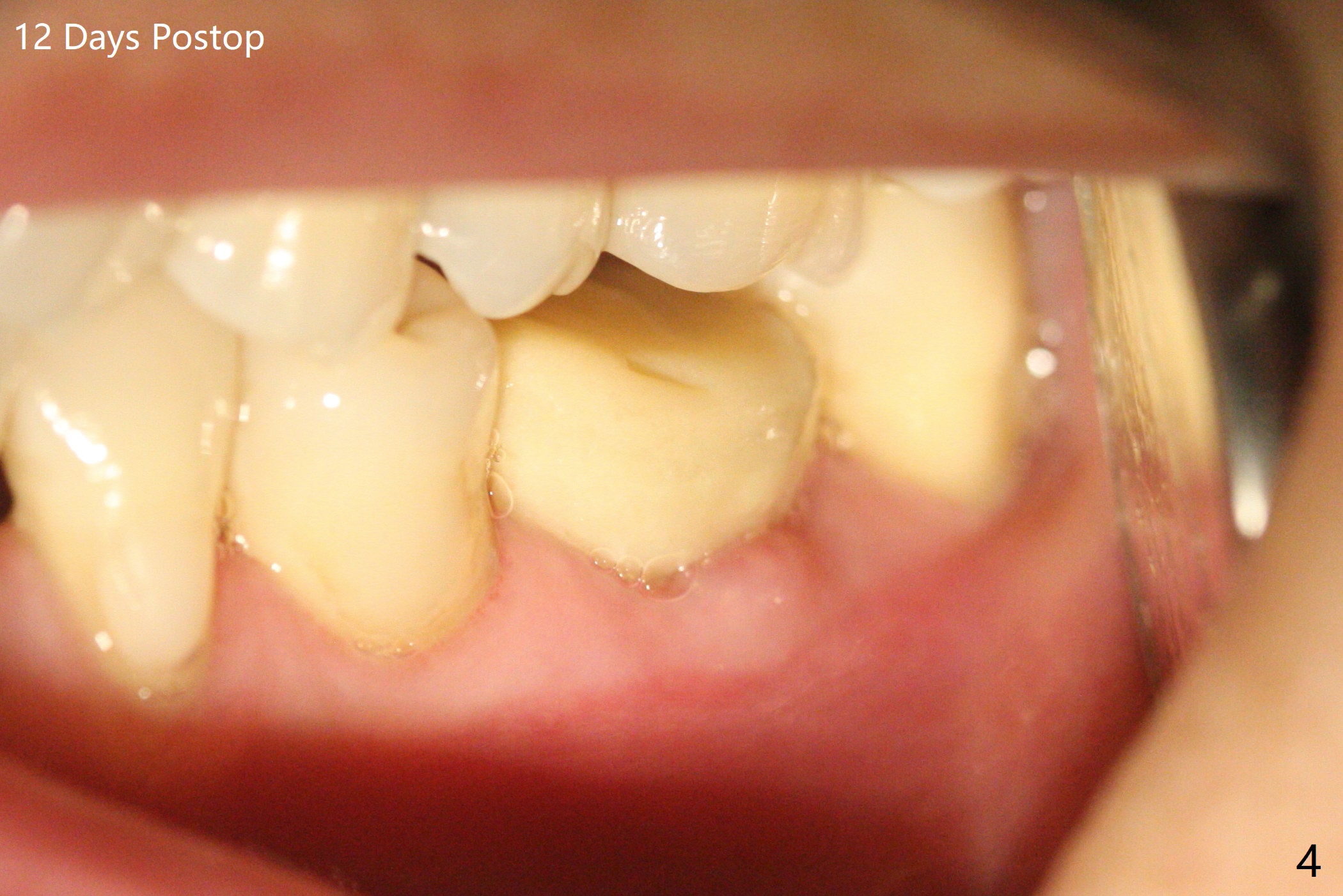 左下第一磨牙拔除后,放置导板,最细钻头到深度,没有偏移: 在中隔正中(图一),细短植体植入后基本保持在中隔之中(图二),扭力~30Ncm,在近中,远中剩余牙槽窝植骨后(图二:*),安置修复基台。制作临时牙冠后,在基台周围再次放置骨粉(图三)。术后7天牙周敷料脱落,12天复查时,临时牙冠周围软组织(角化龈,龈乳头)正常(图四)。