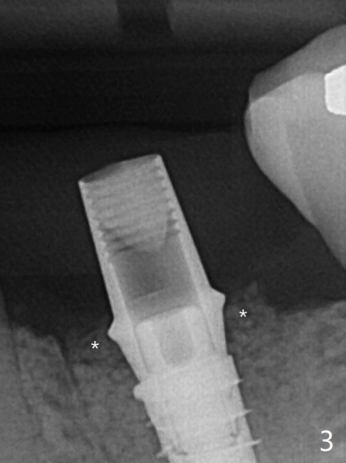 细短植体植入后基本保持在中隔之中(图二),扭力~30Ncm,在近中,远中剩余牙槽窝植骨后(图二:*),安置修复基台。制作临时牙冠后,在基台周围再次放置骨粉(图三)。