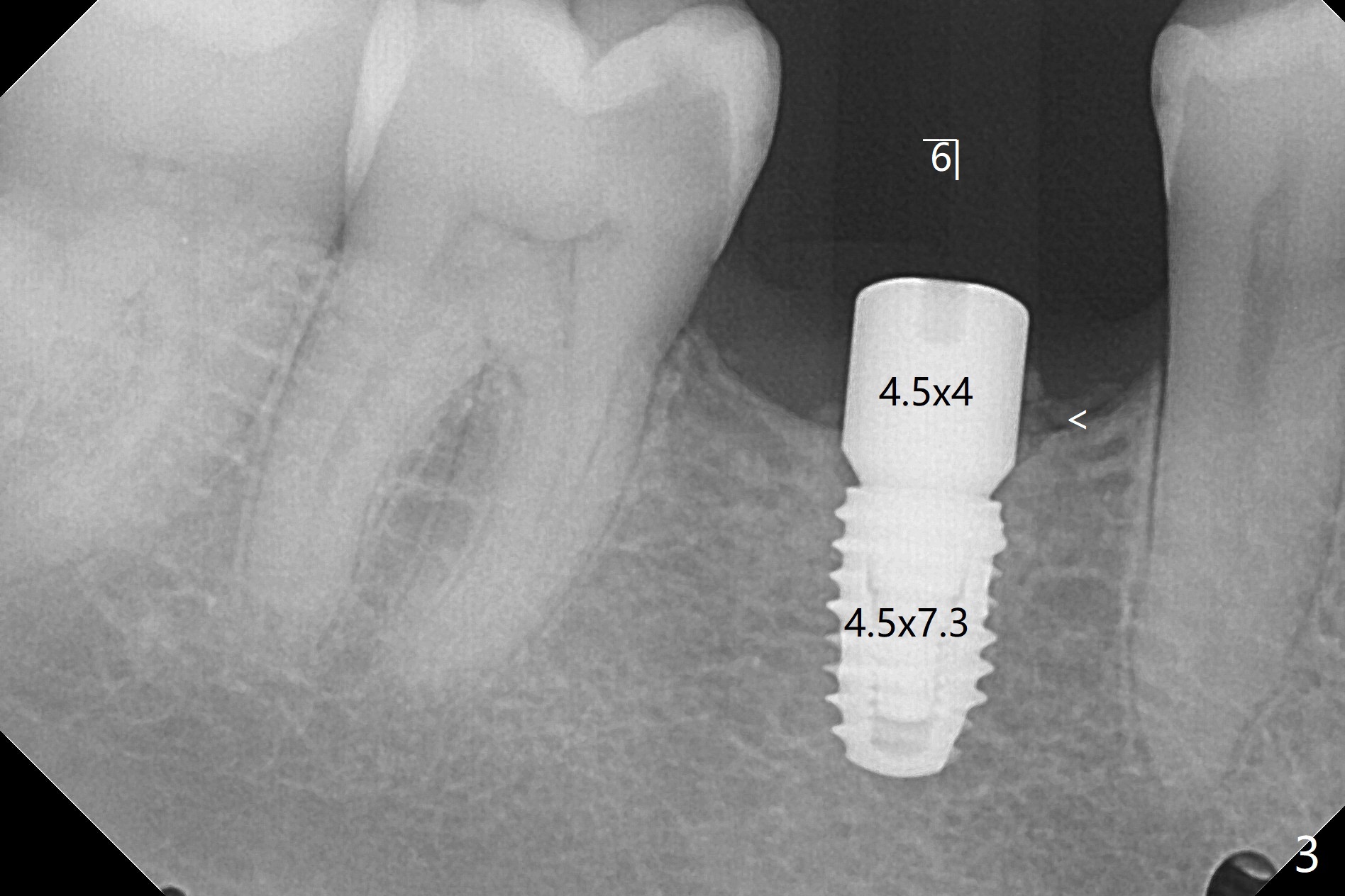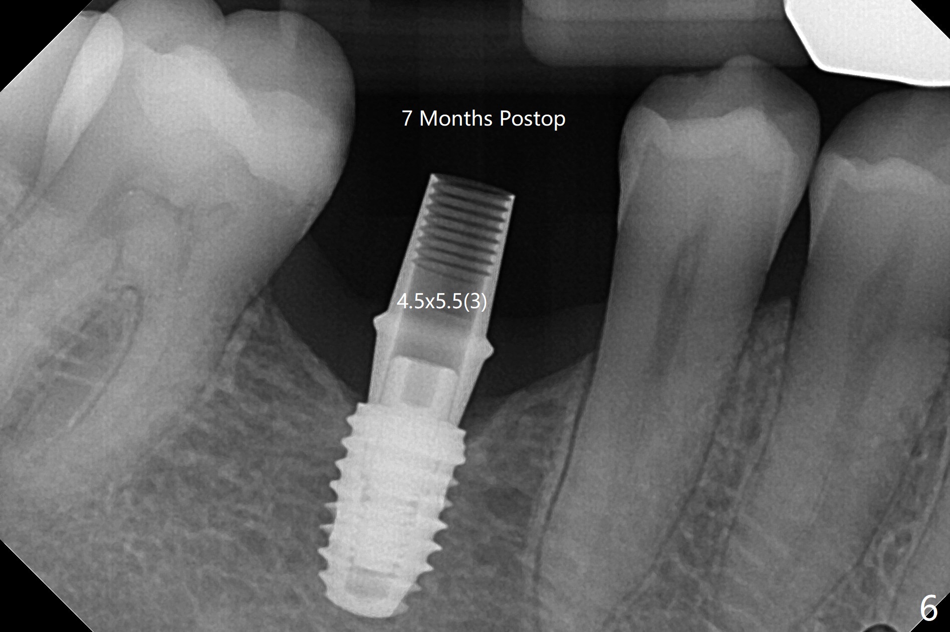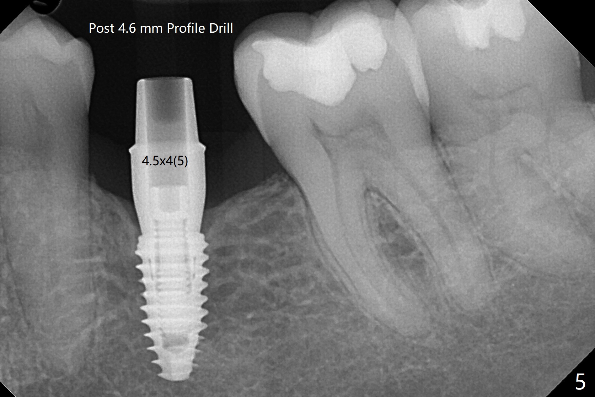 术后7个月左下4毫米修复基台无法就位(图四:箭头),局麻下使用4.6毫米Profile钻头后(去除软硬组织阻挡),4.5毫米修复基台顺利就位(图五)。右下第一次手术已经应用Profile钻头,牙槽嵴吸收,所以放置4.5毫米修复基台没问题(图六)。第一次手术应该使用Profile钻头。