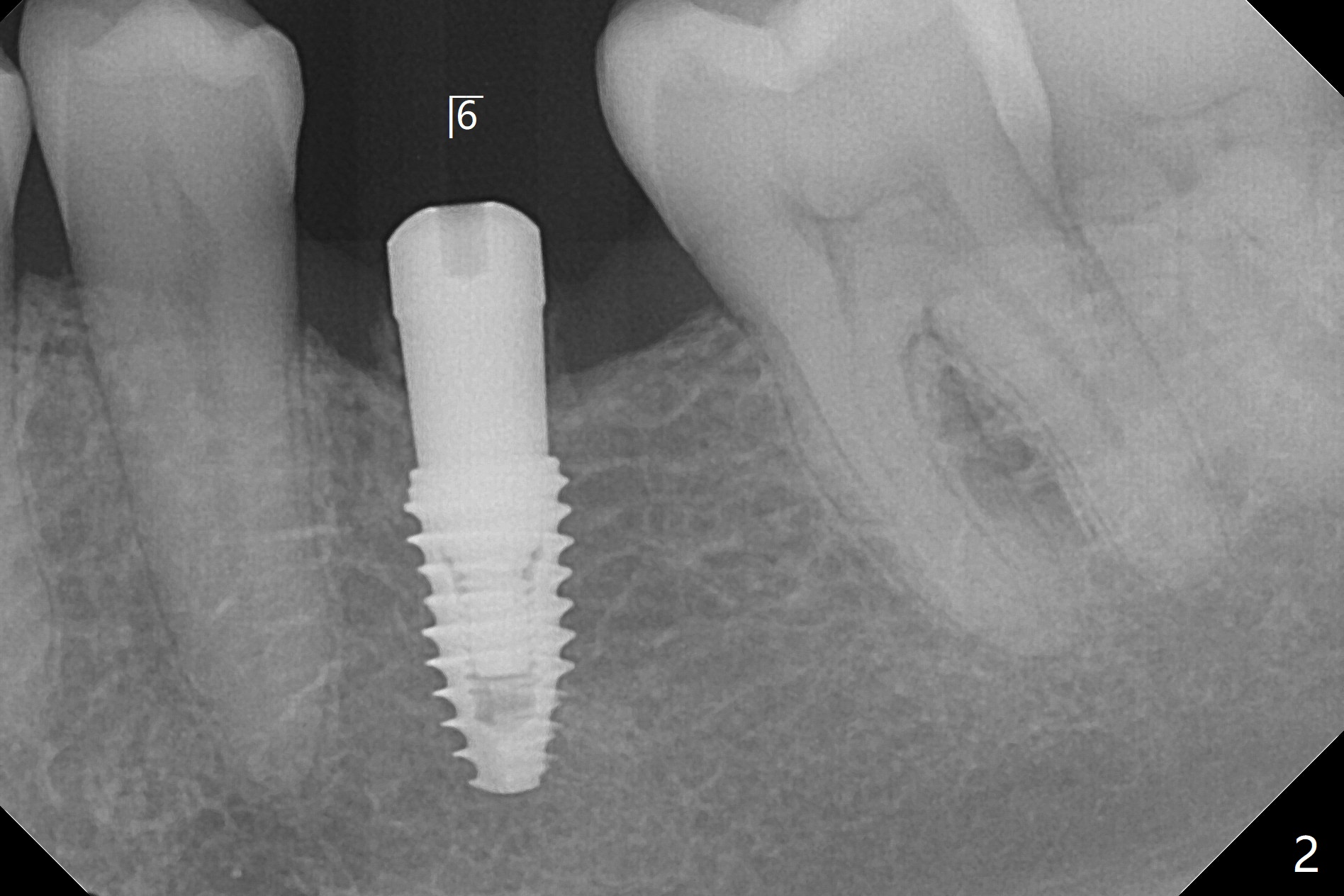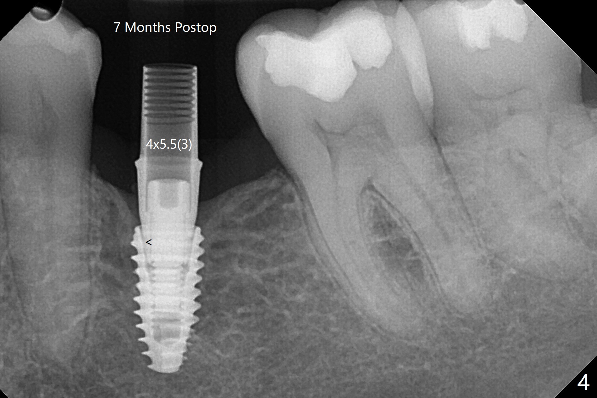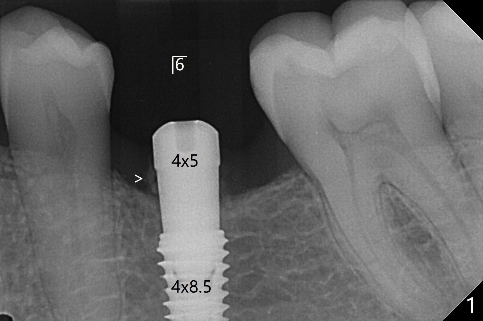 术后7个月左下4毫米修复基台无法就位(图四:箭头),局麻下使用4.6毫米Profile钻头后(去除软硬组织阻挡),4.5毫米修复基台顺利就位(图五)。右下第一次手术已经应用Profile钻头,牙槽嵴吸收,所以放置4.5毫米修复基台没问题(图六)。第一次手术应该使用Profile钻头。