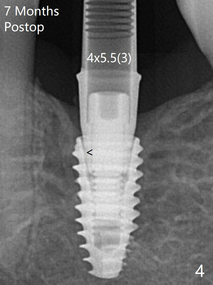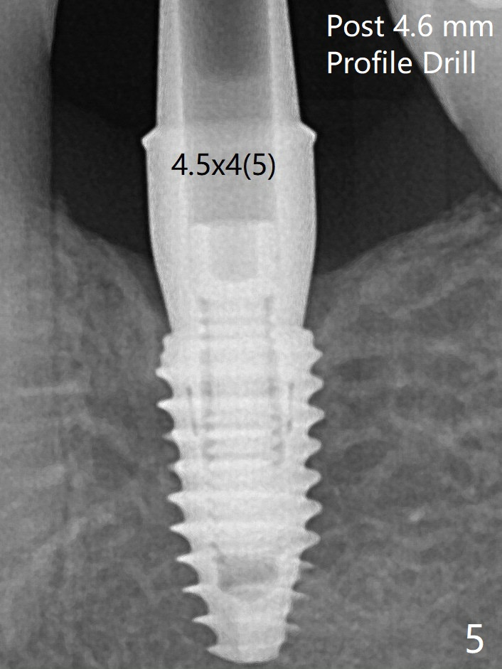 局麻下使用4.6毫米Profile钻头后(去除软硬组织阻挡),4.5毫米修复基台顺利就位(图五)。手拧紧螺丝顺手,不发出响声。因此第一次手术应该使用Profile钻头。