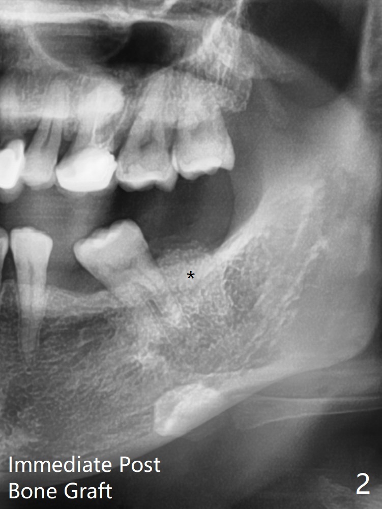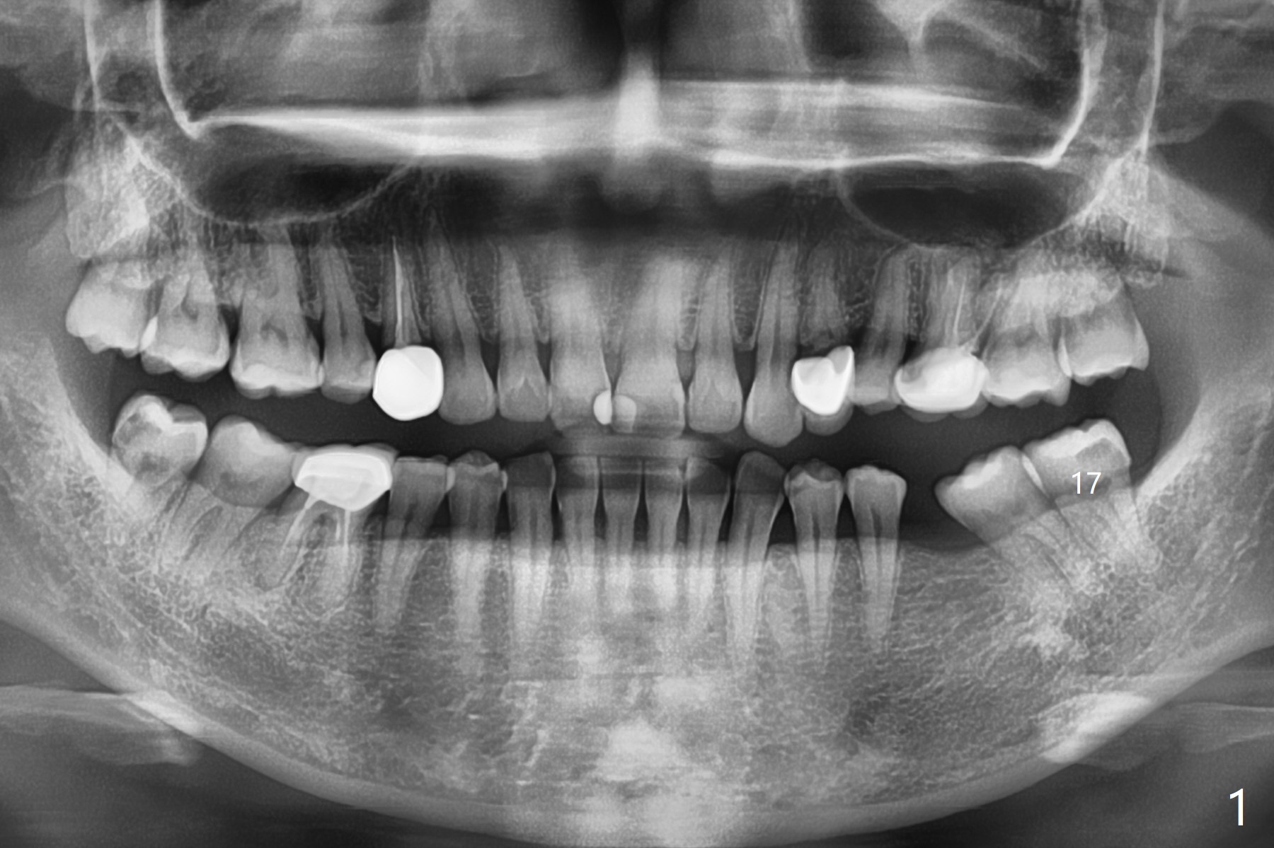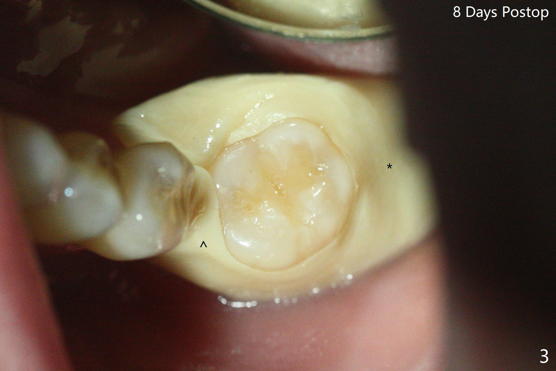 39岁女渴望有一个正常19号牙(图一),第一步,17号牙拔除,粘性骨粉植骨(图二:*),PRF覆盖,树脂敷料。后者术后八天由于倒凹(图三:^),稳定,下面(*)骨粉谅必安居乐业。术后一两个月(伤口愈合,18号牙牙冠远中面充分暴露)后,准备口扫做局部矫正(Clear Aligner),竖直18号牙,植骨有利于18号牙进入17号牙牙槽窝。然后再口扫制作19号牙种植导板。
