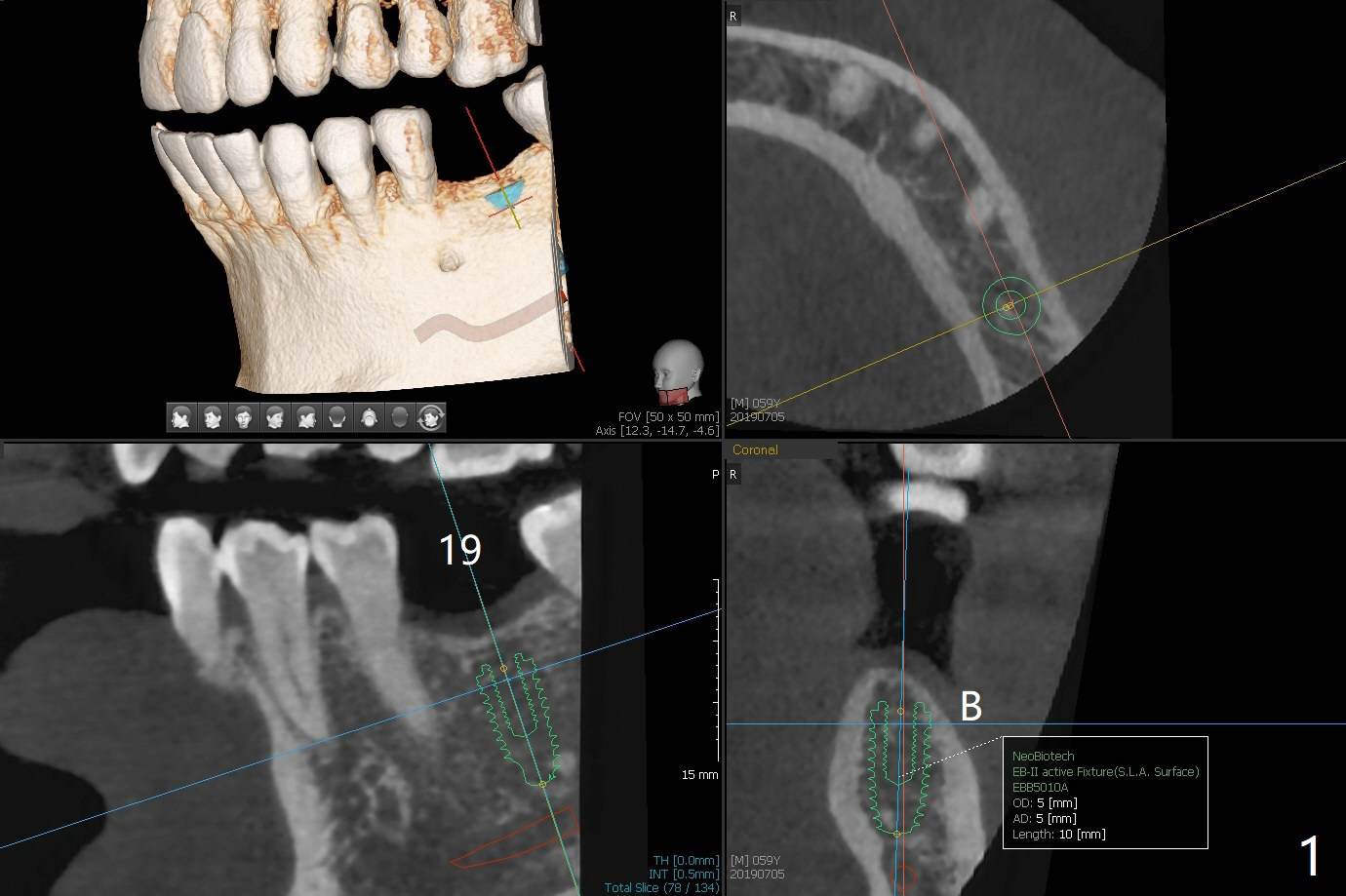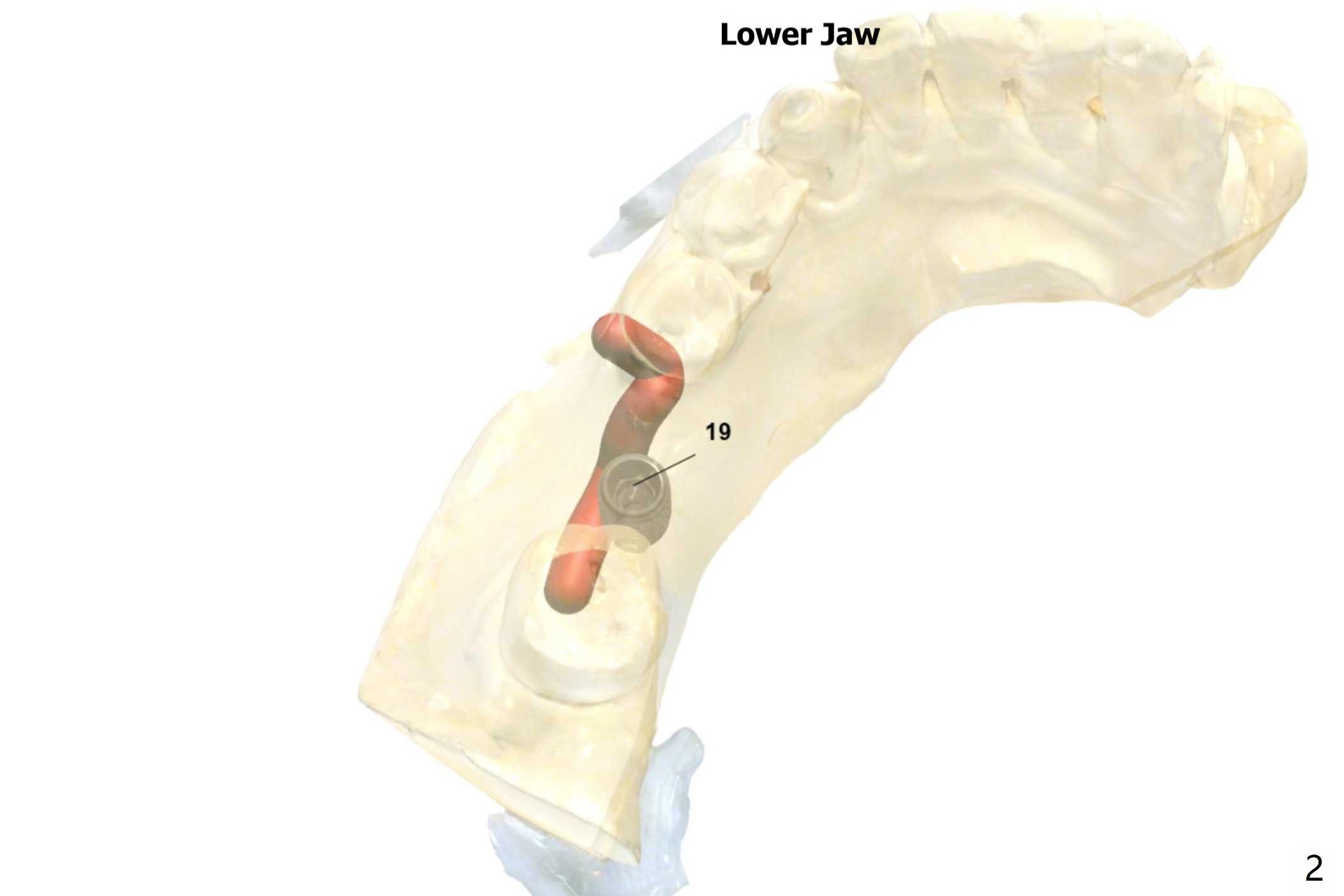 A 59-year-old man has lost the tooth #19 for 30-40 years. Although the tooth #14 has supraerupted for ~ 2mm, there is enough vertical space for restoration (Fig.1), probably related to vertical bone loss. Use tissue-level implant (4.5x14 mm) to reduce screw loosening. Prepare a 4x5 or 3 mm unipost preferably with a precut groove to hold periodontal dressing in place. Return to Lower Molar Immediate Implant, Trajectory II Xin Wei, DDS, PhD, MS 1st edition 07/05/2019, last revision 08/13/2019