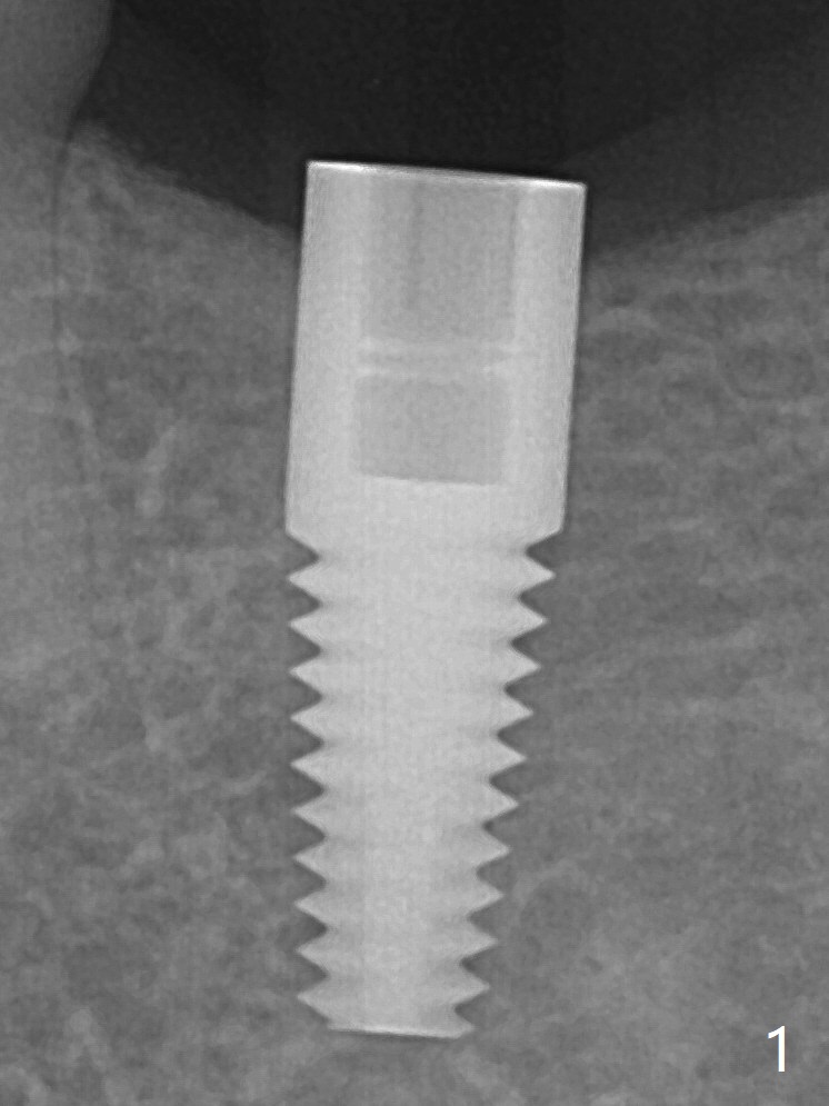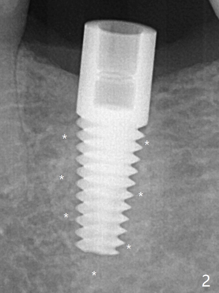 After 4.0x10 mm drill with 9 mm offset for 4.5x10 mm bone-level implant at #19, a 4.5x17 mm tissue level tap is inserted with apparently low torque (probably without reaching the depth). When a 4.5x14 mm tissue level implant is placed with high torque, a 4.5x7.3 mm drill is used for ~ 6.5 mm. The implant loses the primary stability with over-insertion (Fig.1). When an abutment is placed, the implant is critically loose. Mixture of autogenous bone, Osteogen and allograft is placed in the osteotomy. The implant regains stability with better placement level for restoration (Fig.2). In fact the bone density around the implant increases (Fig.2 *). Retrospectively, a 5x14 mm implant should be placed.