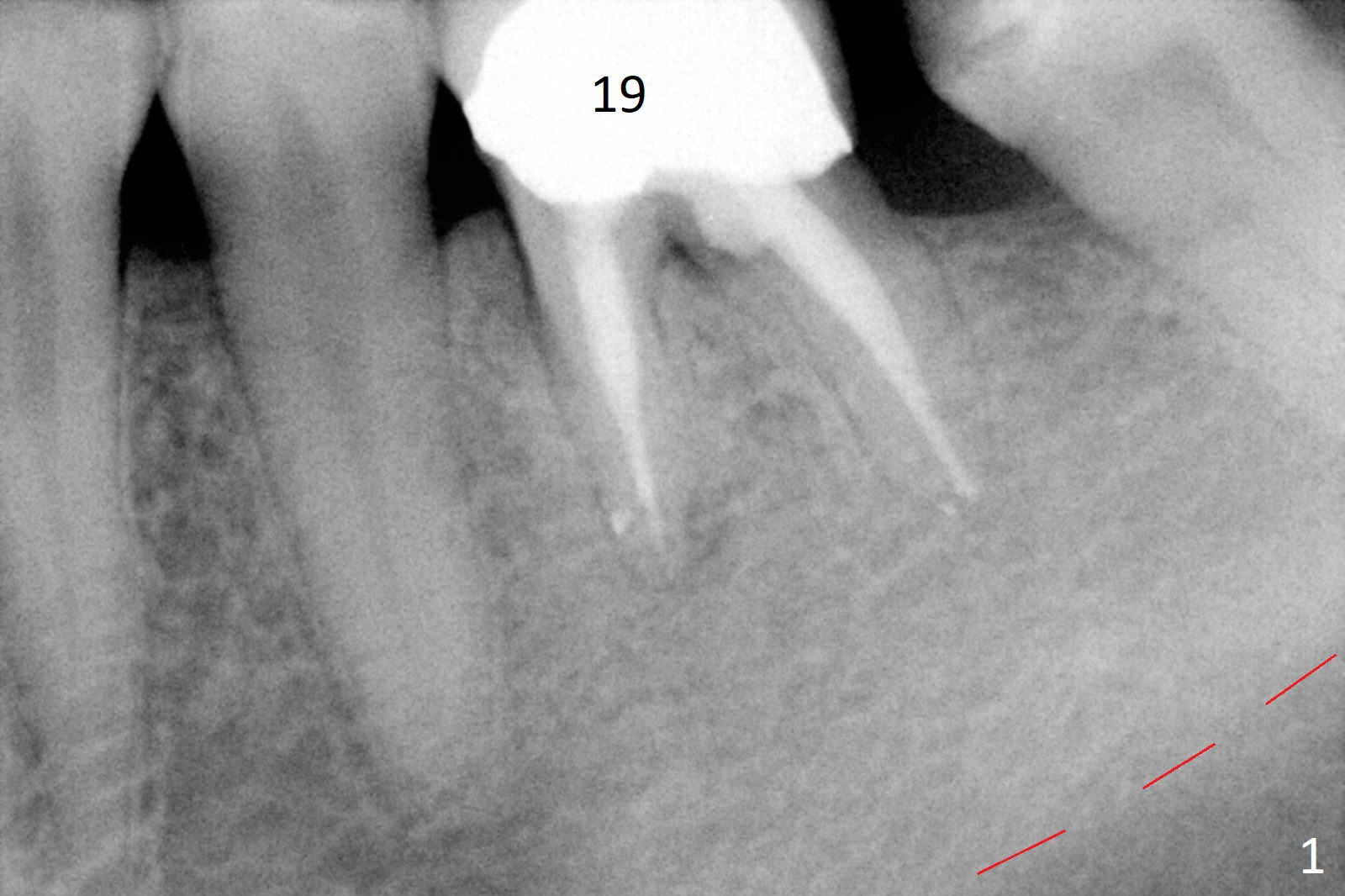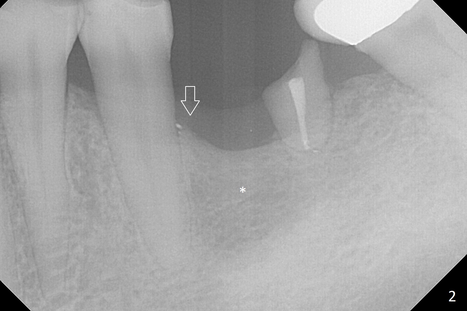 A 50-year-old man will return for #19 implant placement following the one at #30. In the last 9 years, the tooth have broken down with formation residual roots and loss of one of them (Fig.1,2). More important is the coronal portion of the alveolar bone becoming apparently thinner (Fig.2 *). There is also bone loss associated with the neighboring tooth (arrow). It is expected that the implant to be placed will be narrower and/or shorter than the one at #30. After removal of the distal residual root, use Magic Split as a scalpel to extend an incision mesially and start bone expansion, followed by Magic Expanders and IS drills if needed. Take preop photos to show the atrophic mesial ridge.