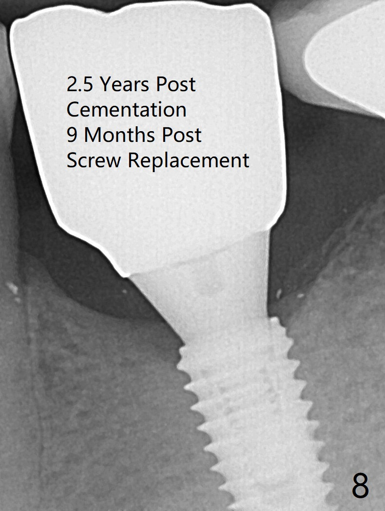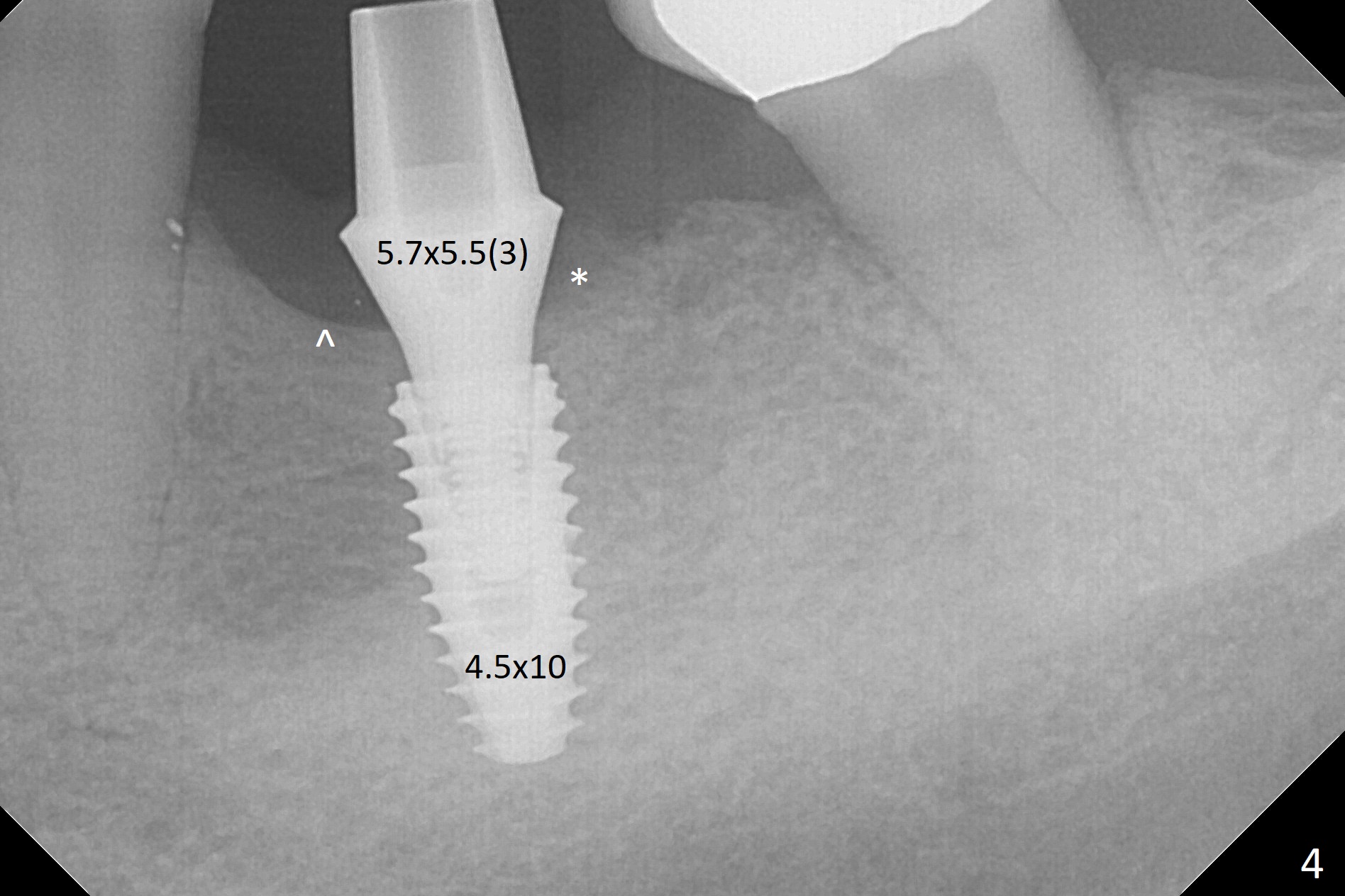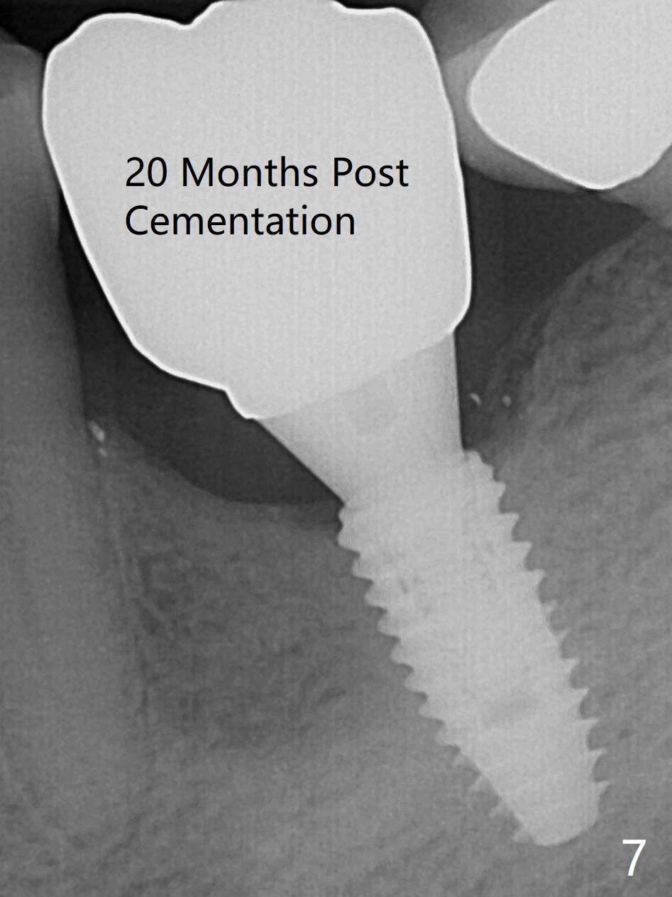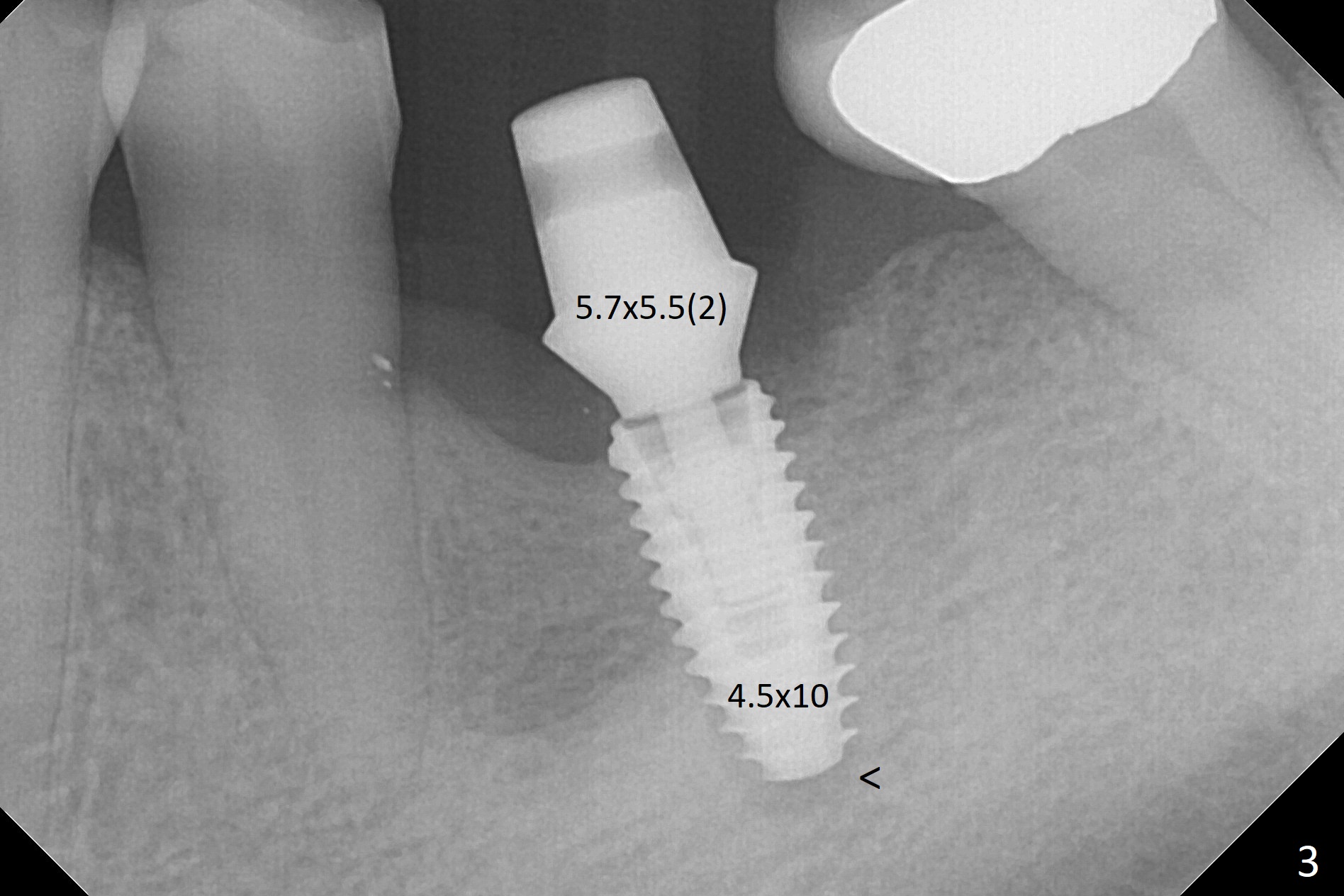 After extraction of the distal residual root at #19 (Fig.1), osteotomy is initiated in the mesial (M) aspect of the distal socket (Fig.2). Magic Split proves dense bone. When a 4.5x10 mm dummy implant is placed with stability, there is an apical space (Fig.3 <); the dummy abutment is 5.7x5.5(2). With the final implant (4.5x10 mm, Fig.4) being placed deeper to close the apical space, the cuff of the final abutment increases by 1 mm. Autogenous bone is used to pack around the implant distobuccally (*). Although the implant seems to be placed significantly apical to the lingual crest (^), it is at the buccal crest. There seems to be no bone loss 3 months postop; impression is taken (Fig.5). The crown/abutment at #30 is retightened 22 days post cementation (5 months postop), probably related to unilateral mastication. In fact, #30 is the only functioning molar on the right side (with unfavorable crown/implant ratio (long cuff 4 mm, vs. 3 mm at #19); #2 severely decayed); the crown at #19 is cemented at the same appointment (Fig.6). The crowns/abutments at #19 and 30 are loose 7 months later. When the crown/abutment at #30 is loose 2nd time 1 year 7 months post cementation, the screw at #19 fractures (Fig.7 taken post retightening). The tooth #2 needs a crown. The patient cannot use the anterior teeth, since the teeth #8 and 9 have root fracture. Can extraction and bone graft increase bone height? The abutment remains incompletely seated 9 months post screw replacement. It should be fixed soon. Return to Lower Molar Immediate Implant, Prevent Molar Periimplantitis (Protocols, Table), Armaments Screw Xin Wei, DDS, PhD, MS 1st edition 12/22/2017, last revision 02/24/2021