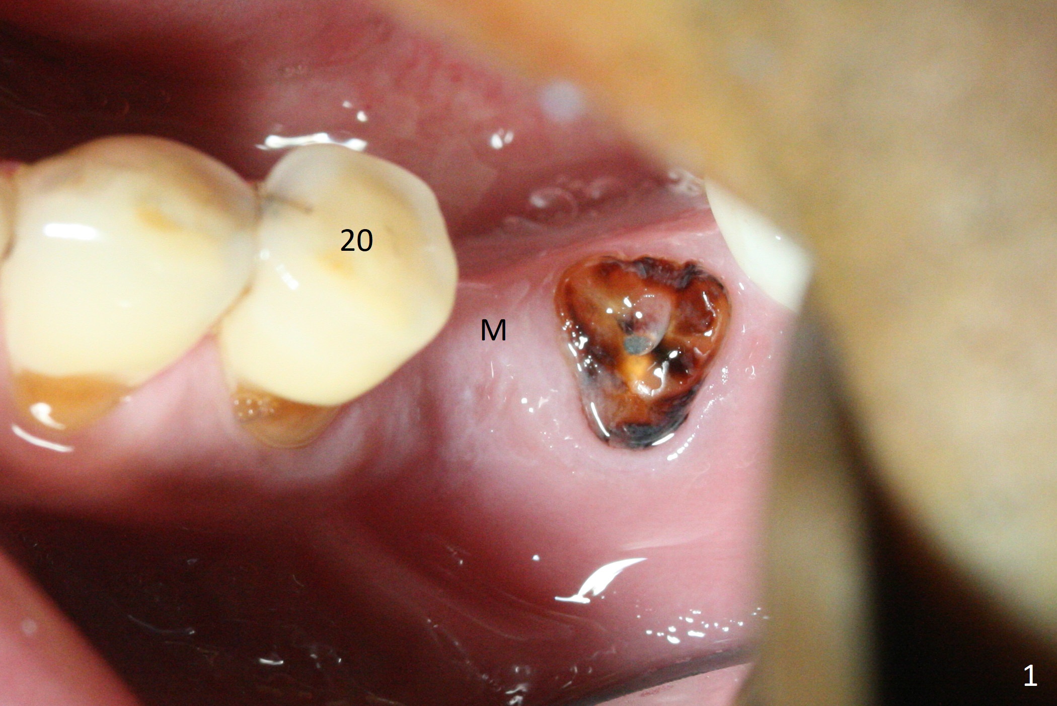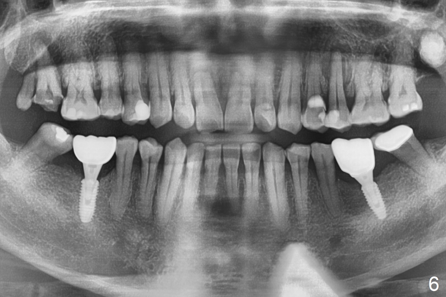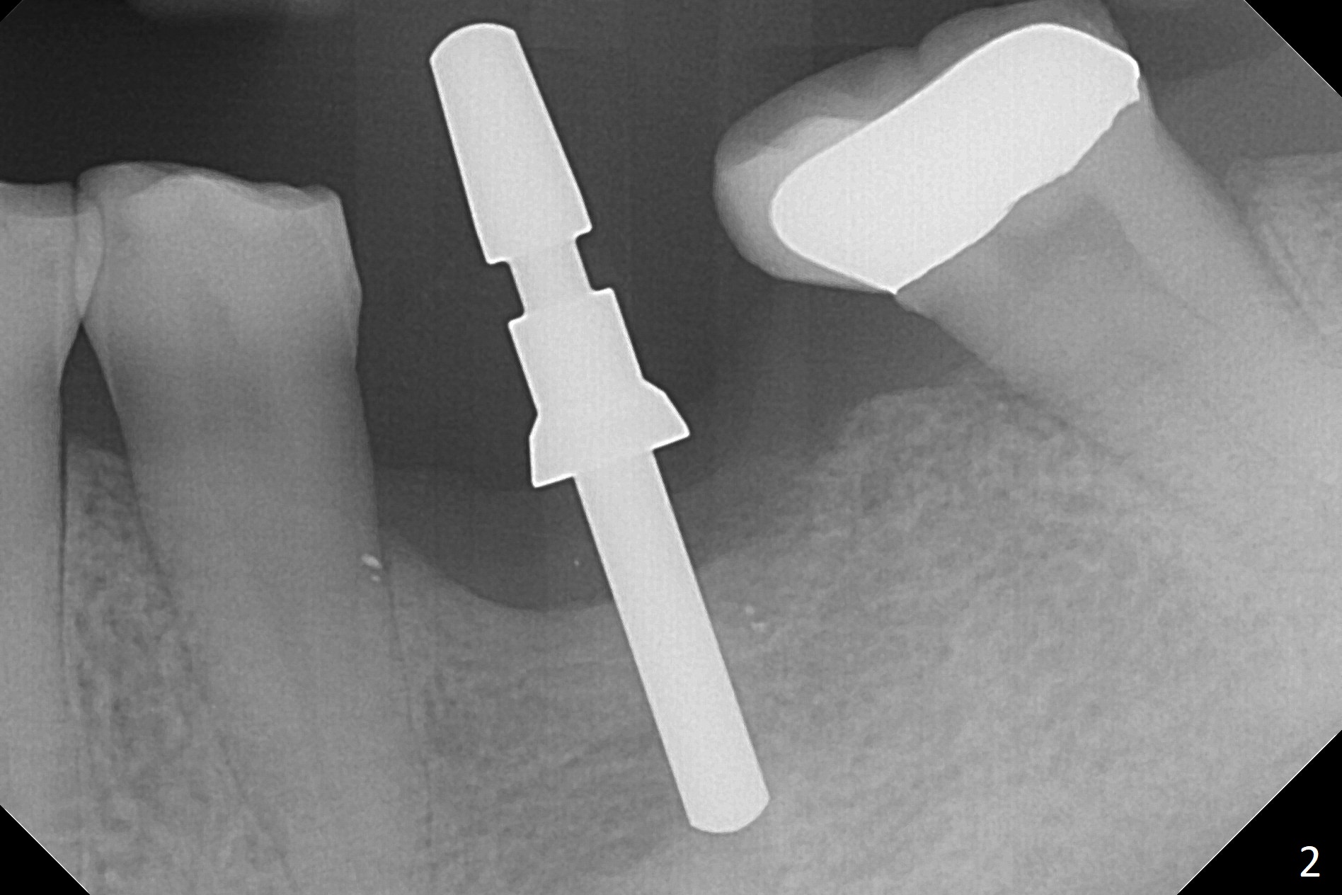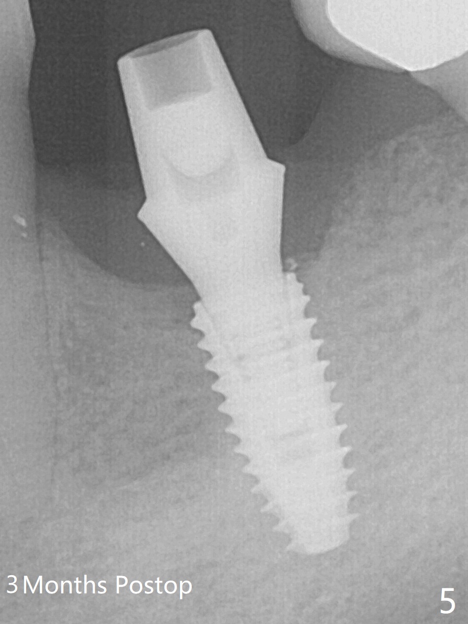 After extraction of the distal residual root at #19 (Fig.1), osteotomy is initiated in the mesial (M) aspect of the distal socket (Fig.2). Magic Split proves dense bone. When a 4.5x10 mm dummy implant is placed with stability, there is an apical space (Fig.3 <); the dummy abutment is 5.7x5.5(2). With the final implant (4.5x10 mm, Fig.4) being placed deeper to close the apical space, the cuff of the final abutment increases by 1 mm. Autogenous bone is used to pack around the implant distobuccally (*). Although the implant seems to be placed significantly apical to the lingual crest (^), it is at the buccal crest. There seems to be no bone loss 3 months postop; impression is taken (Fig.5). The crown/abutment at #30 is retightened 22 days post cementation (5 months postop), probably related to unilateral mastication. In fact, #30 is the only functioning molar on the right side (with unfavorable crown/implant ratio (long cuff 4 mm, vs. 3 mm at #19); #2 severely decayed); the crown at #19 is cemented at the same appointment (Fig.6). The crowns/abutments at #19 and 30 are loose 7 months later. When the crown/abutment at #30 is loose 2nd time 1 year 7 months post cementation, the screw at #19 fractures (Fig.7 taken post retightening). The tooth #2 needs a crown. The patient cannot use the anterior teeth, since the teeth #8 and 9 have root fracture. Can extraction and bone graft increase bone height? The abutment remains incompletely seated 9 months post screw replacement. It should be fixed soon. Return to Lower Molar Immediate Implant, Prevent Molar Periimplantitis (Protocols, Table), Armaments Screw Xin Wei, DDS, PhD, MS 1st edition 12/22/2017, last revision 02/24/2021