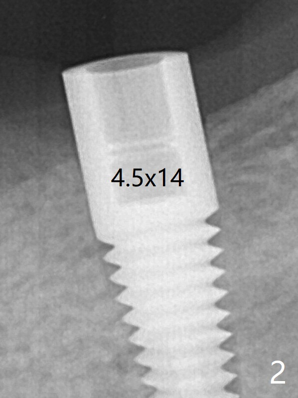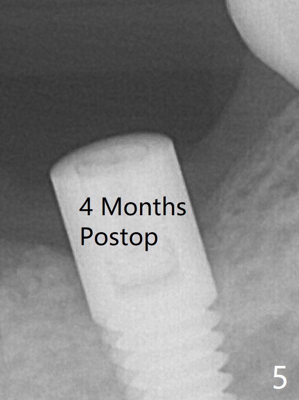 Following reuse of the guide and 4.5x7.3 mm drill, the same sized implant is placed deeper easily (Fig.2). There is no crestal bone loss 4 months postop (Fig.5), no pressure against the crest as the osteotomy is the same size of the implant. When the torque is low, just do not load.
