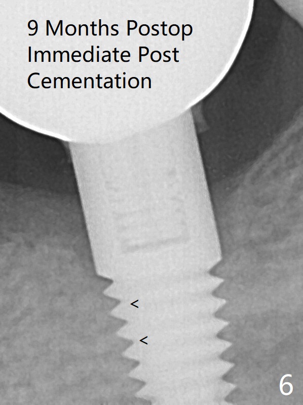 Following reuse of the guide and 4.5x7.3 mm drill, the same sized implant is placed deeper easily (Fig.2). There is no gap between the implant threads (osteointegration) 9 months postop/immediate post cementation (Fig.6 < (coronavirus)), although the crestal bone has lost. After cementation, the tooth #20 has no mobility; note bone loss around the root of #20 (Fig.4,5).