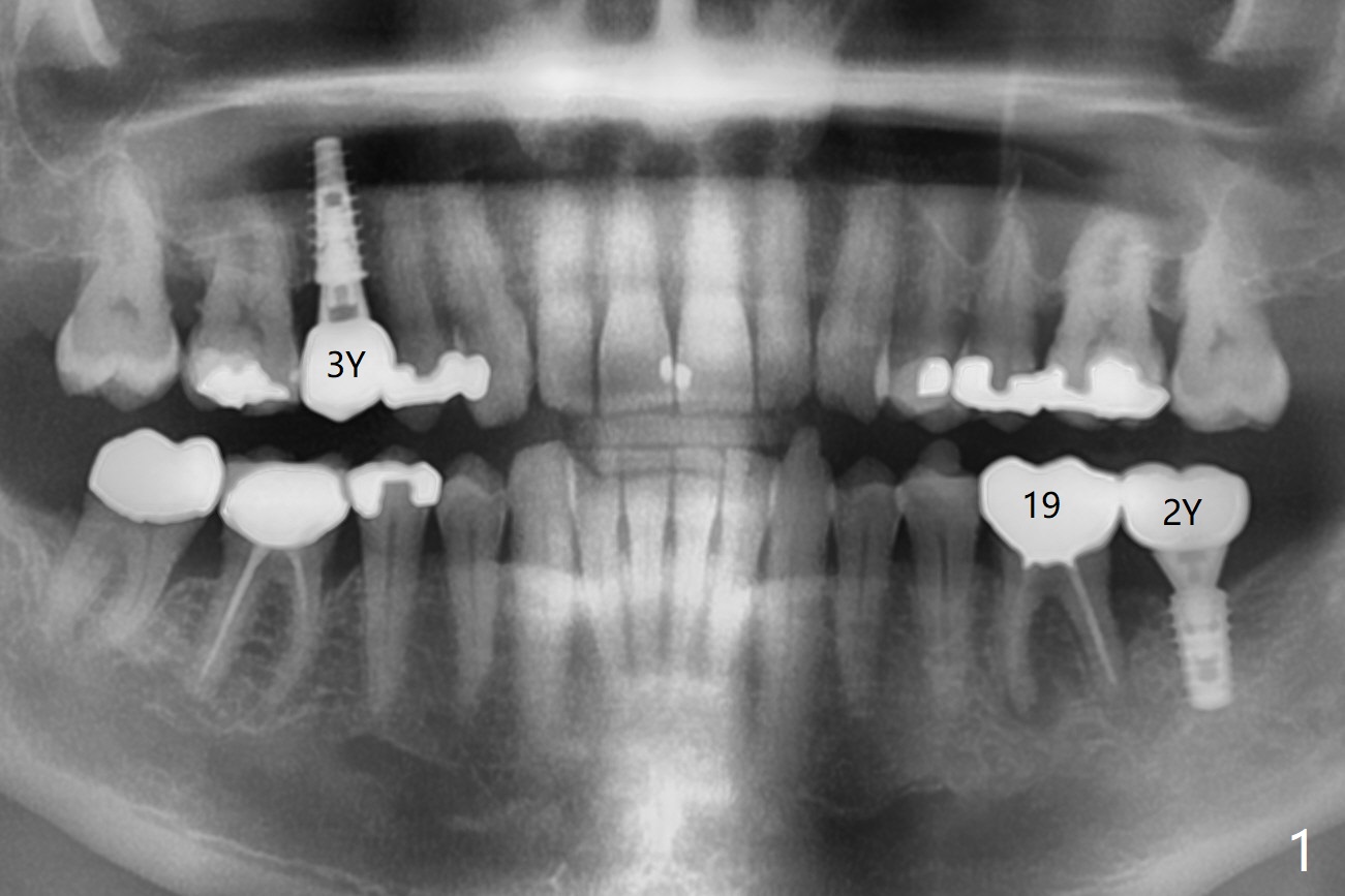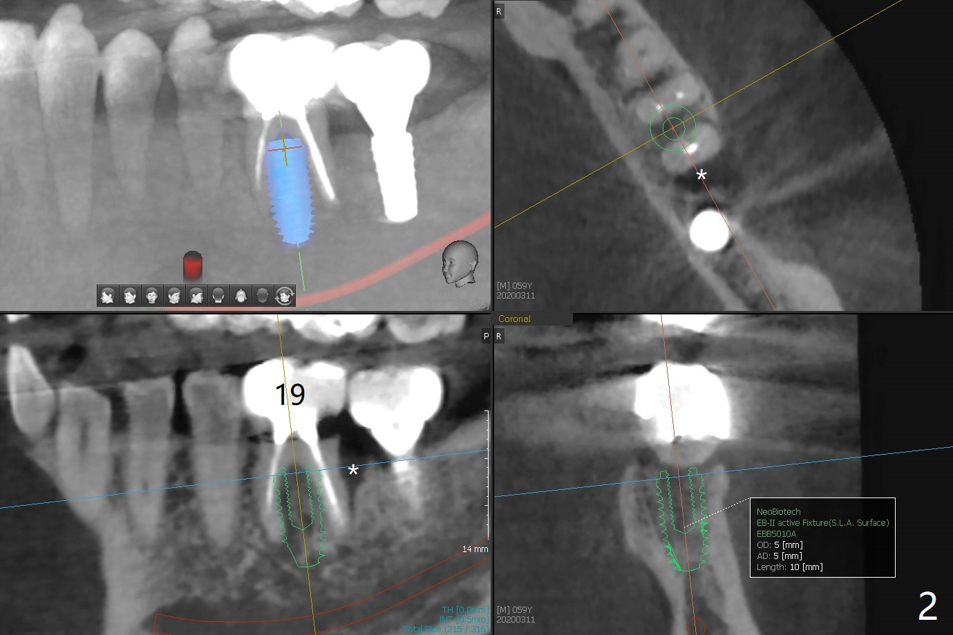 A 59-year-old man returns from endo-dontist office with diagnosis of "root fracture" of #19 (Fig.1). The distal pockets are 5 mm deep with tender-ness, associated with bone loss (Fig.2 *). Imme-diately post immediate implant placement, PRF or GEM21S mixed with cortical allograft will be used for bone regeneration. Prior to bone graft, place an abutment, take a PA and make sure that the abutments at #18 and 19 are completely seated. Reseat or trim the crestal bone if needed. Prepare bleach gauze. PRF will be used for sticky bone, which is more retentive than allograft hydrated with GEM21S.