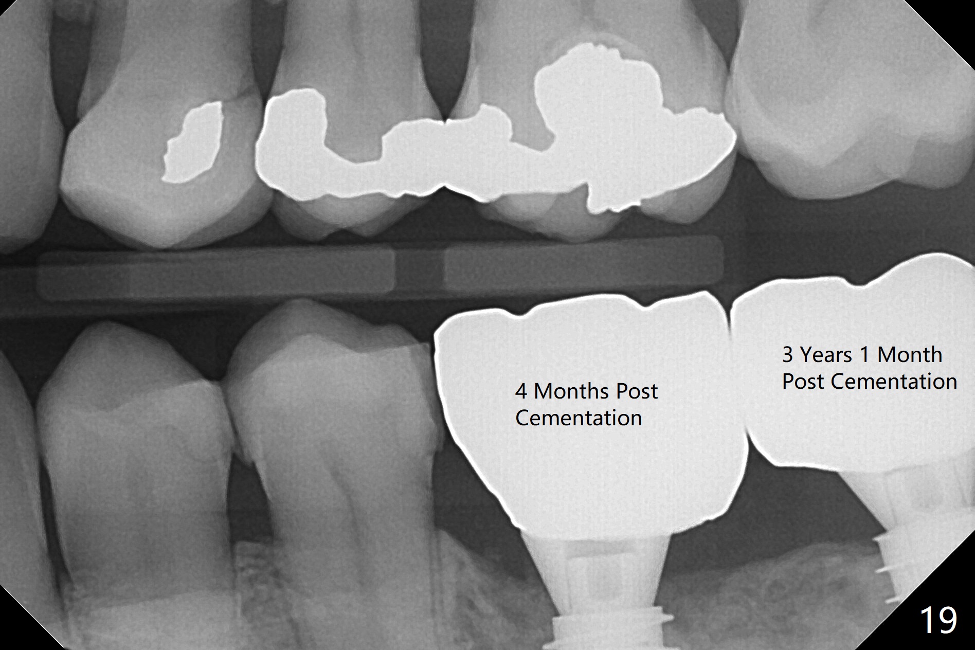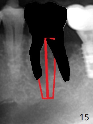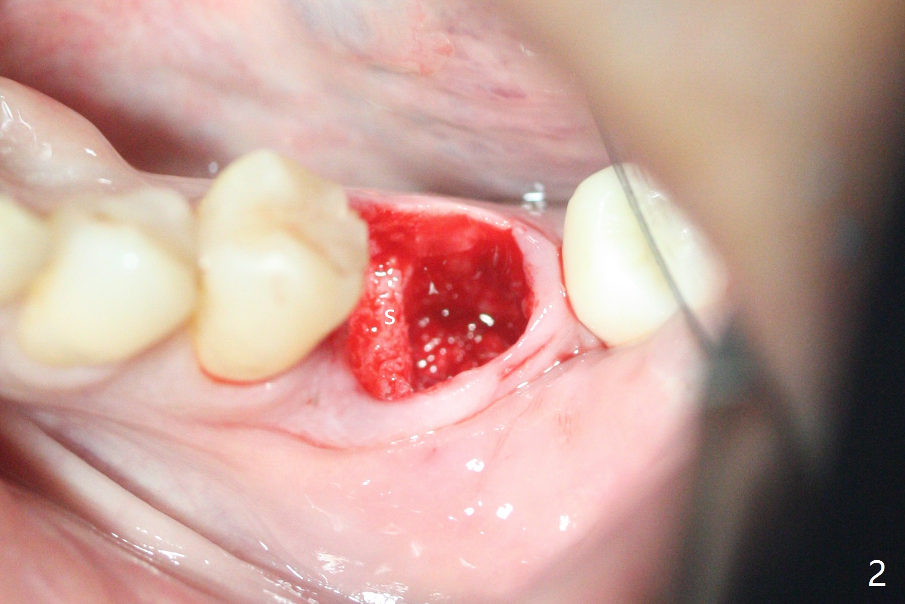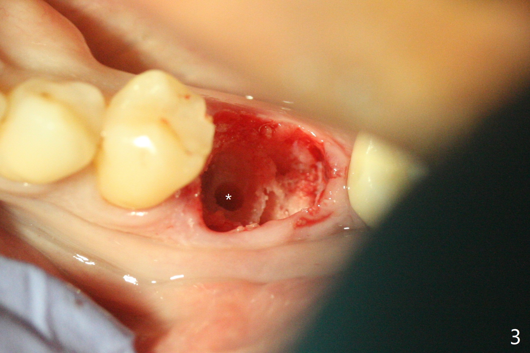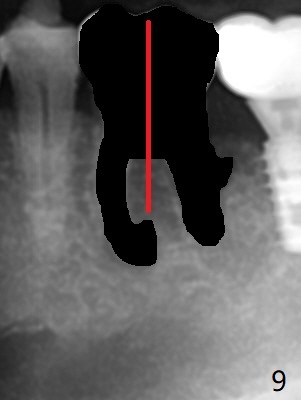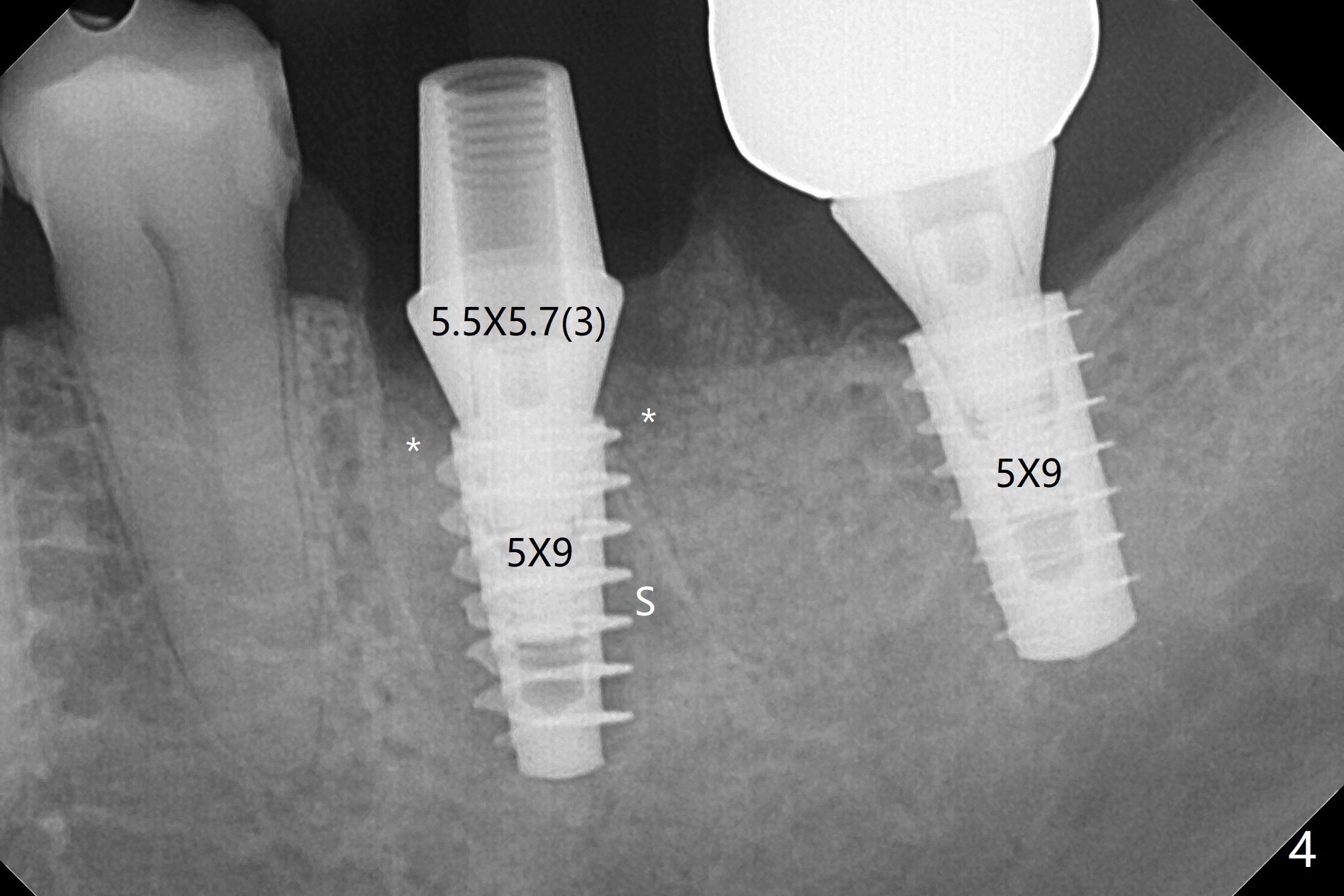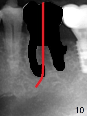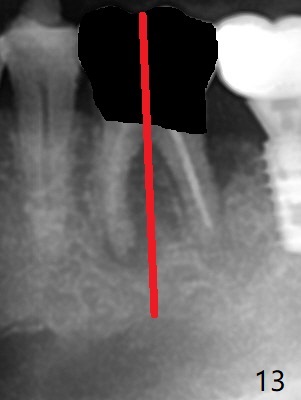 Venopuncture is conducted (Fig.1) for PRF and sticky bone (cortical chip and .5 cc ß-TCP). After use of proximators at #19, cowhorn forceps are applied, resulting in metal crown dislodgement. Since there is distal bone loss, distal socket sheath is contemplated. The tooth is sectioned. When an elevator is inserted between the roots, the distal root is loosened first. The 2 roots are removed, revealing a rounded end septum (Fig.2 S) and a larger distal socket. To avoid osteotomy deviation over the septum, a 12 mm bone trimmer is used, followed by point drill (Fig.3 *). But the lower half of the implant is deviated mesial (Fig.4) with decreased torque (~ 10 Ncm). To overcome this misfortune, the roots should not be removed until osteotomy is finished. Dual zones of bone graft is conducted. Sticky bone is placed until the plateau of the implant with a healing screw in place (Fig.4 * (bone zone)). After placement of a pair abutment, the same bone graft is packed until the margin of the abutment (Fig.5 * (soft tissue zone)). An immediate provisional is fabricated to close the socket with a piece of PRF as well. Fig.6-11 explains why the lower half of the implant deviates to the mesial socket, while Fig.12-16 illustrates how to prevent the deviation. After extraction of #19 (Fig.6,7), the crest of the septum is flattened (Fig.8 arrowhead) to prevent the initial deviation (Fig.9 red line). When a drill reaches a space (a socket, mesial in this case), the drill is deflected to the least resistant area (Fig.10 a bent red line), leading to the implant deviation apically (Fig.11 green). To prevent the apical deviation, therefore, the roots of the affected tooth is temporarily not removed (Fig.12). The osteotomy should not deviates with surgical guide because of similar density between the tooth and the bone (Fig.13). When the osteotomy is finished (Fig.14), the roots are extracted (Fig.15). The implant to be placed should not have deviation (Fig.16 green). The papillae are maintained by the immediate provisional 11 days postop (Fig.17). The incompletely seated abutment at #18 (Fig.5 <) is reseated completely 6 months postop (Fig.18). Crestal bone forms distal to #19 implant. There is no bone loss 4 months and 3 years 1 month post cementation at #19 and 18, respectively (Fig.19,20).