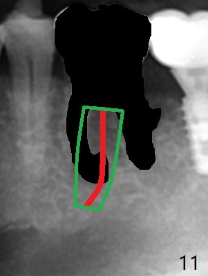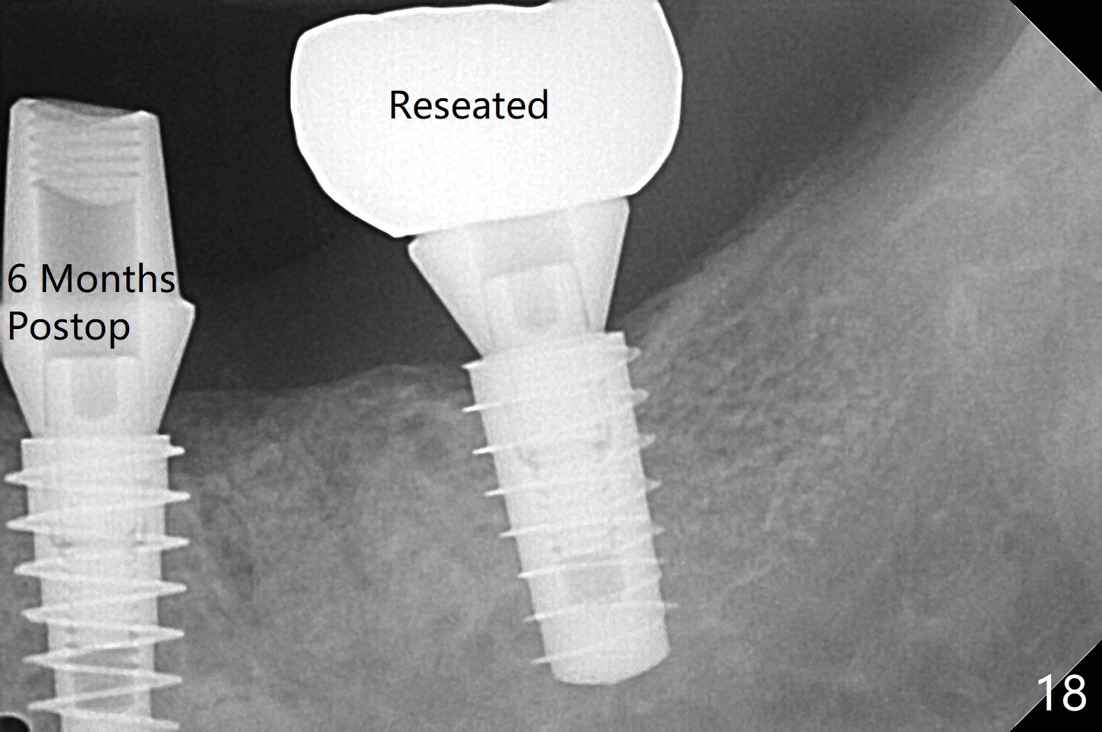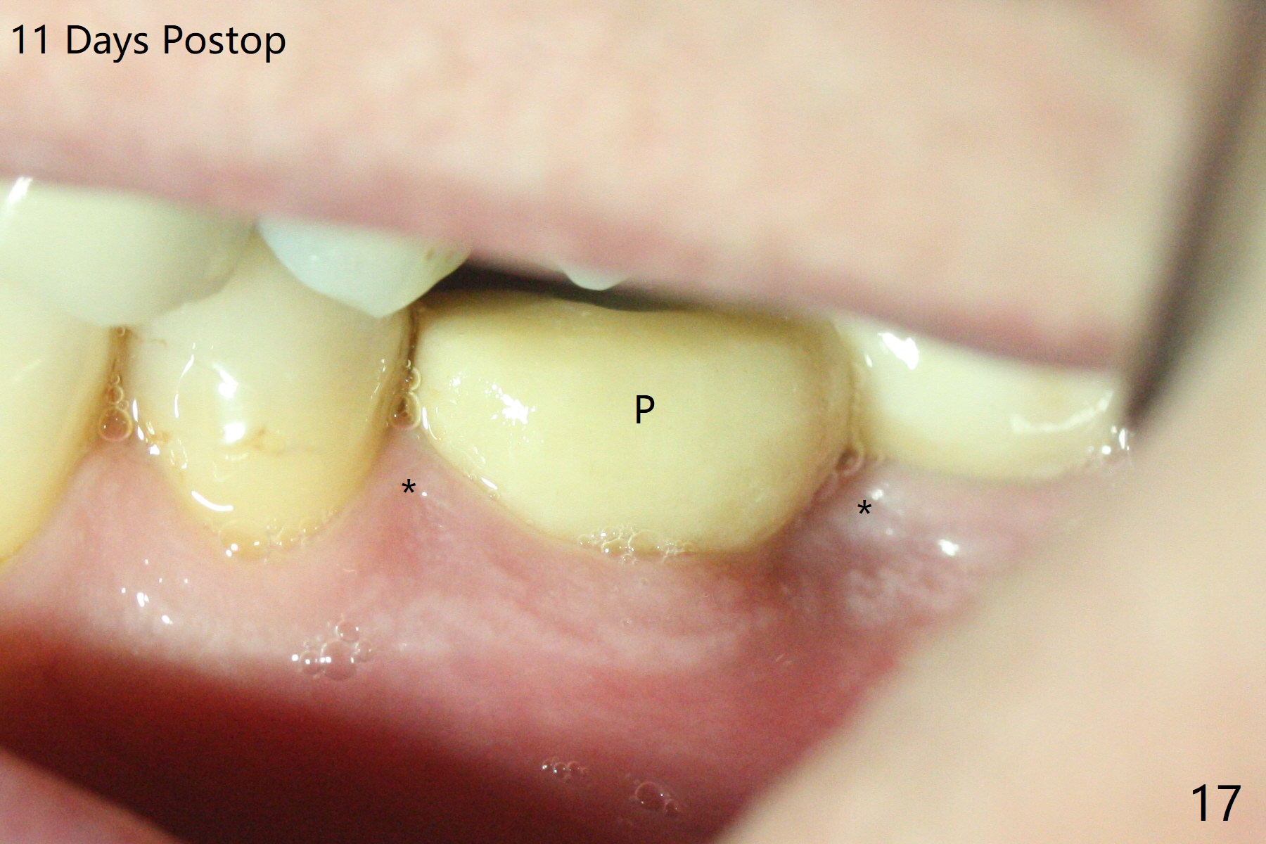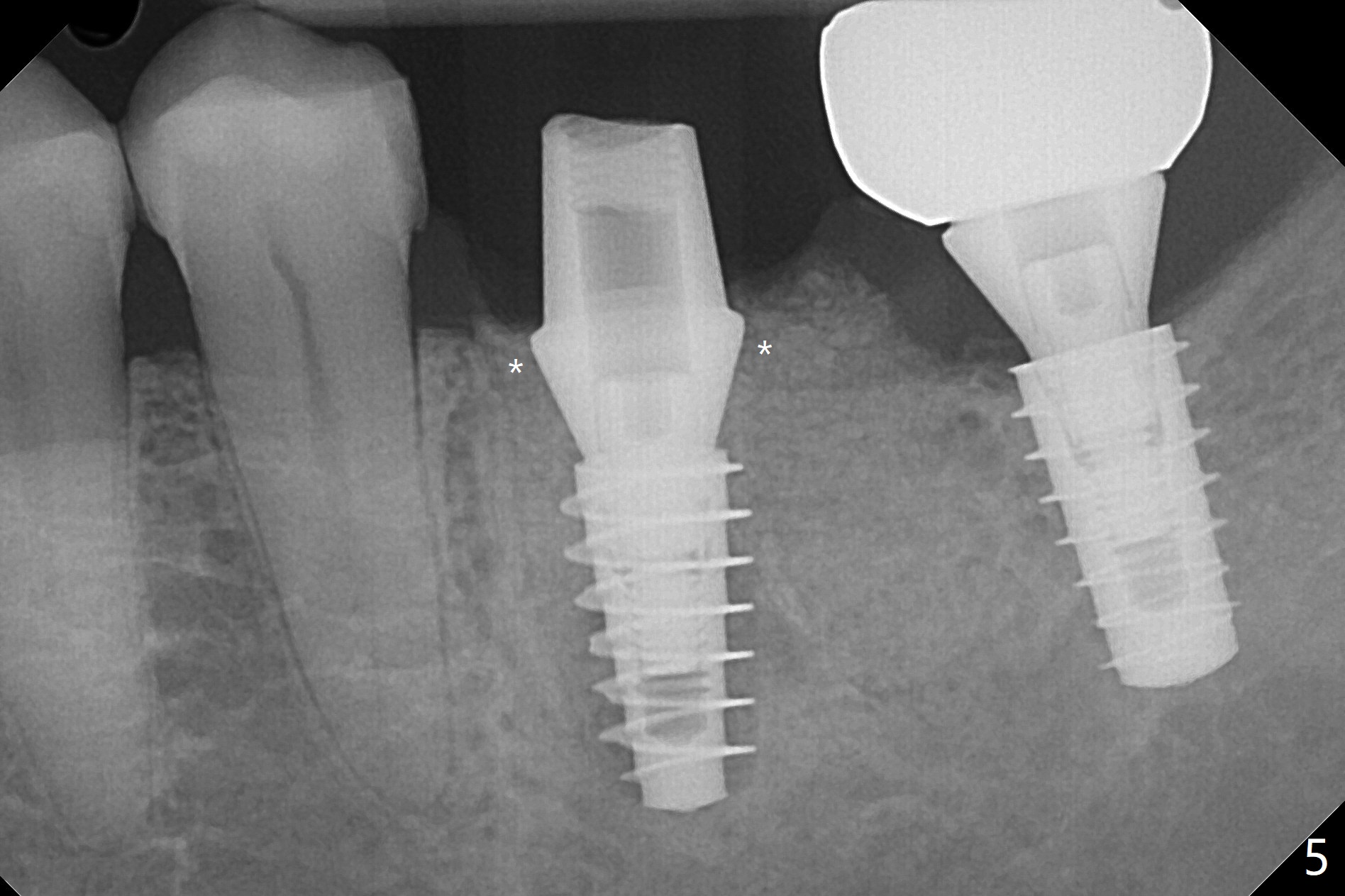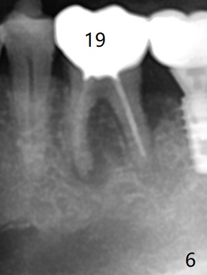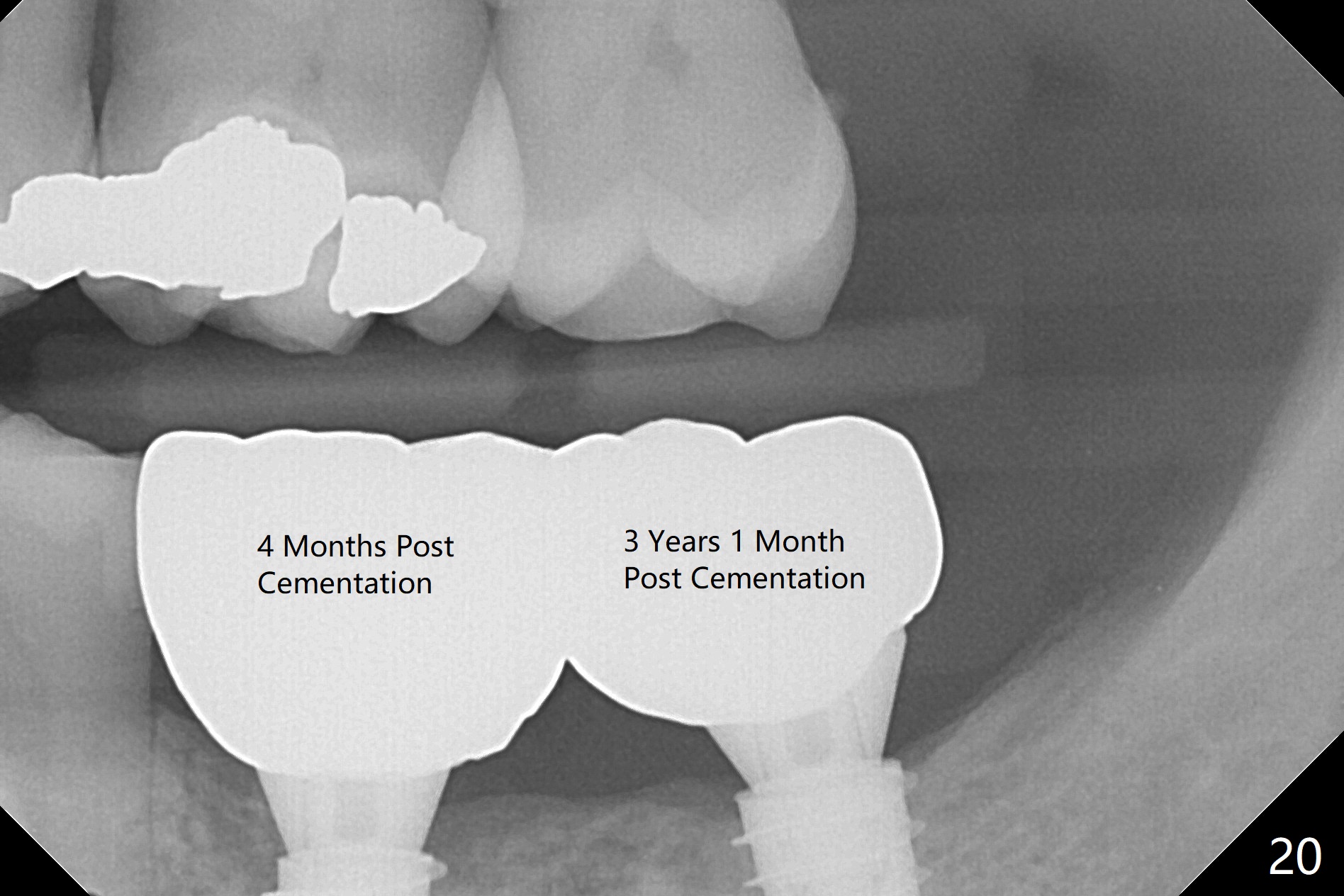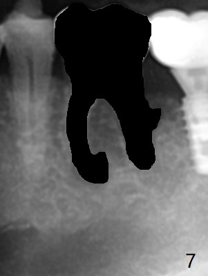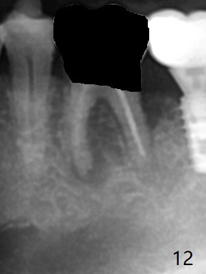 Venopuncture is conducted (Fig.1) for PRF and sticky bone (cortical chip and .5 cc ß-TCP). After use of proximators at #19, cowhorn forceps are applied, resulting in metal crown dislodgement. Since there is distal bone loss, distal socket sheath is contemplated. The tooth is sectioned. When an elevator is inserted between the roots, the distal root is loosened first. The 2 roots are removed, revealing a rounded end septum (Fig.2 S) and a larger distal socket. To avoid osteotomy deviation over the septum, a 12 mm bone trimmer is used, followed by point drill (Fig.3 *). But the lower half of the implant is deviated mesial (Fig.4) with decreased torque (~ 10 Ncm). To overcome this misfortune, the roots should not be removed until osteotomy is finished. Dual zones of bone graft is conducted. Sticky bone is placed until the plateau of the implant with a healing screw in place (Fig.4 * (bone zone)). After placement of a pair abutment, the same bone graft is packed until the margin of the abutment (Fig.5 * (soft tissue zone)). An immediate provisional is fabricated to close the socket with a piece of PRF as well. Fig.6-11 explains why the lower half of the implant deviates to the mesial socket, while Fig.12-16 illustrates how to prevent the deviation. After extraction of #19 (Fig.6,7), the crest of the septum is flattened (Fig.8 arrowhead) to prevent the initial deviation (Fig.9 red line). When a drill reaches a space (a socket, mesial in this case), the drill is deflected to the least resistant area (Fig.10 a bent red line), leading to the implant deviation apically (Fig.11 green). To prevent the apical deviation, therefore, the roots of the affected tooth is temporarily not removed (Fig.12). The osteotomy should not deviates with surgical guide because of similar density between the tooth and the bone (Fig.13). When the osteotomy is finished (Fig.14), the roots are extracted (Fig.15). The implant to be placed should not have deviation (Fig.16 green). The papillae are maintained by the immediate provisional 11 days postop (Fig.17). The incompletely seated abutment at #18 (Fig.5 <) is reseated completely 6 months postop (Fig.18). Crestal bone forms distal to #19 implant. There is no bone loss 4 months and 3 years 1 month post cementation at #19 and 18, respectively (Fig.19,20).