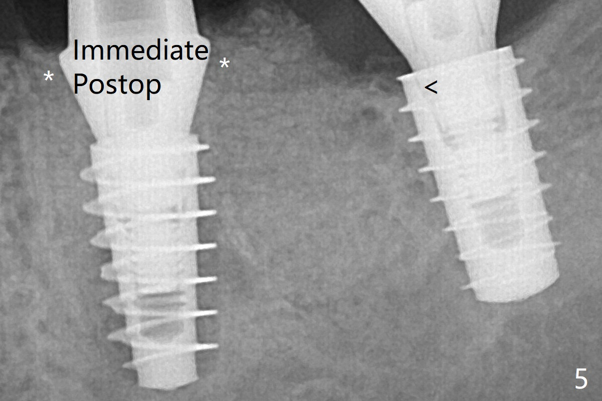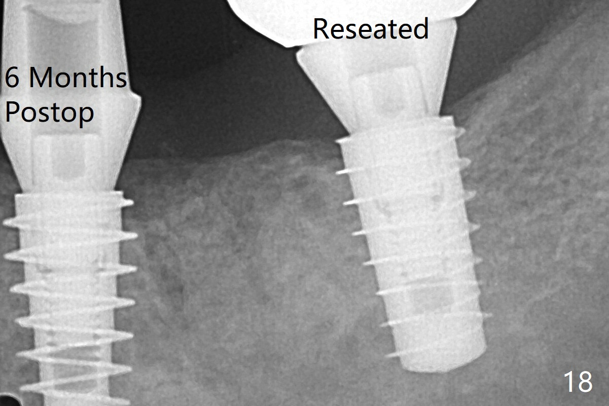 The incompletely seated abutment at #18 (Fig.5 <) is reseated completely 6 months postop. Crestal bone forms distal to #19 implant.