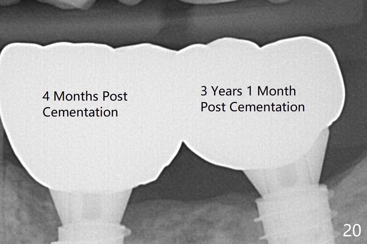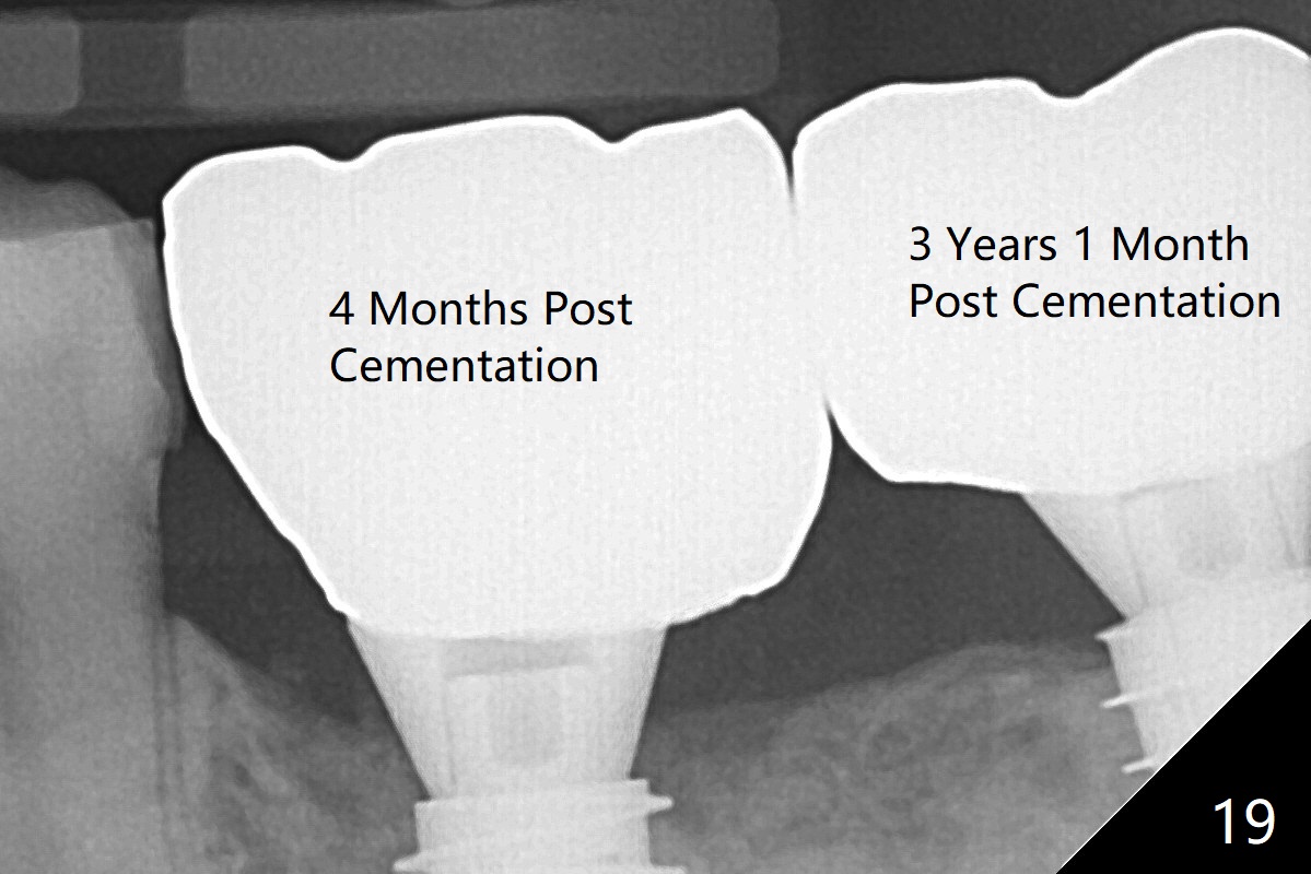 There is no bone loss 4 months and 3 years 1 month post cementation at #19 and 18, respectively (Fig.19,20).