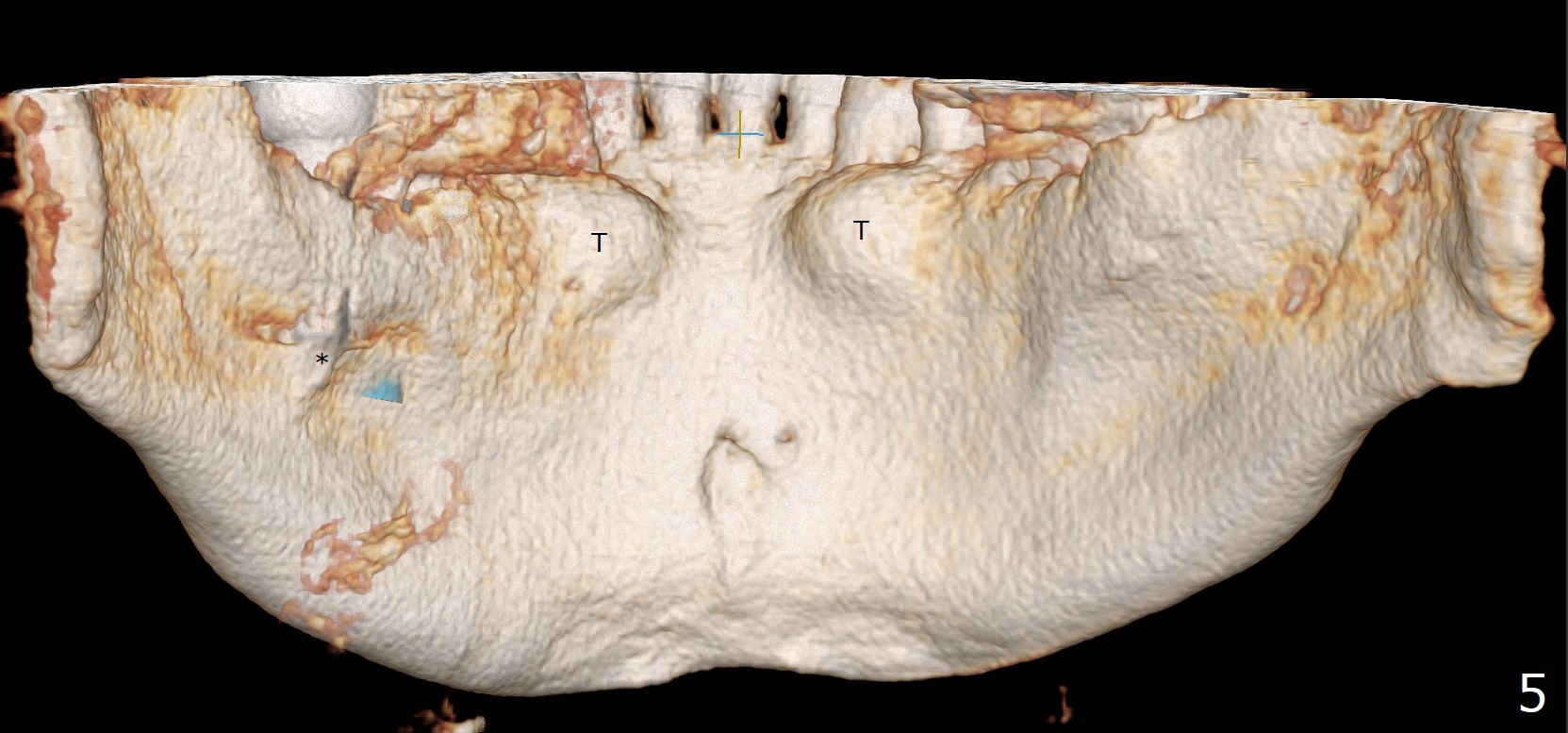 Fig.5 is a lingual view of the mandible (CT 3-D image). T: torus; *: #31 implant sticking into the submandibular fossa.