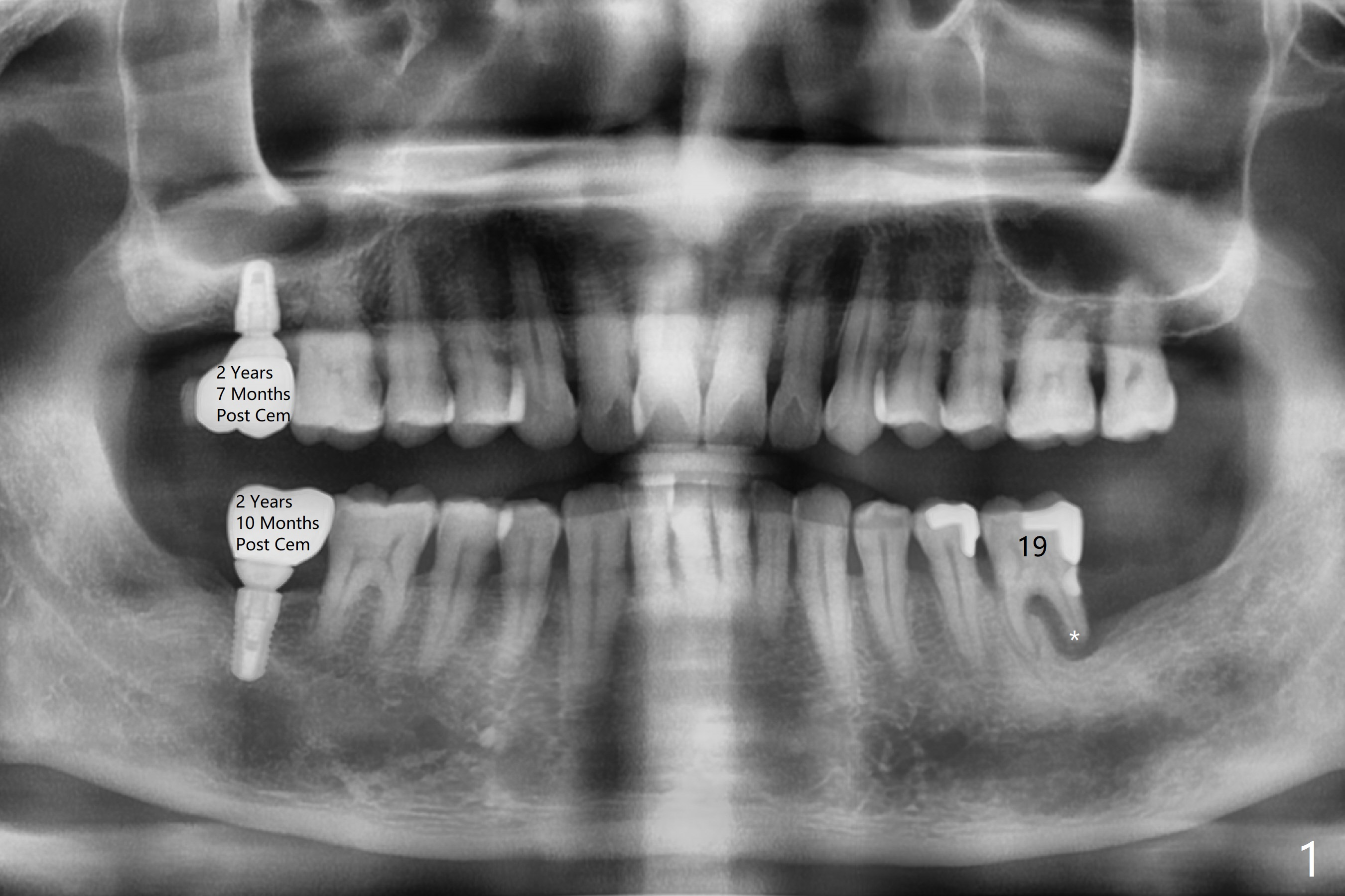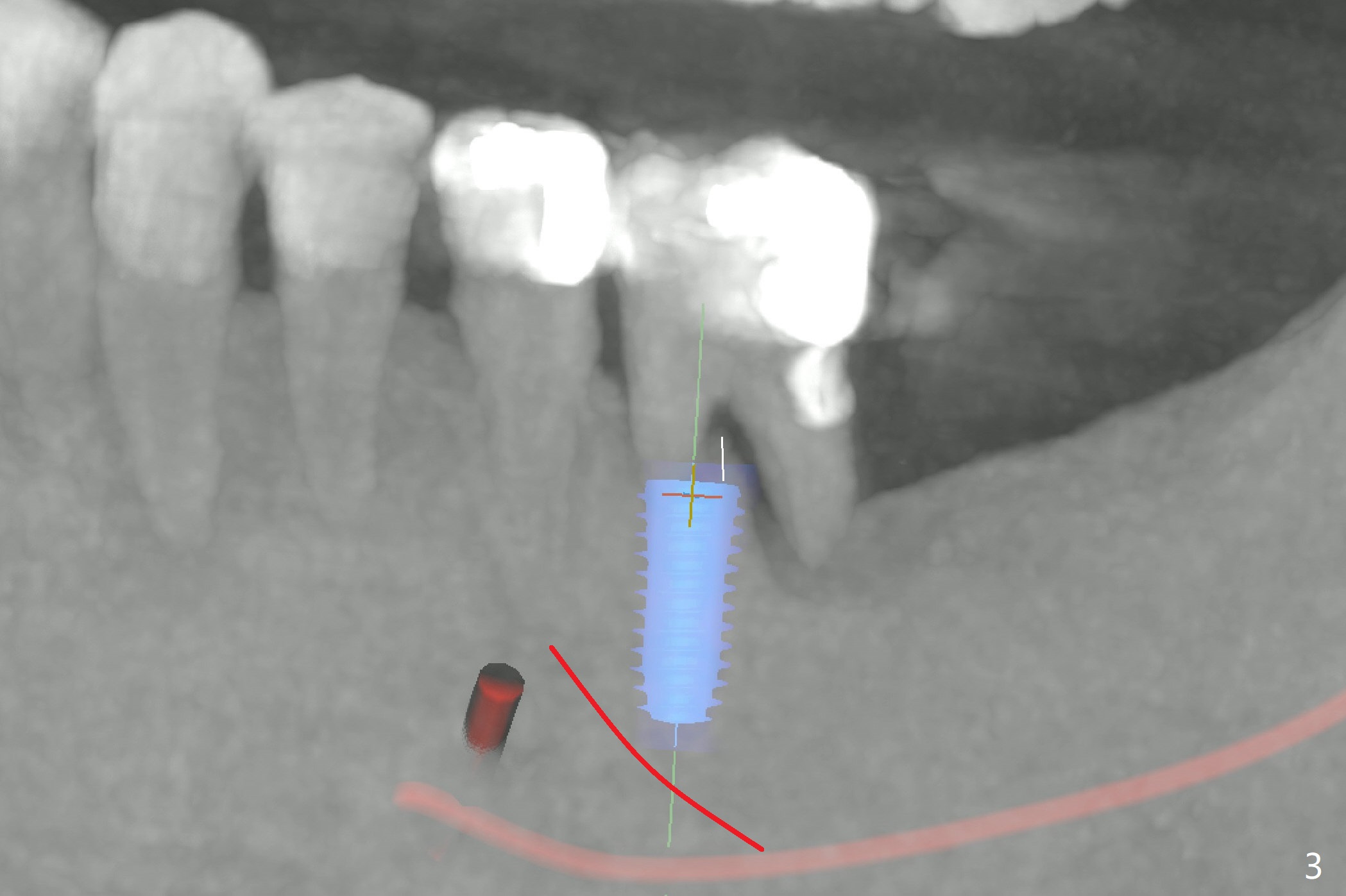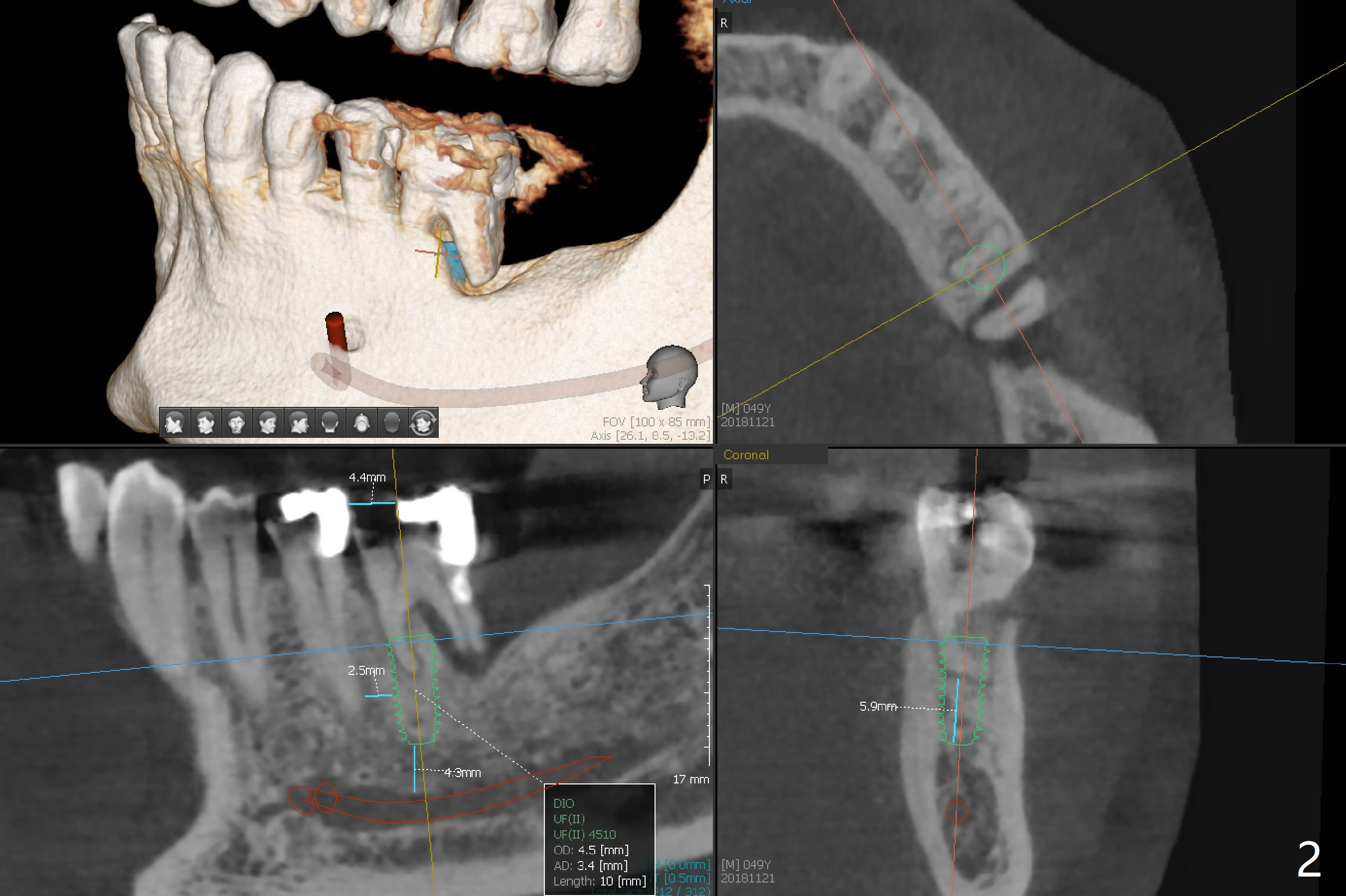 A 49-year-old man agrees to have #19 extracted for implant, 2 years 7 months and 2 years 10 months post cementation at #2 and 31, respectively (Fig.1). Because of severe bone loss in the distal socket of #19, a 4.5x10 mm implant will be placed in the mesial one (Fig.2). To reduce the chance of blockage of blood supply to the tooth #20 (Fig.3 red curved line), the implant will be not placed deep. After osteotomy with guide, a 1.5 mm longer implant will be chosen if there is extra coronal bone as shown in Fig.3 (3D image (white line)).