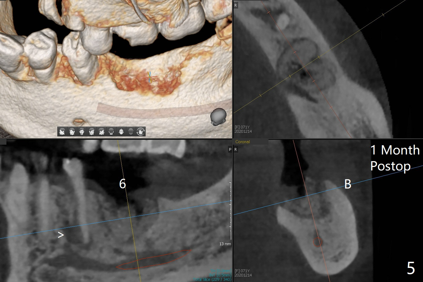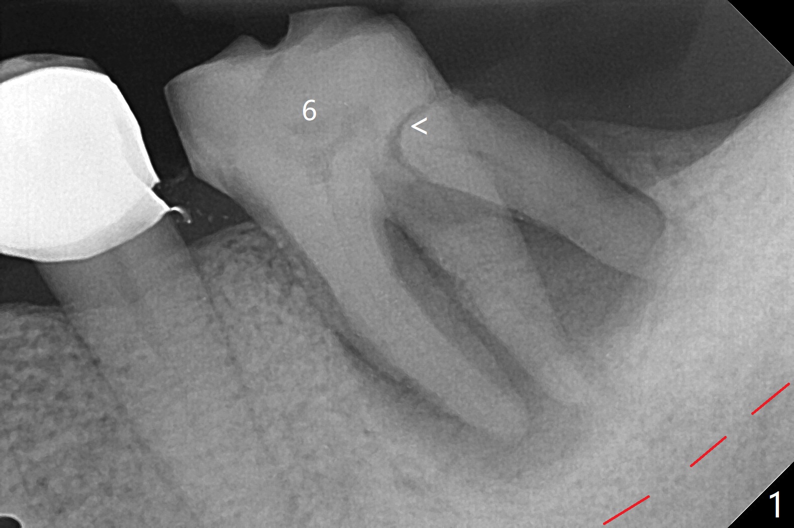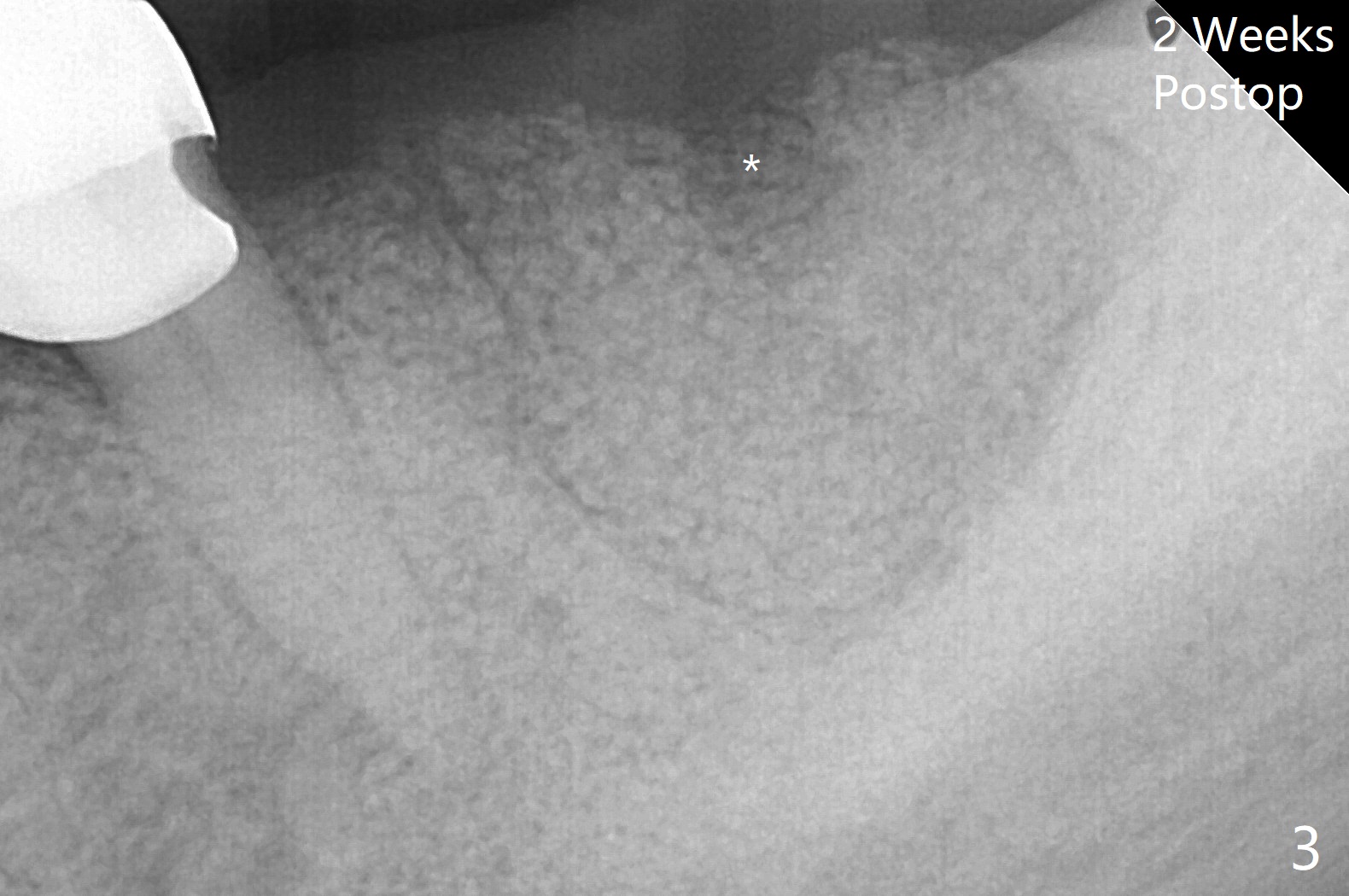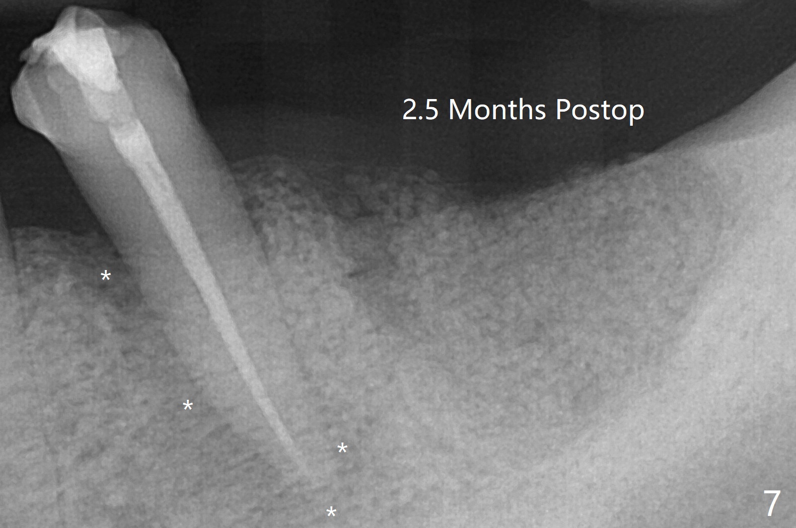当病人回来,疼痛转移到左下悬臂桥,怀疑6根分叉阴影,部分撤桥后,根尖片显示一个远中根断裂(图一:<),由于病人轻度糖尿病,边缘性骨质疏松症,严重骨质吸收,接近下齿槽神经(红线),拔除位点保存仿佛合适(图二)。中隔吸收只剩下颊侧部分(*),但是颊侧骨板存在。术后两周5疼痛,拍摄根尖片显示植骨当中密度降低(图三:*),而Cytoplast膜仍在原位。术后伤口愈合慢,可能与糖尿病有关,上前牙拔除即刻种植需要PRF。术后一个月全景片(图四),CT(图五,六)显示5根尖阴影(箭头)。完成根管治疗5根周阴影增大(图七:*),6骨粉在愈合之中。准备在残根智齿(图八)做临时树脂修复,增加6,7导板稳定性。Return to No Caries Xin Wei, DDS, PhD, MS 1st edition 11/16/2020, last revision 03/25/2021