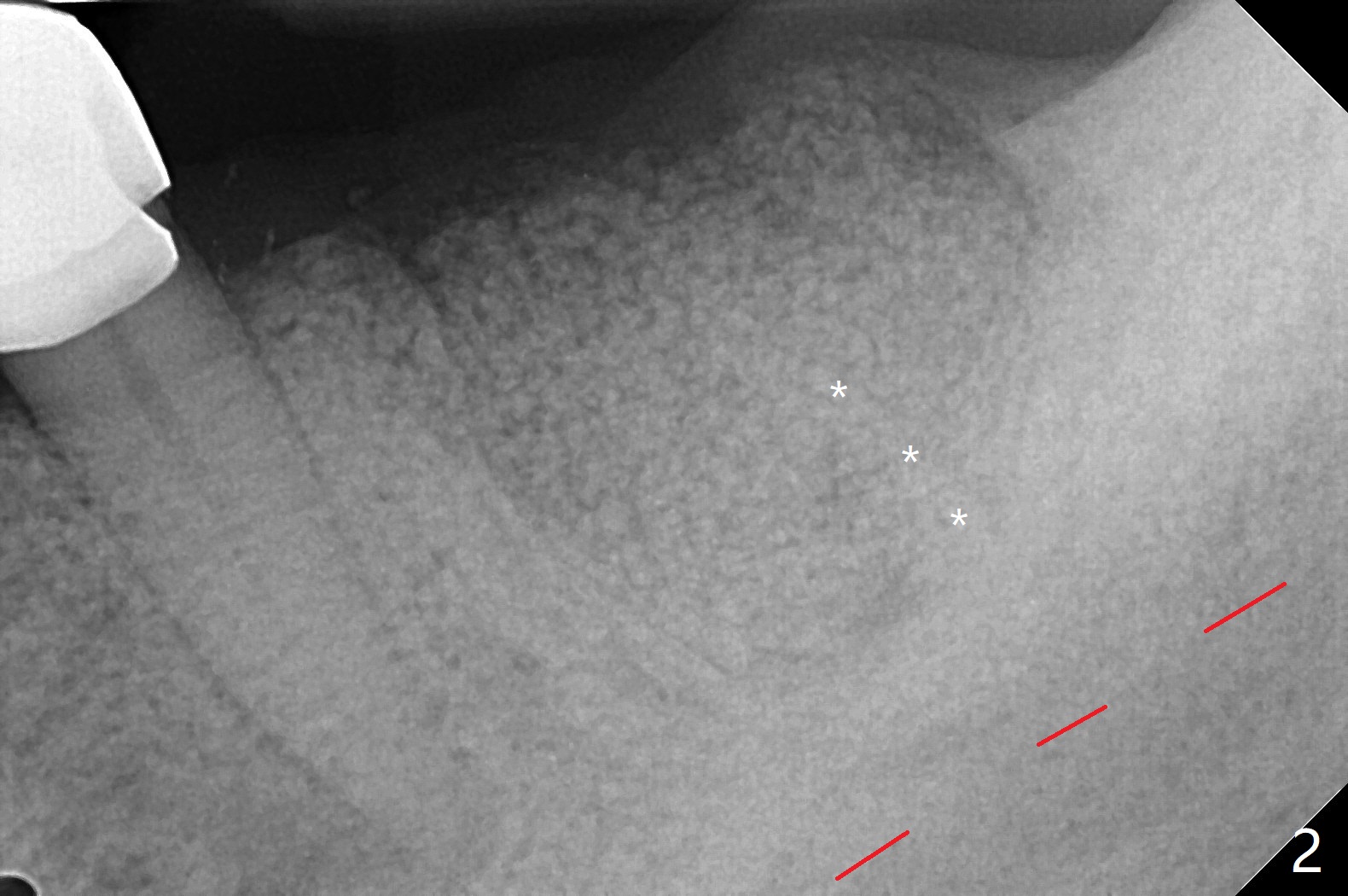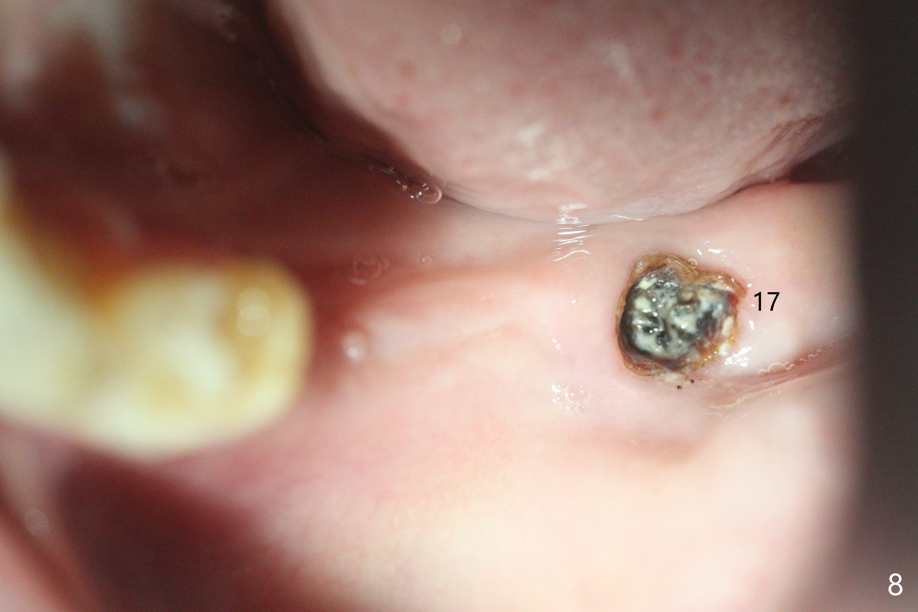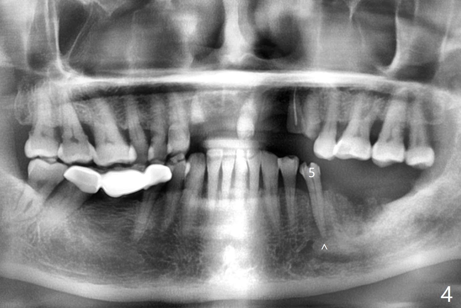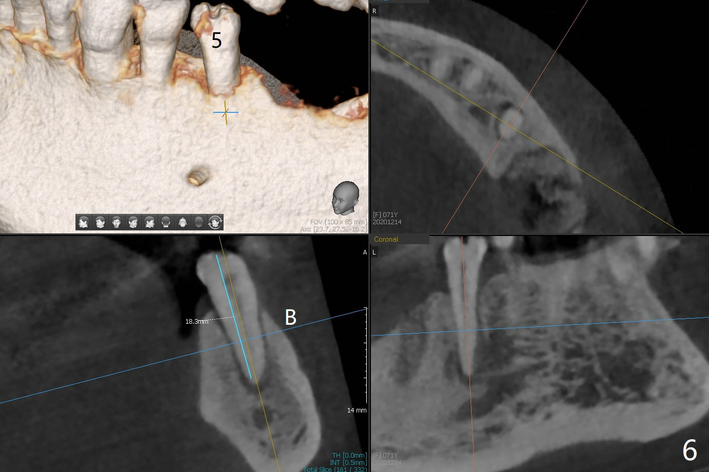 当病人回来,疼痛转移到左下悬臂桥,怀疑6根分叉阴影,部分撤桥后,根尖片显示一个远中根断裂(图一:<),由于病人轻度糖尿病,边缘性骨质疏松症,严重骨质吸收,接近下齿槽神经(红线),拔除位点保存仿佛合适(图二)。中隔吸收只剩下颊侧部分(*),但是颊侧骨板存在。术后两周5疼痛,拍摄根尖片显示植骨当中密度降低(图三:*),而Cytoplast膜仍在原位。术后伤口愈合慢,可能与糖尿病有关,上前牙拔除即刻种植需要PRF。术后一个月全景片(图四),CT(图五,六)显示5根尖阴影(箭头)。完成根管治疗5根周阴影增大(图七:*),6骨粉在愈合之中。准备在残根智齿(图八)做临时树脂修复,增加6,7导板稳定性。Return to No Caries Xin Wei, DDS, PhD, MS 1st edition 11/16/2020, last revision 03/25/2021