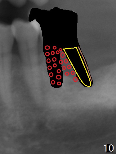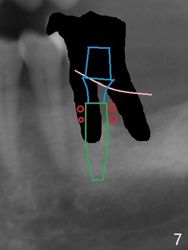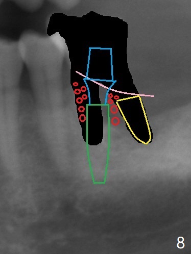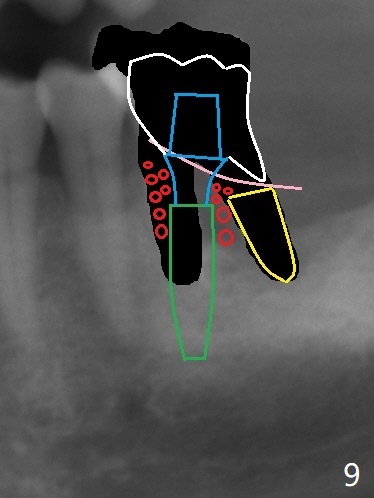After tooth extraction (Fig.4), a medium-sized implant (4.5 mm, Fig.5 green) will be placed in the mesial socket, but the coronal end of the long axis of the implant (white line) will be in the middle of the socket for future restoration. The gingival margin of the socket is also uneven (Fig.6 pink). Before placement of the final abutment (Fig.7 blue), pack allograft (red circles) over the exposed implant surface until the platform of the implant. After placement of Osteogen plug in the distal socket (Fig.8 yellow), more of allograft is placed coronally. An immediate provisional (Fig.9 white) is to be fabricated to keep the graft in place. If the socket is deemed to be unsuitable for immediate implant, place PRF membrane(s) distoocclusally (Fig.10 purple), followed by collagen membrane and suturing.