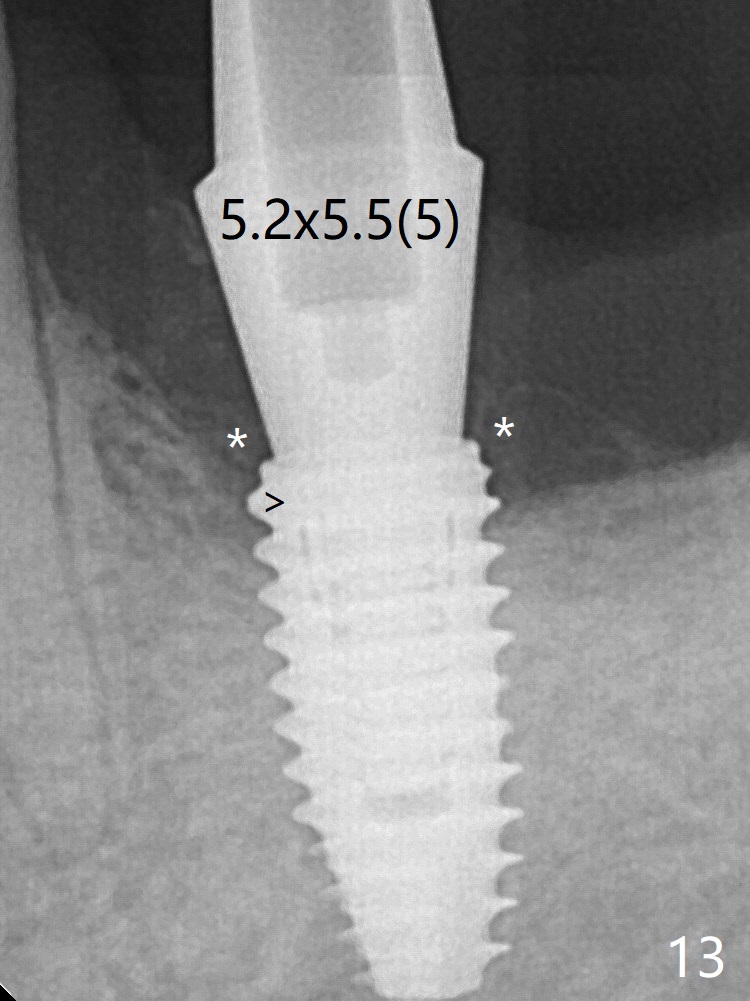 After insertion of a definitive abutment (6.5x5.5(4) mm), more allograft is placed coronally (Fig.3 *). There is no apparent thread exposure 4 months postop (Fig.10). A narrower abutment with longer cuff appears to be completely seated (without a gap, Fig.13 >), probably avoiding contact with the regenerated crestal bone (*).