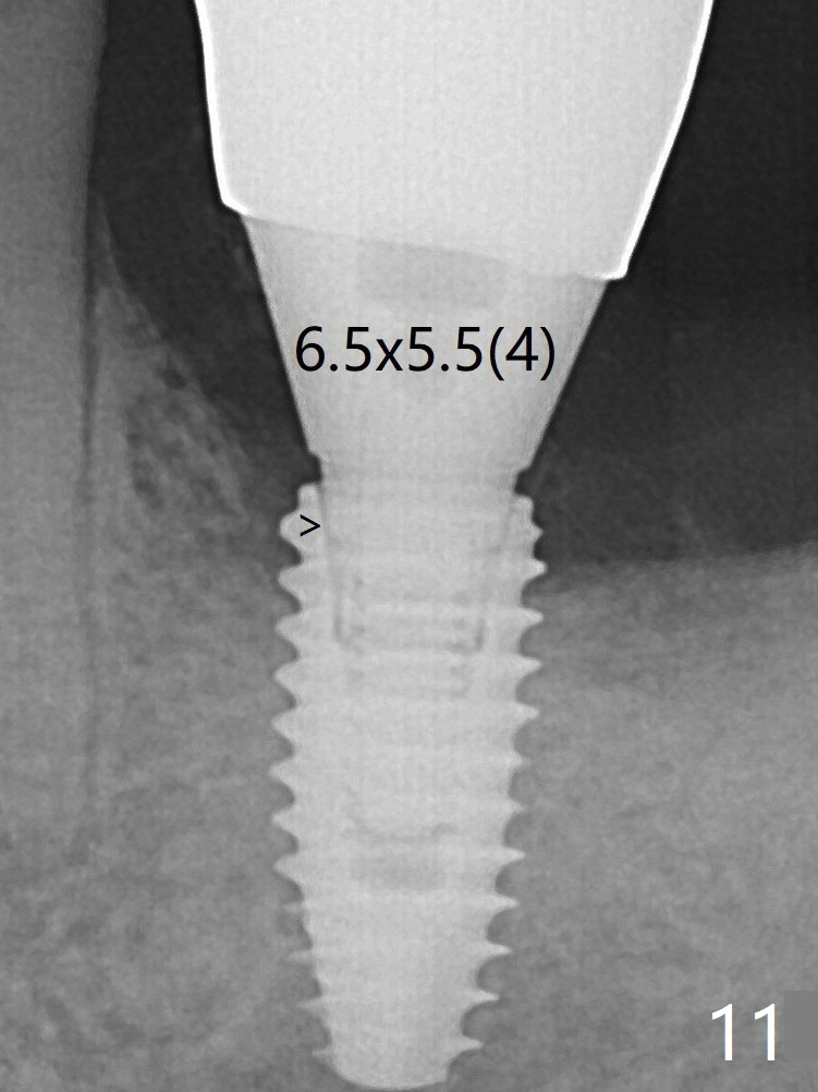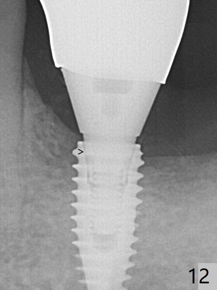 The abutment is loose 4 months post cementation, probably related to unfavorable crown/implant ratio; but when the abutment is retightened, there is a gap between it and the implant (Fig. 11 >). After relieving the proximal contact of the crown, the abutment is retightened one more time with the same gap (Fig.12 >). In fact the latter is present previously. A narrower abutment with longer cuff appears to be completely seated, probably avoiding contact with the regenerated crestal bone (Fig.13 *). If the new crown gets loose, bury a driver inside the abutment.