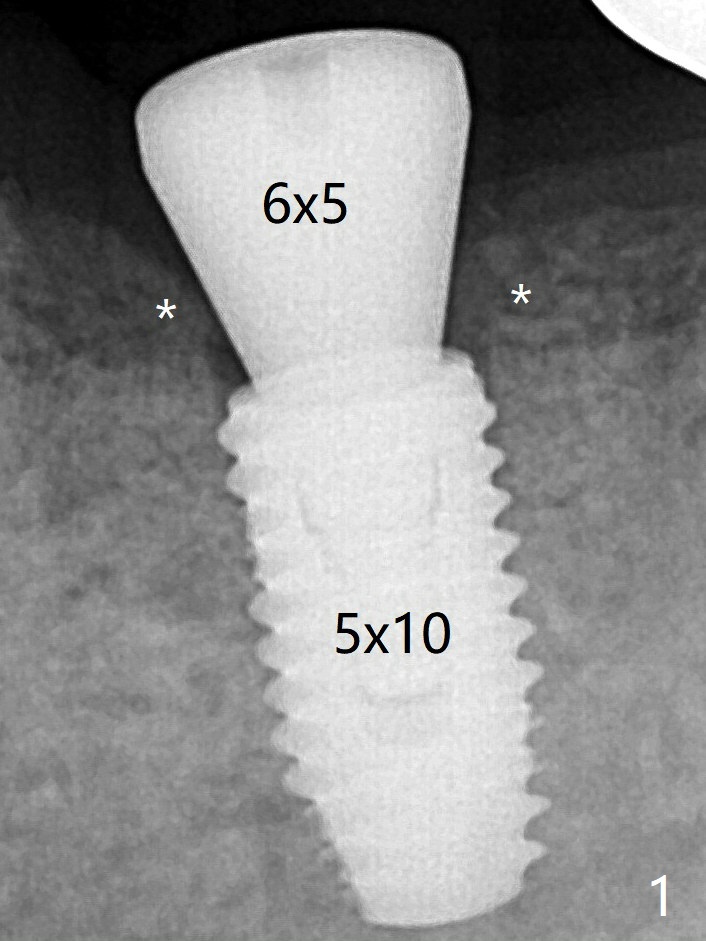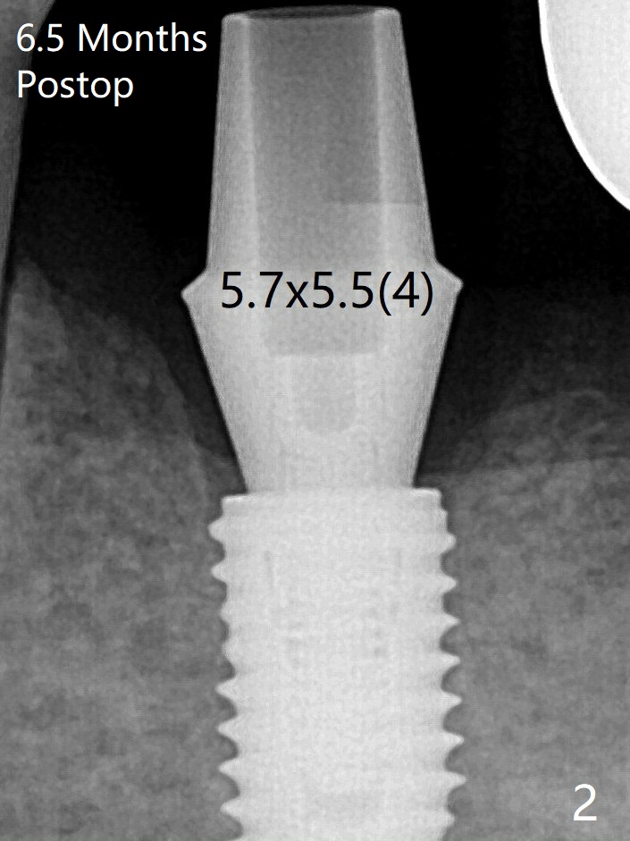 虽然愈合基台似乎完全就位,但是接近近中,远中牙槽嵴(图一:*),去除后,使用6毫米profile钻头,再次放置。术后病人没有任何不适。术后6.5月,基台完全就位,与没有牙槽嵴阻挡有关(图二)。骨质密度高,植入扭力高,没有造成骨质吸收。