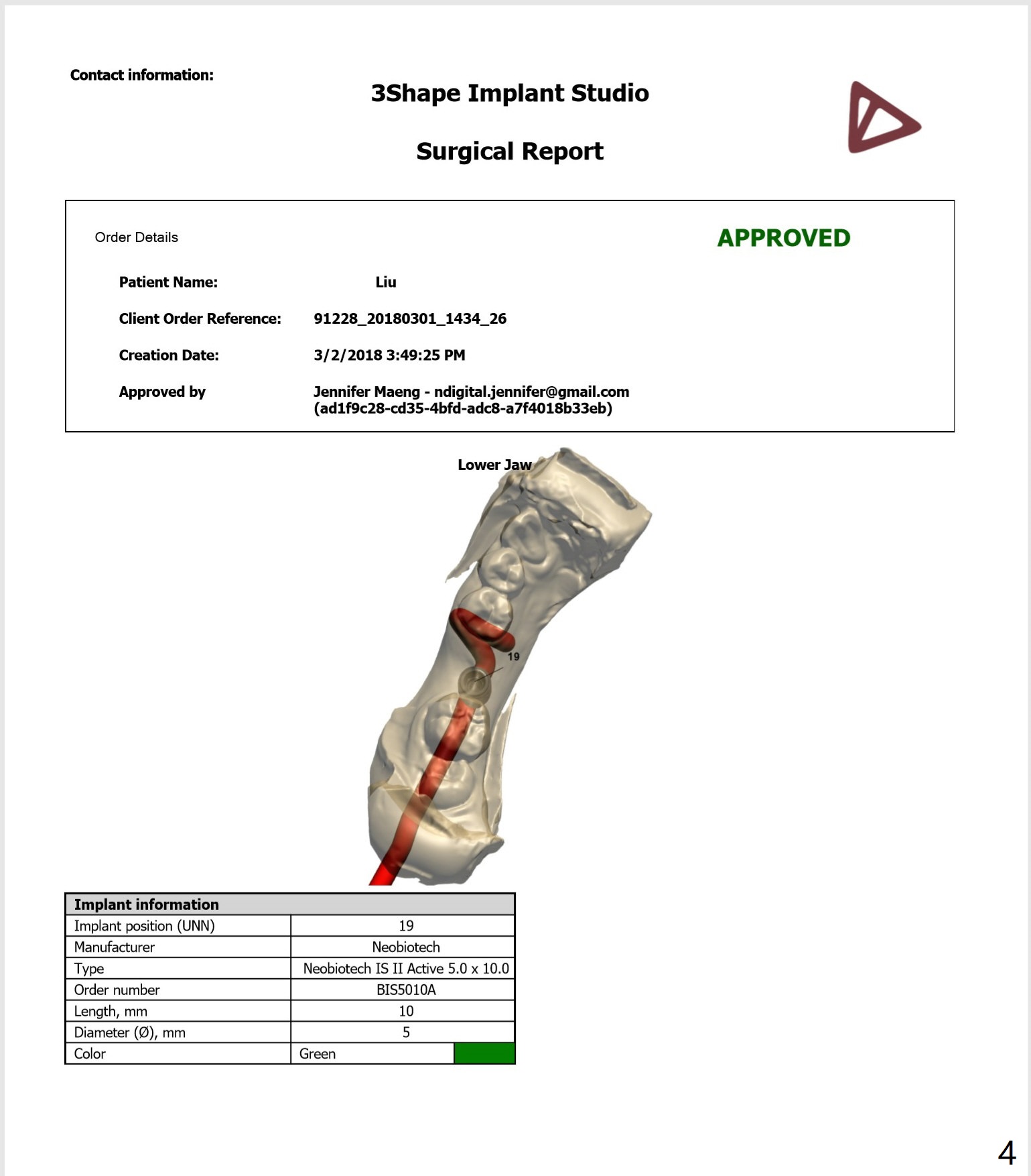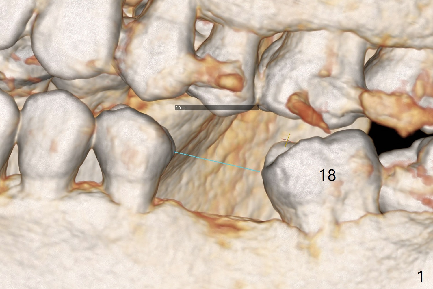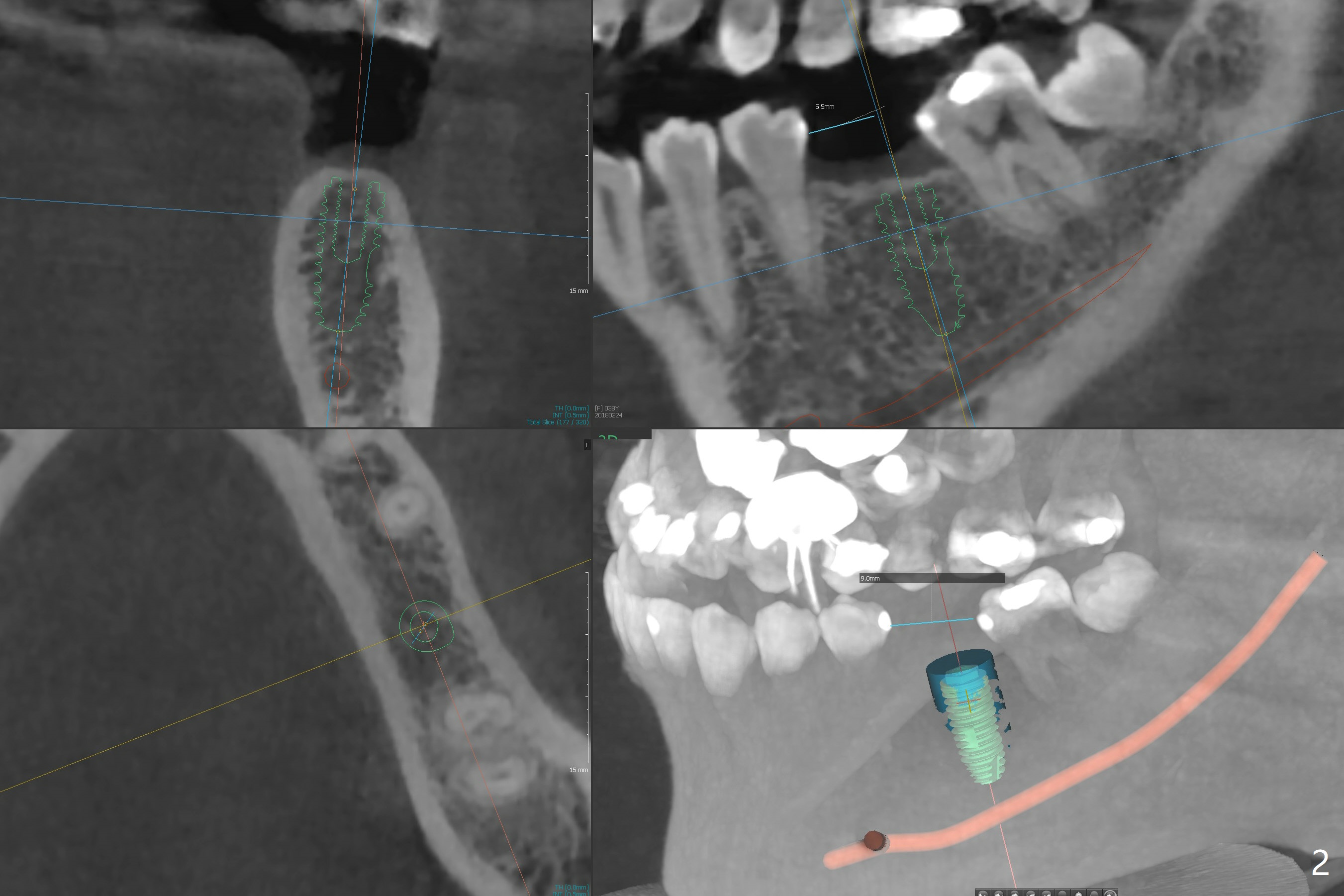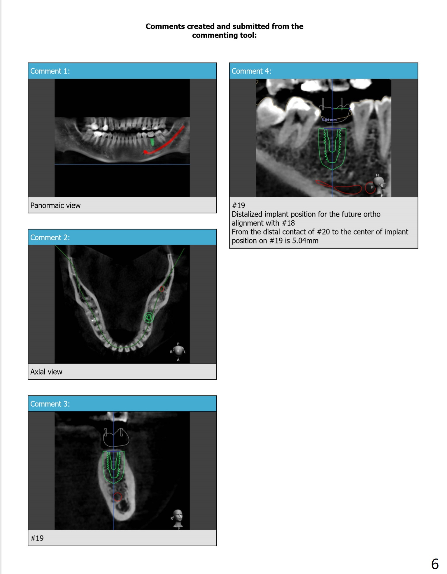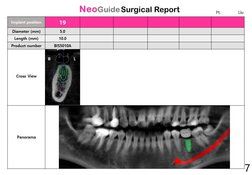 A 38-year-old woman requests implant restoration at #19. The mesiodistal width of the edentulous area is 9 mm (Fig.1) with the tooth #18 mesial shift and inclination. Place an implant (5x11.5 mm) slightly distal (4.5 mm vs. 5.0-5.5 mm in Fig.2) so that the implant will be in the center of the edentulous area after postop orthodontics (uprighting the tooth #18). Also place the implant slightly more lingually (upper left image). Reports from lab are shown in Fig.3-7.