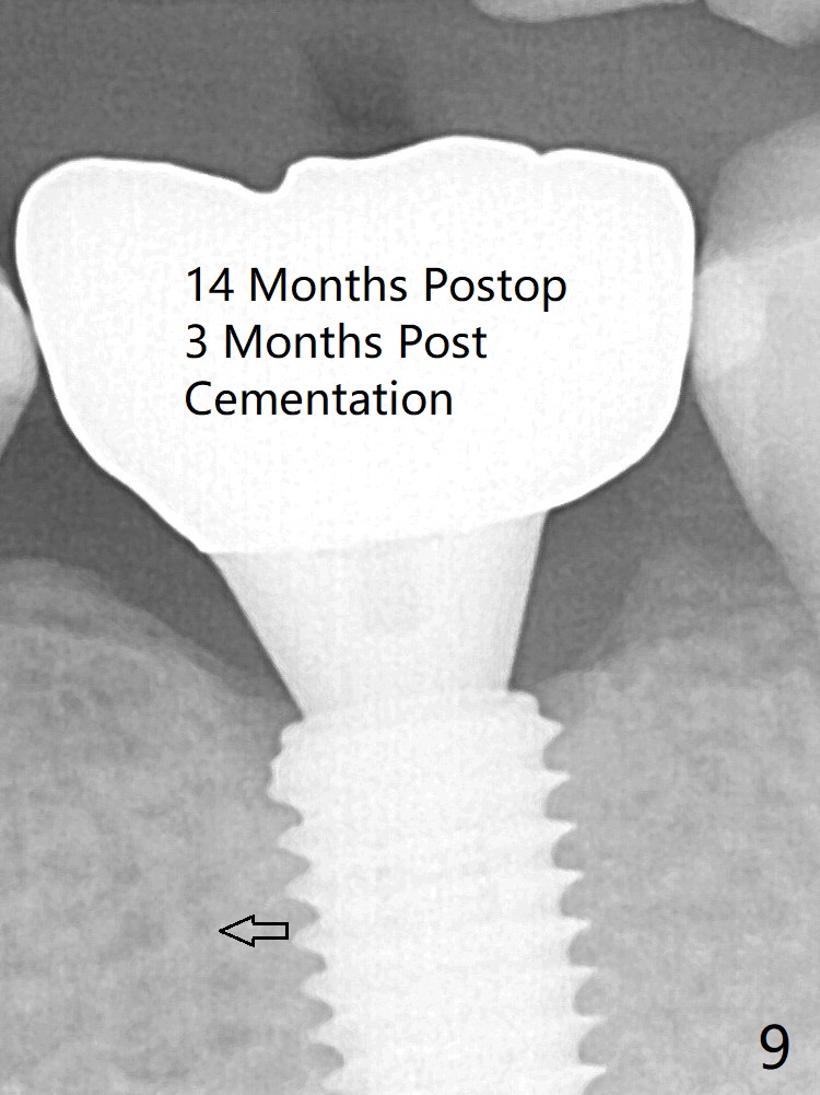 A 5x10 mm implant is intentionally placed distal at #19 using guided surgery (Fig.1). When it is osteointegrated, it will be used as an anchorage to upright the tooth #18 orthodontically. In fact the implant is mistakenly placed 1.5 mm deeper than planned without significant side effect (paresthesia). The healing abutment dislodges (probably as related to deep placement of the implant) 20 days postop and is retightened. There is mild crestal bone loss 4 months postop (Fig.2). The tooth #18 is distalized ~ 1 mm shown by X-ray, although more clinically, 2.5 months post open coil spring. The bone density around the implant, particularly mesial (Fig.6 *), increases 8 months postop, as compared to Fig.2. The width of the dense bone around the implant increases 14 months postop (3 months post cementation, Fig.9 (arrow)).