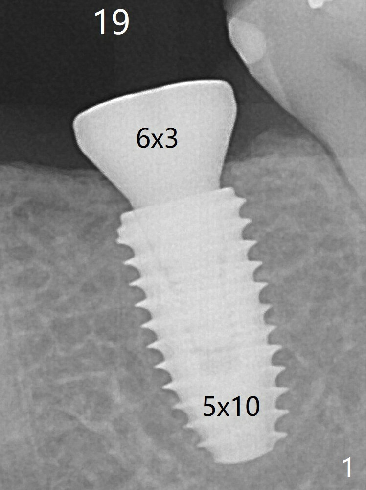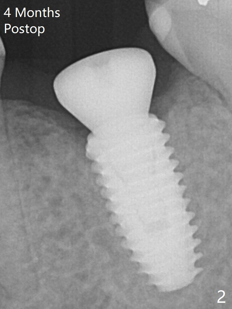 A 5x10 mm implant is intentionally placed distal at #19 using guided surgery (Fig.1). When it is osteointegrated, it will be used as an anchorage to upright the tooth #18 orthodontically. In fact the implant is mistakenly placed 1.5 mm deeper than planned without significant side effect (paresthesia). The healing abutment dislodges (probably as related to deep placement of the implant) 20 days postop and is retightened. There is mild crestal bone loss 4 months postop (Fig.2).