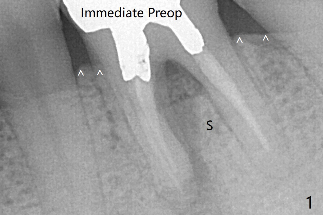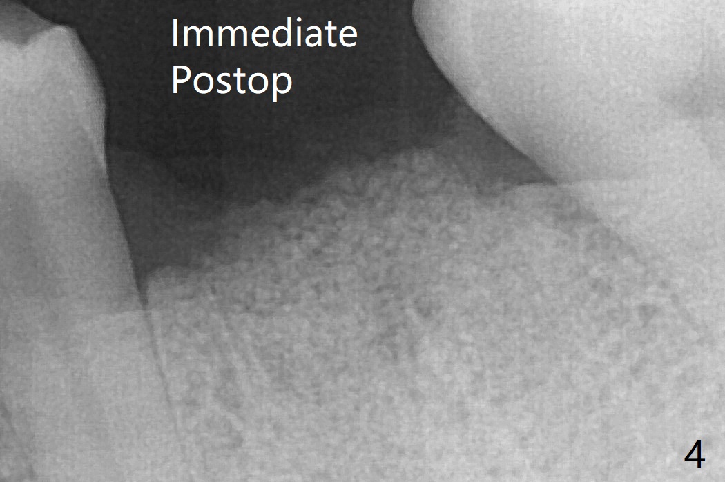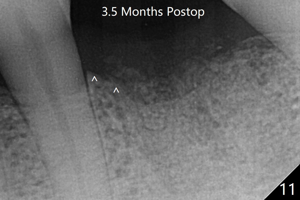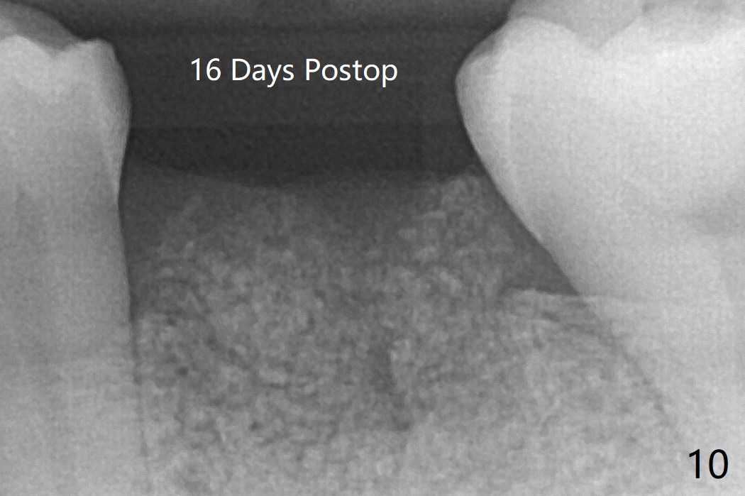 In spite of no apparent loss of bone graft (Fig.4,10), the graft seems to shrink in height 3.5 months postop (Fig.11), while the crest decreases (compare Fig.1 and 11).53岁男左下6因近中根周围阴影(图一)拔除植骨(图四)。术后16天骨粉好像没有失去(图十),但是术后3.5月骨粉仿佛收缩(图十一),牙槽嵴接近牙槽窝处下降(比较所有图)。