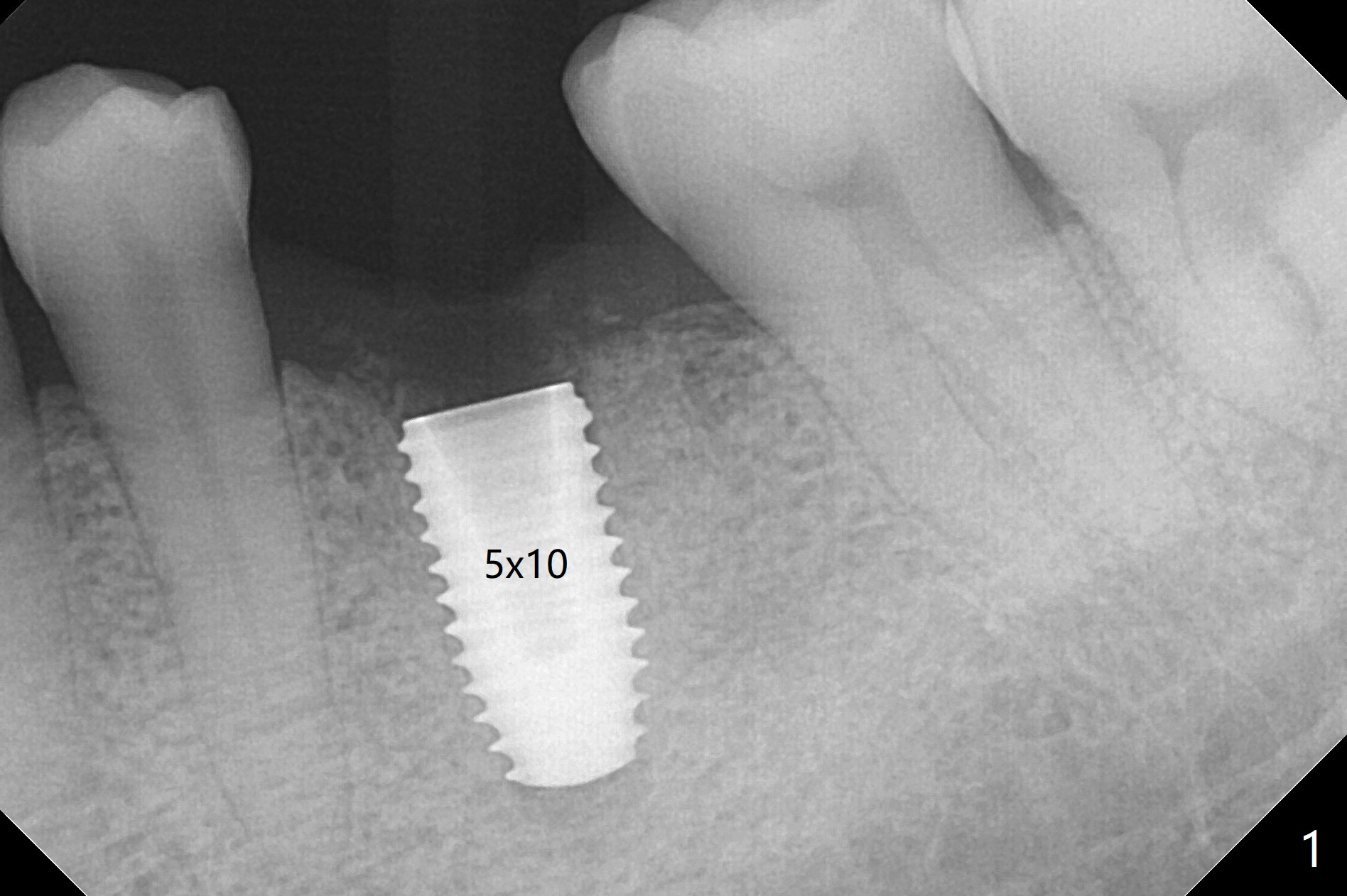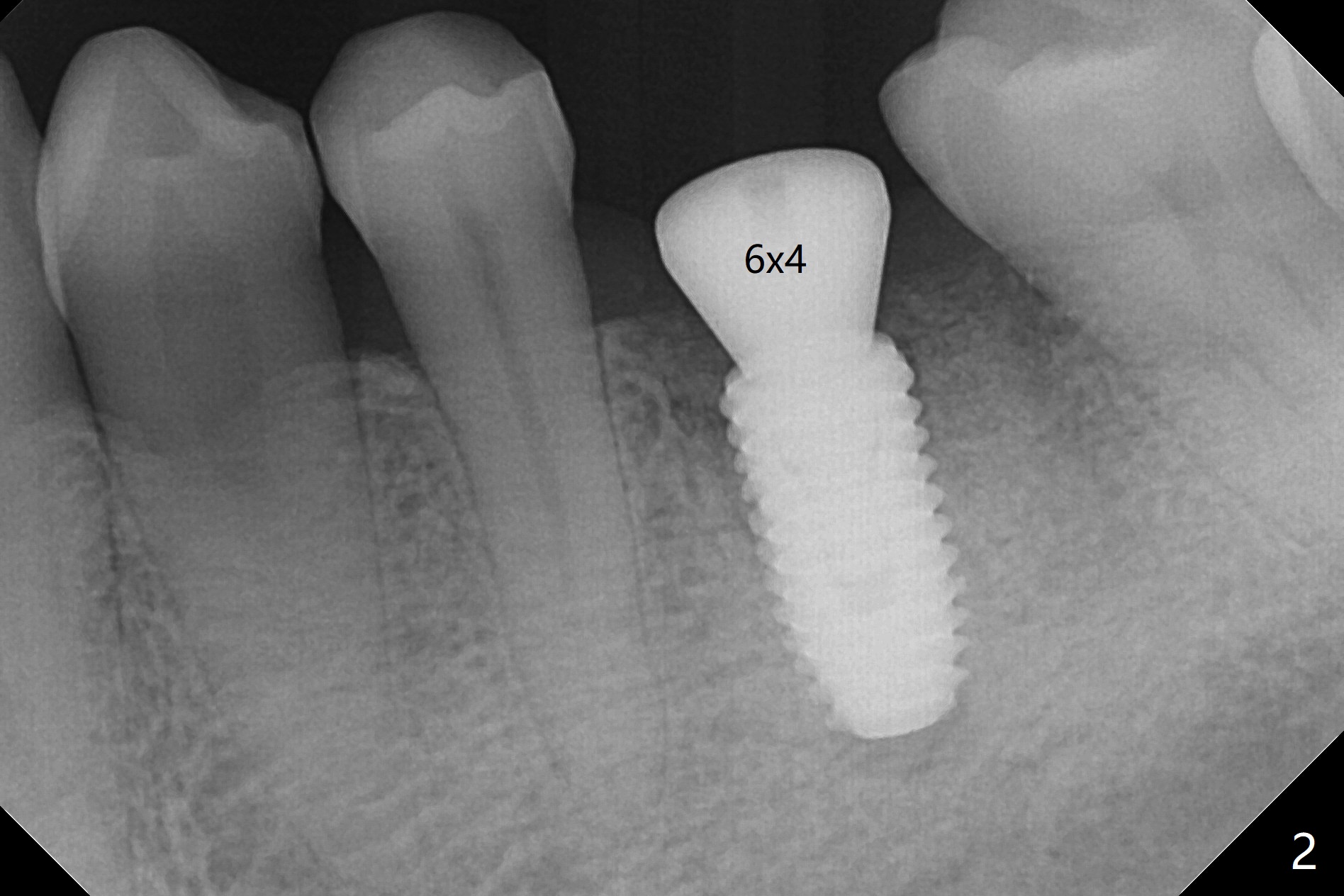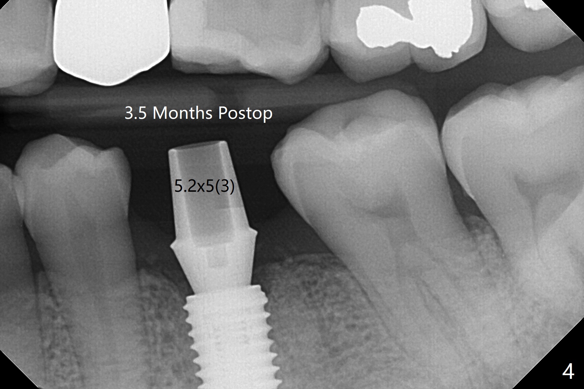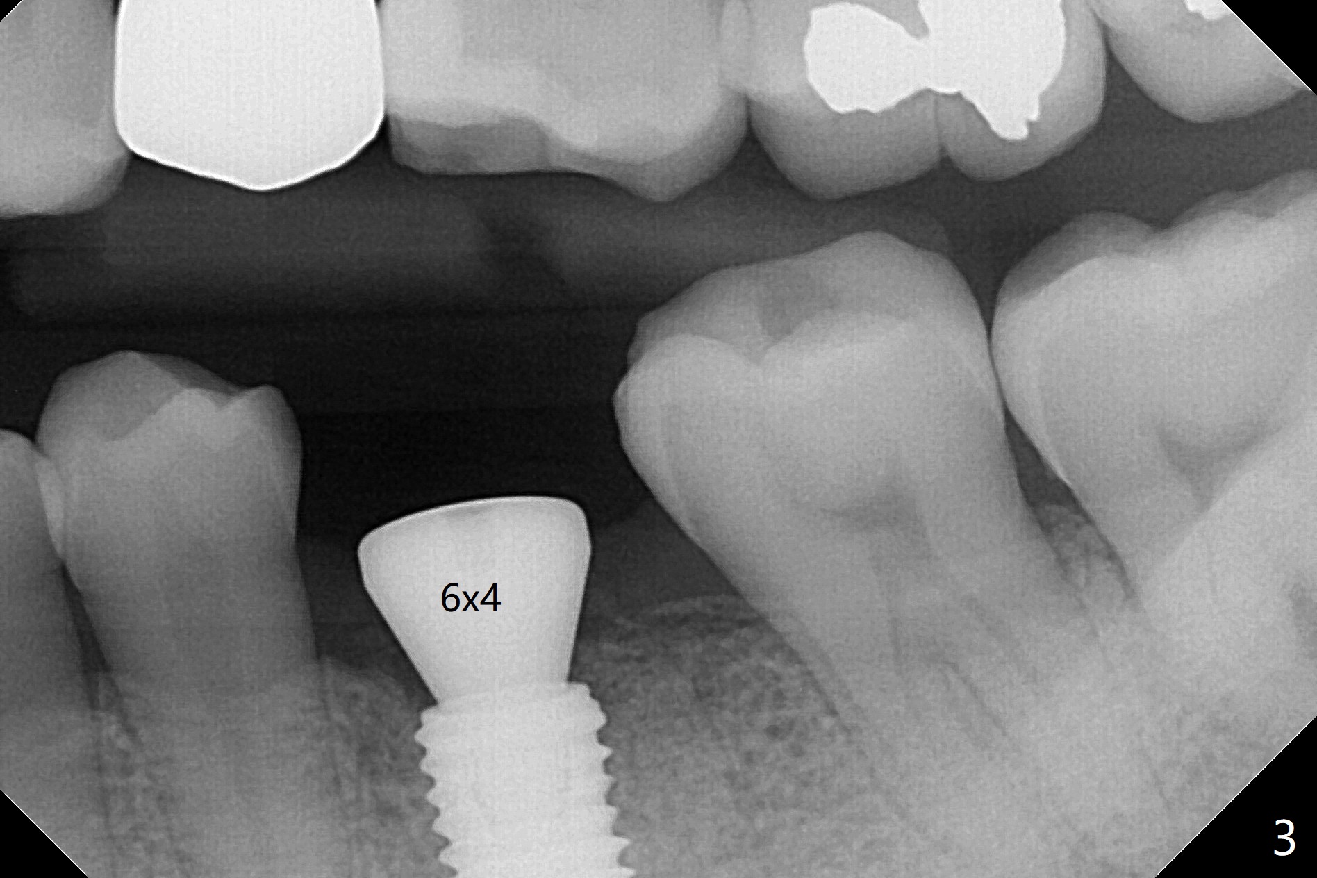 50来岁男,左下6位点保存术后4.5个月回来做导板植牙术,牙槽嵴和角化龈宽,几乎是最理想的手术。唯一担忧的是牙槽骨够不够硬(植骨后4.5个月),其实为了植入5毫米植体(图一),最后钻头必须4.5毫米,而且需要使用4.5毫米皮质骨功螺纹钻头,反复多次倒旋植体,最后扭力50Ncm,唯恐造成骨坏死。使用6毫米profile钻头后,放置6x4毫米基台,后者完全就位(图二,三)。术后病人汇报他根本感觉不到做过植牙术,以前做过徒手即刻植牙(30 13)。术后3.5月去除愈合基台,牙龈袖健康,使用Prosthetic treatment planning基台(没有六角形,容易就位,选择袖高度),放置修复基台(图四),拧紧20Ncm(厂家推荐30Ncm),放置plumber tape and Cavit,取模。口内粘固,事先牙冠(带有access hole)边缘涂凡士林,容易去除残余粘固剂,争取不取出基台,减少牙龈附着破坏。