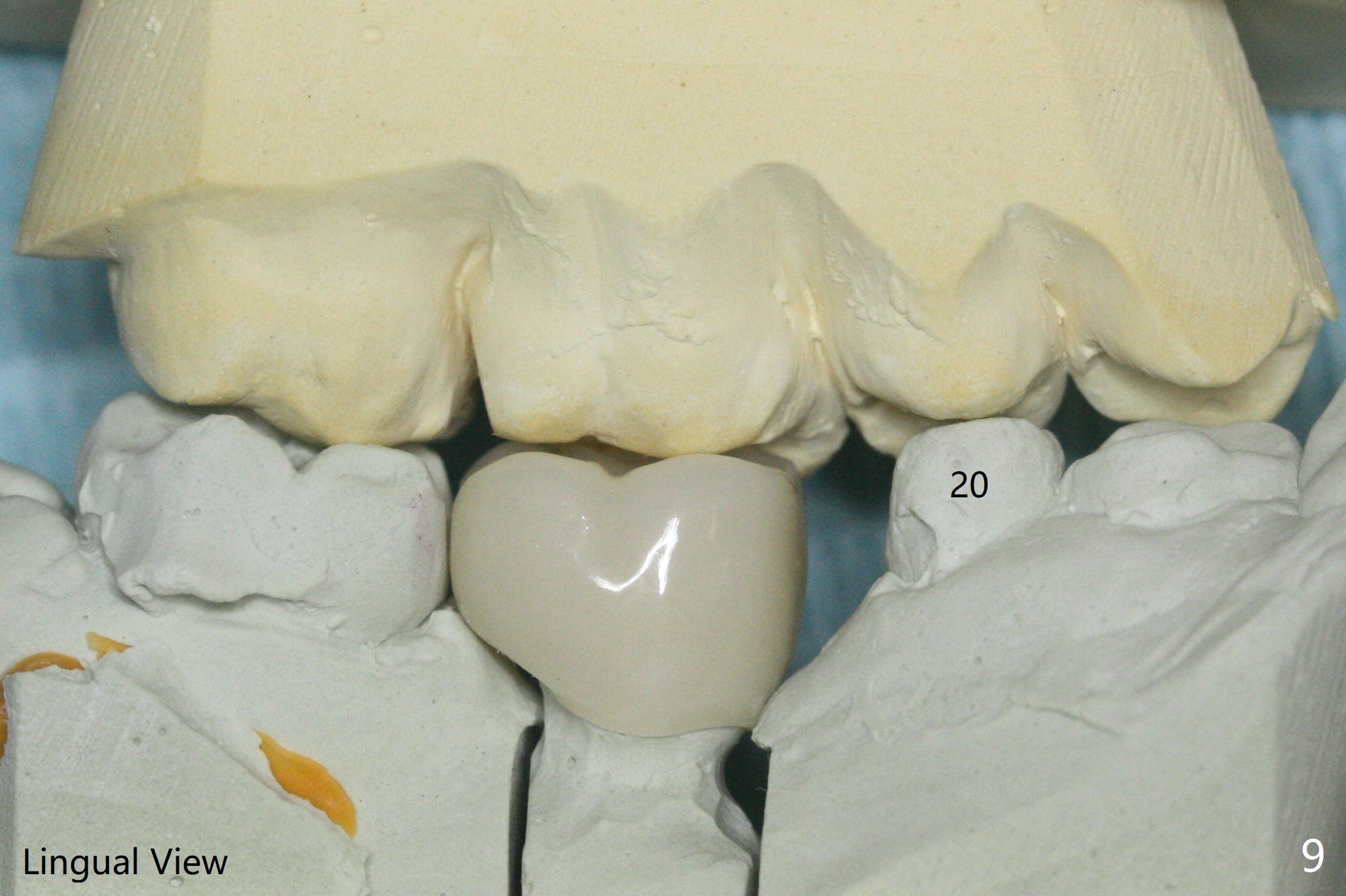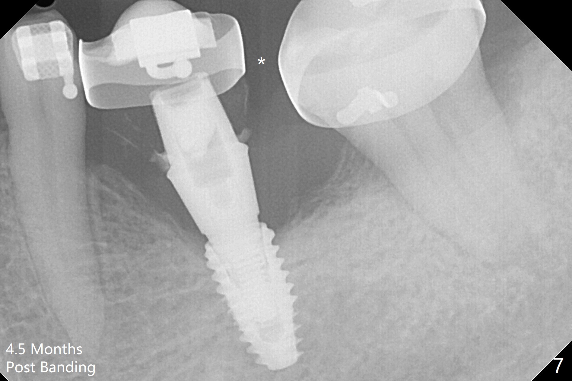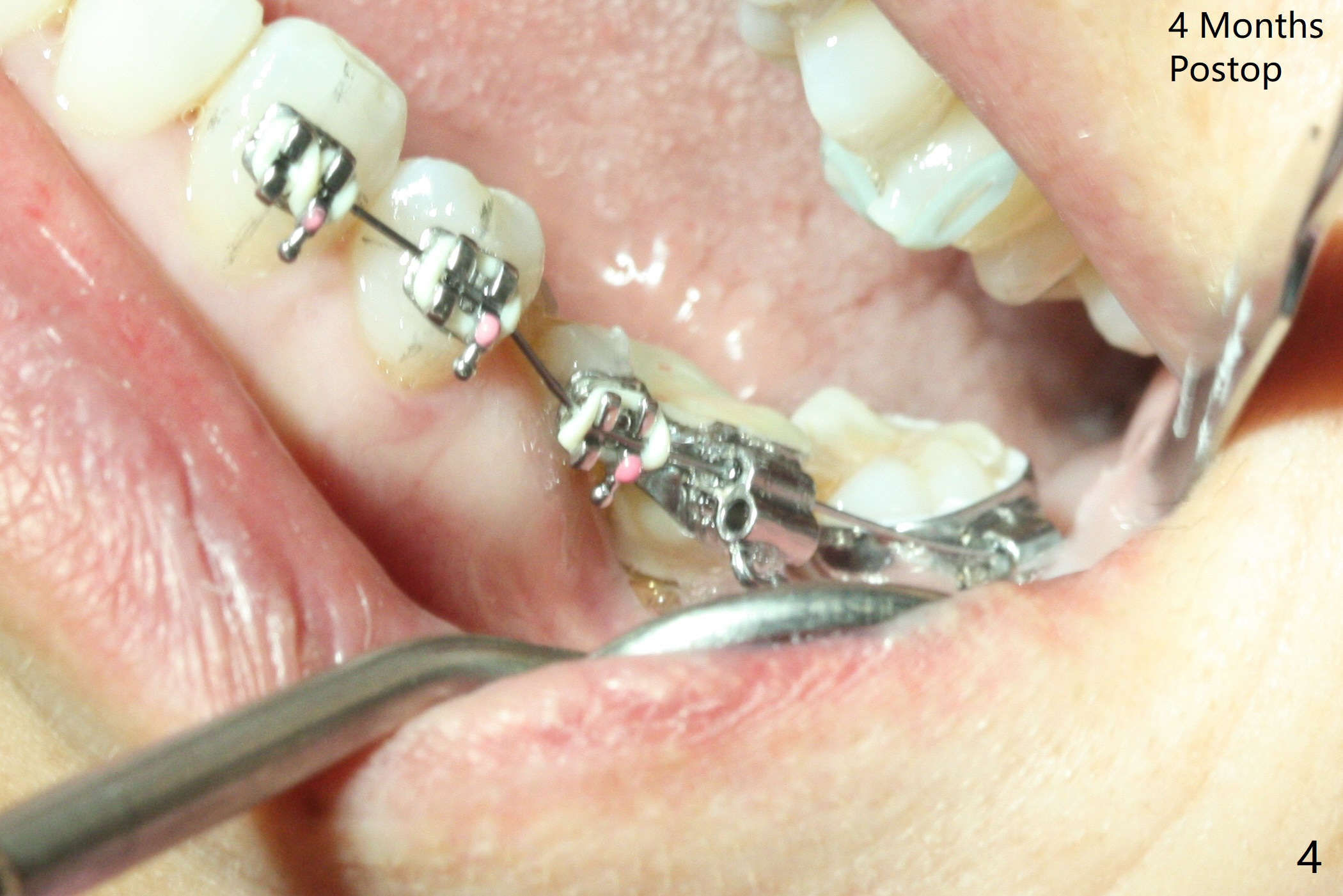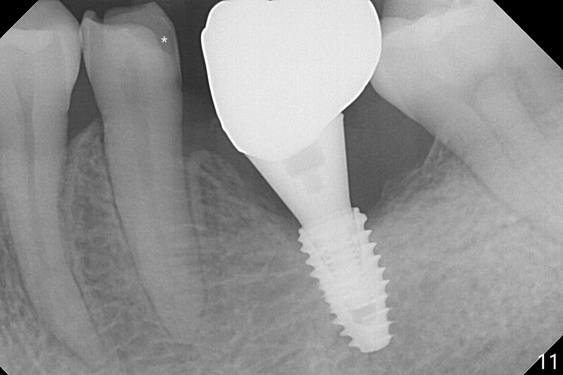 With 34 mg of Lidocaine and 17 mcg of Epinephrine (local infiltration), a 4.5x8.5 mm implant is placed with guide. The insertion torque is ~50 Ncm. It is placed in precise depth and in a short period of time (tolerable to the operators and patient, easier than mini-implant placement, Fig.1). There is no postop pain or paresthesia. The mesidistal position is within treatment plan (Fig.2). Miniimplants are placed to intrude #14 14 days prior. The teeth #16,17 and 32 are extracted 3 months postop. Minimal bone resorption at the crest is noted nearly 4 months postop (Fig.3). Bands and brackets are placed #18 upright 4 months postop (Fig.4 (14 niti wire)). The buccal and lingual view of the preop model shows that the supraerupted 1st molar (#14) has close relationship with the distal surface of the tooth #20 (Fig.5,6), accounting for the severe wear of the latter (Fig.8-11). The implant not only acts as an anchor to upright #18 in 4.5 months post banding (Fig.7 *), but also as an occlusal stop so that #18 has no interference to be moved. The stress on the implant results in radiating trabecular pattern (Fig.7,11 (9,11 months postop), as compared to before loading (Fig.1,3)). Restoring the distal contour of #20 with composite (Fig.12 C) makes it easy to close the space by adding porcelain the mesial surface of the implant crown. The crown/abutment is loose in China 7 months post cementation.