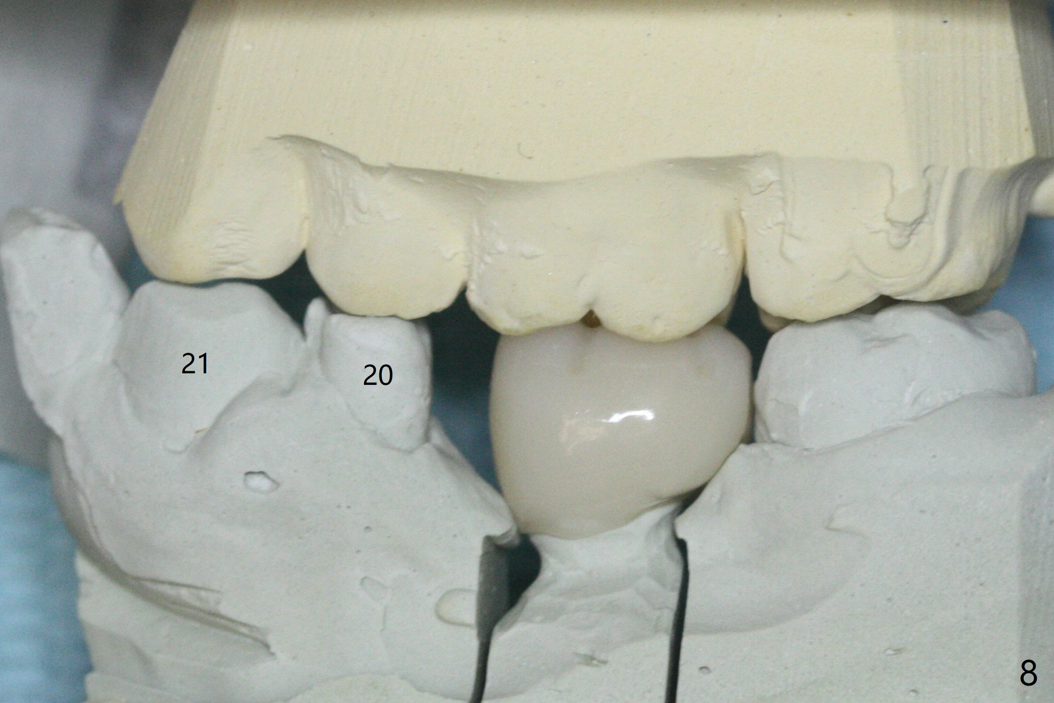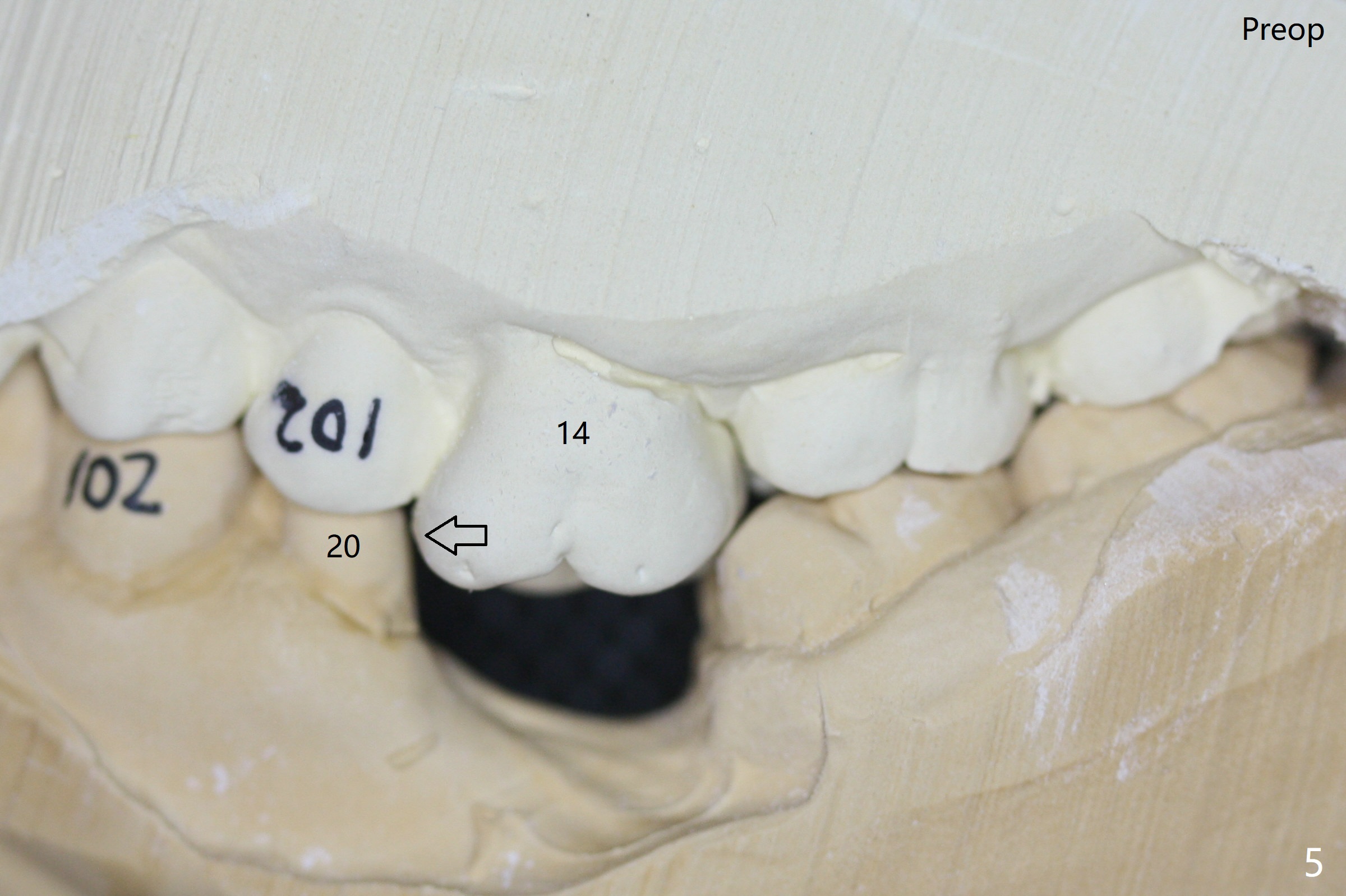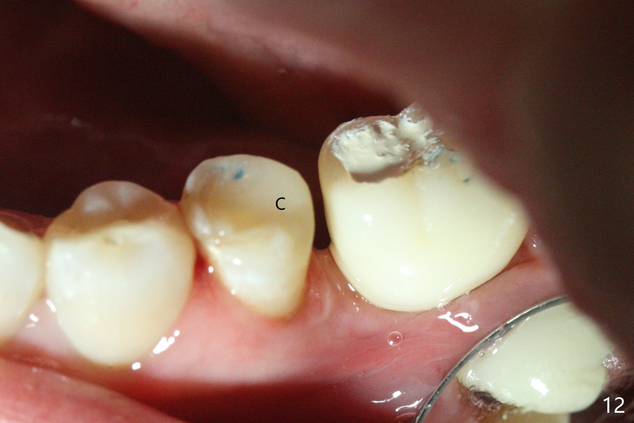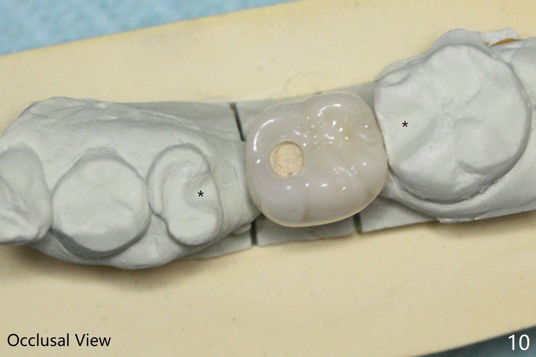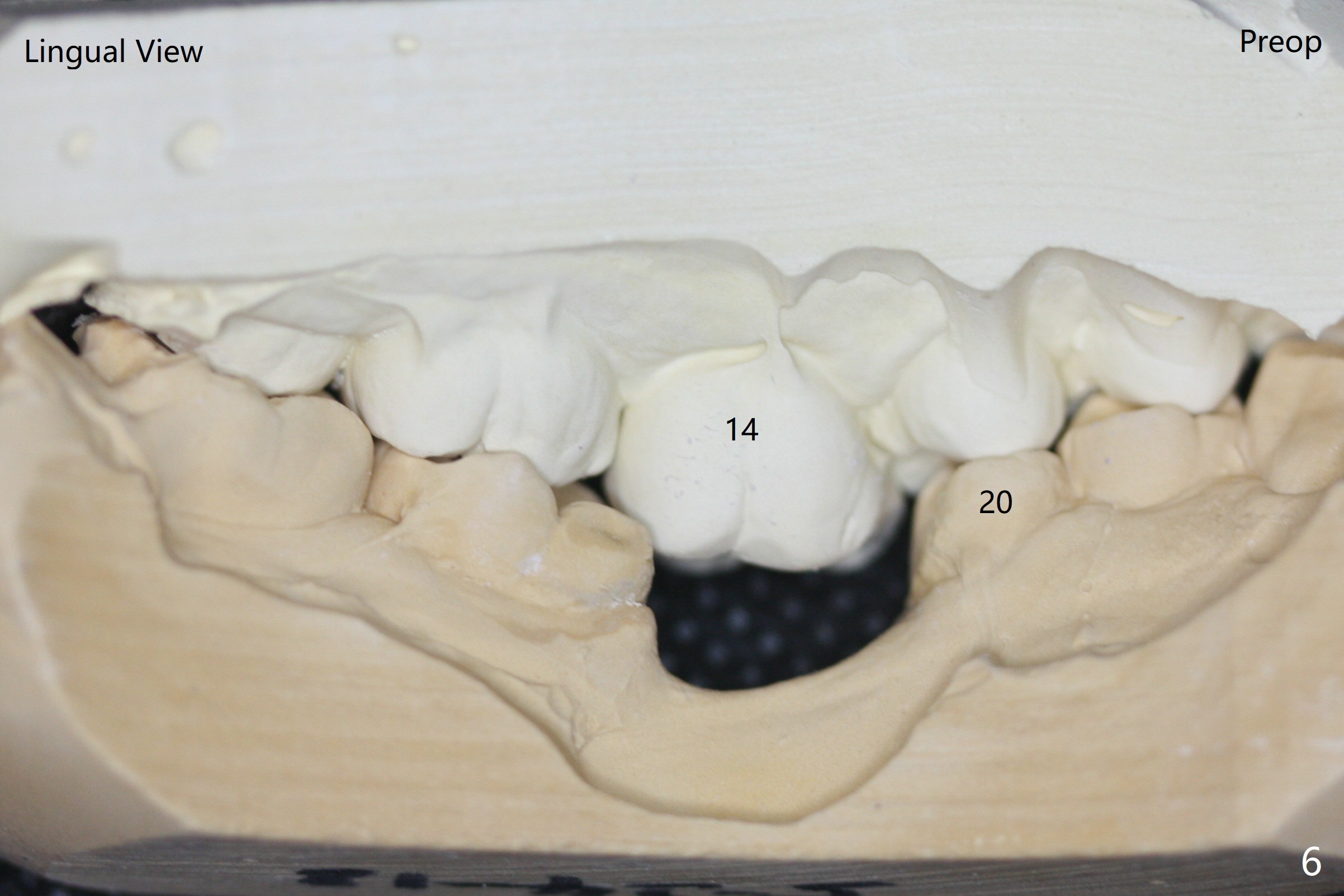 With 34 mg of Lidocaine and 17 mcg of Epinephrine (local infiltration), a 4.5x8.5 mm implant is placed with guide. The insertion torque is ~50 Ncm. It is placed in precise depth and in a short period of time (tolerable to the operators and patient, easier than mini-implant placement, Fig.1). There is no postop pain or paresthesia. The mesidistal position is within treatment plan (Fig.2). Miniimplants are placed to intrude #14 14 days prior. The teeth #16,17 and 32 are extracted 3 months postop. Minimal bone resorption at the crest is noted nearly 4 months postop (Fig.3). Bands and brackets are placed #18 upright 4 months postop (Fig.4 (14 niti wire)). The buccal and lingual view of the preop model shows that the supraerupted 1st molar (#14) has close relationship with the distal surface of the tooth #20 (Fig.5,6), accounting for the severe wear of the latter (Fig.8-11). The implant not only acts as an anchor to upright #18 in 4.5 months post banding (Fig.7 *), but also as an occlusal stop so that #18 has no interference to be moved. The stress on the implant results in radiating trabecular pattern (Fig.7,11 (9,11 months postop), as compared to before loading (Fig.1,3)). Restoring the distal contour of #20 with composite (Fig.12 C) makes it easy to close the space by adding porcelain the mesial surface of the implant crown. The crown/abutment is loose in China 7 months post cementation.