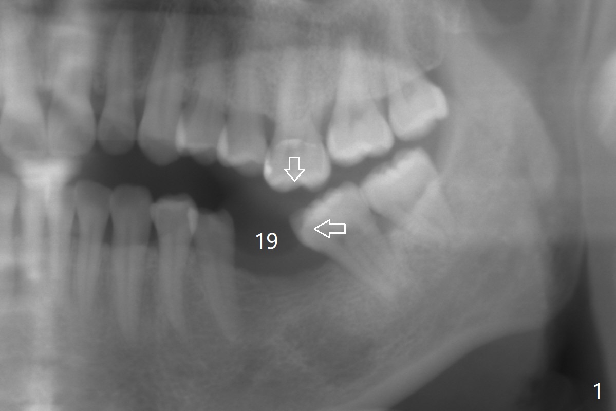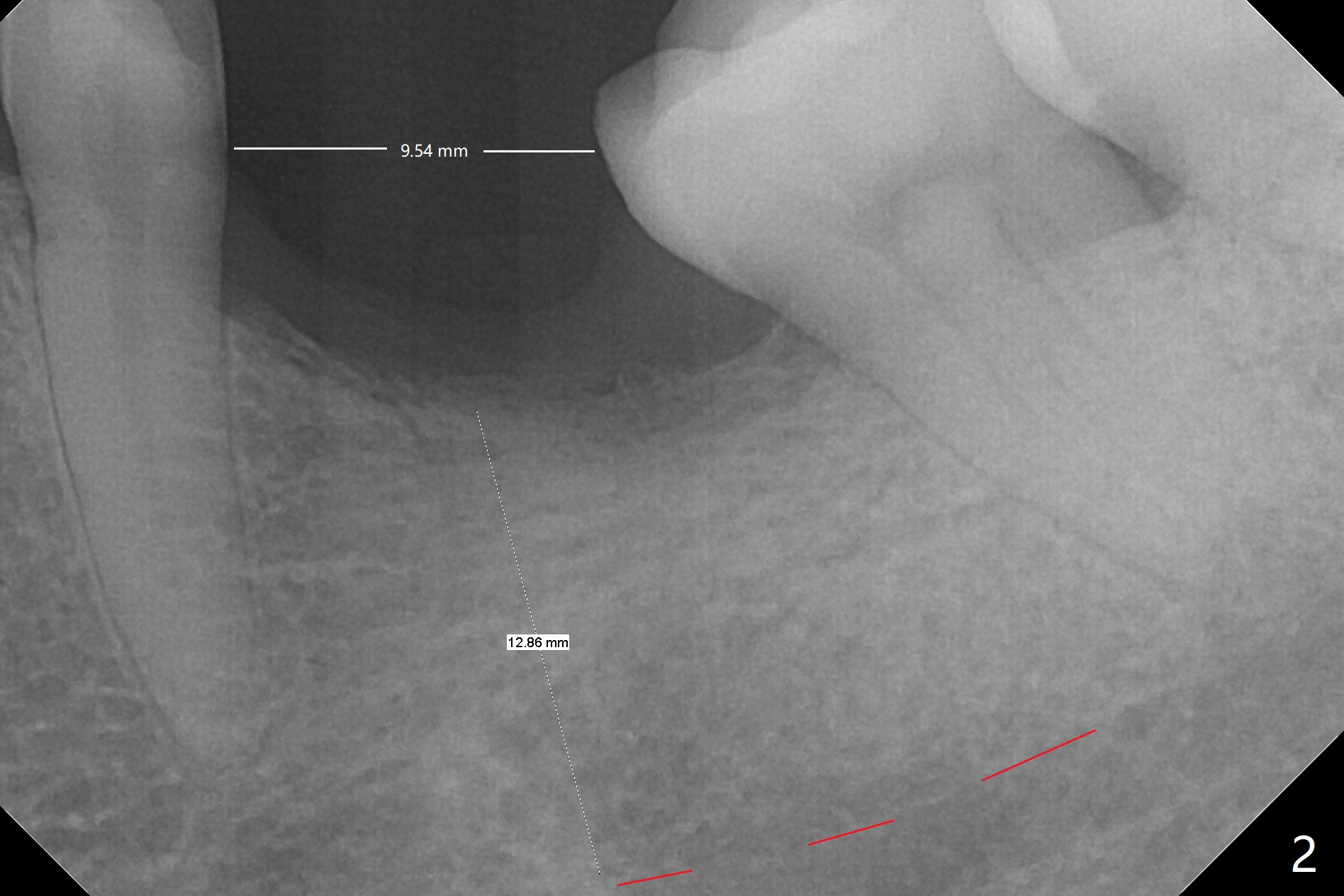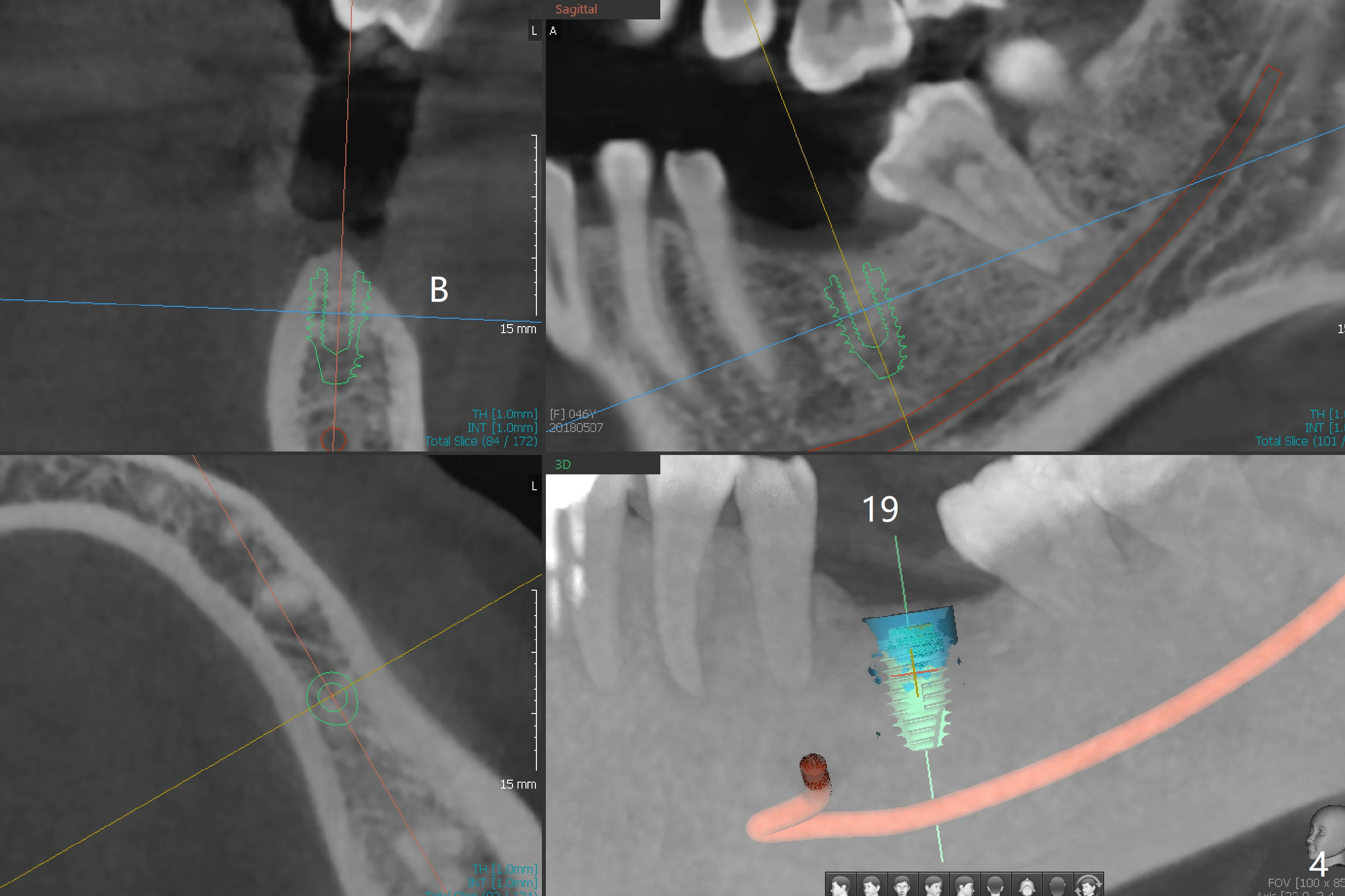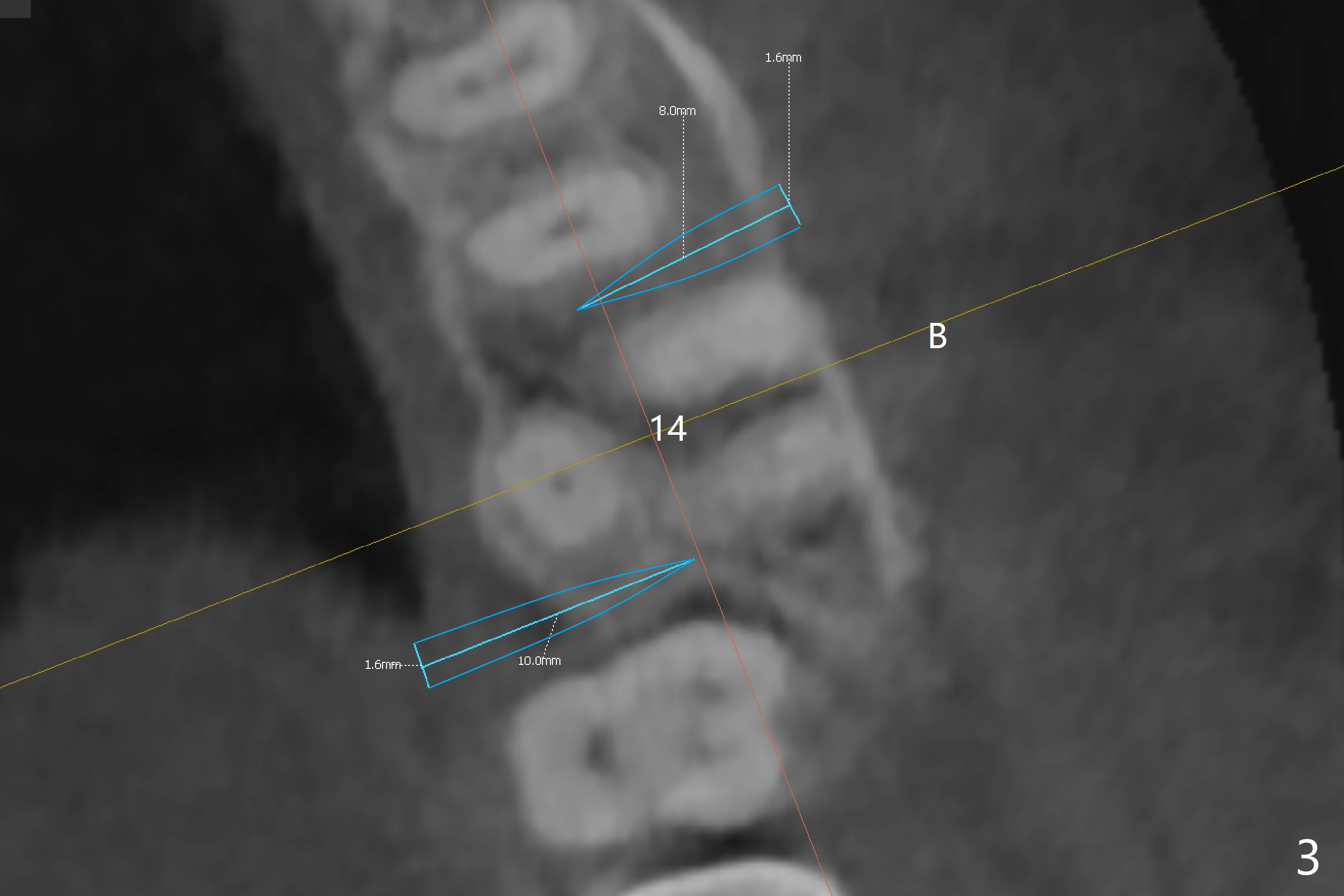 A 46-year-old woman has lost the tooth #19 since middle school with supraeruption of the tooth #14 and mesial tilt of the teeth #17 and 18 (Fig.1 arrows). After slightly distal placement of an implant at #19 with guided surgery (Fig.2), two minimplants will be placed for intrusion of the tooth #14. Upon implant osteointegration, a provisional will be fabricated with supraocclusion to facilitate the intrusion and upright the tooth #18 with extraction of the tooth #17. Fig.3 is a coronal section of CT of the roots of the tooth #14, showing 1.6x8 mm and 1.6x10 mm mini-implants to be placed mesiobuccal and distopalatal. A 5x8.5 mm implant will be placed at the site of #19 (Fig.4).