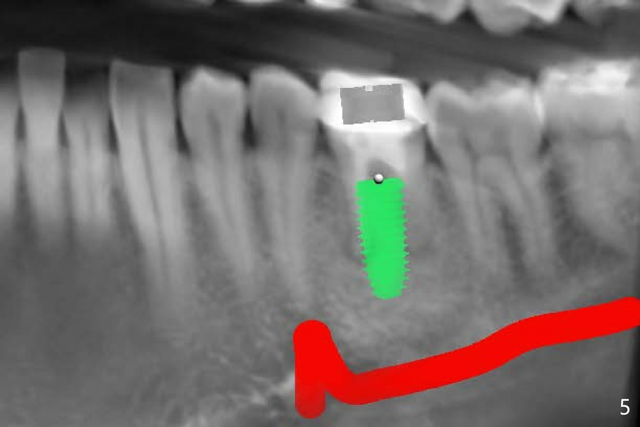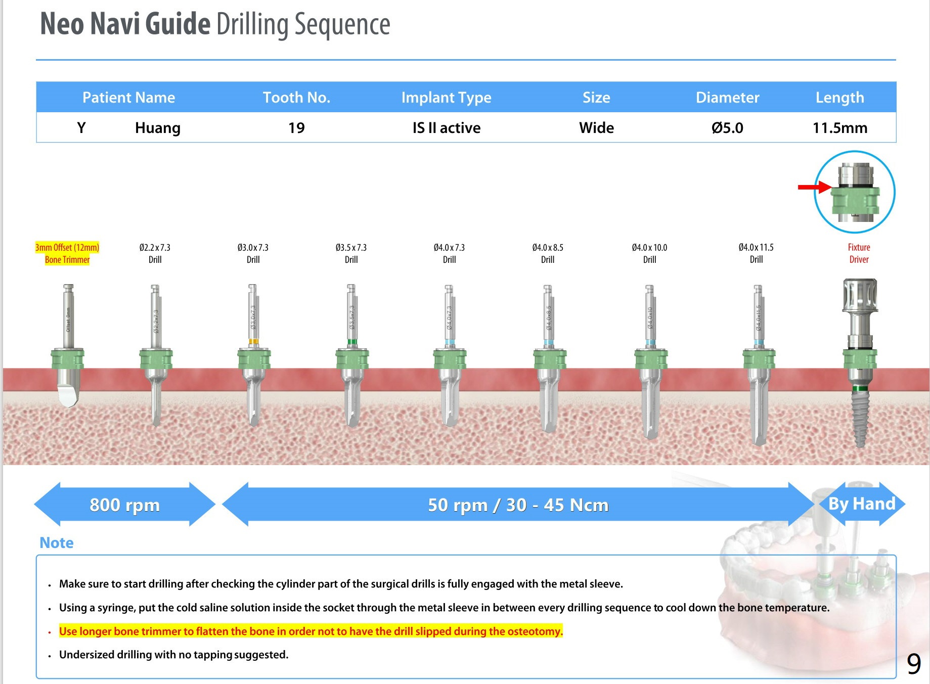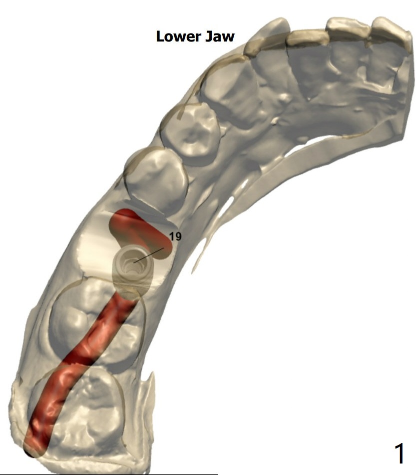 A 54-year-old man decides to extract the tooth #19 because of failure of RCT in the disto-lingual long curved root. Since it is difficult to drill through the roots, the latter will be removed. Use 2.2 mm drill to reach the depth first, look for deviation and take PA. Prepare cowhorn, surgical handpiece and proximators. PRFx1. Use 4.5x11.5 mm drill before placing 5.5x11mm IBS implant.