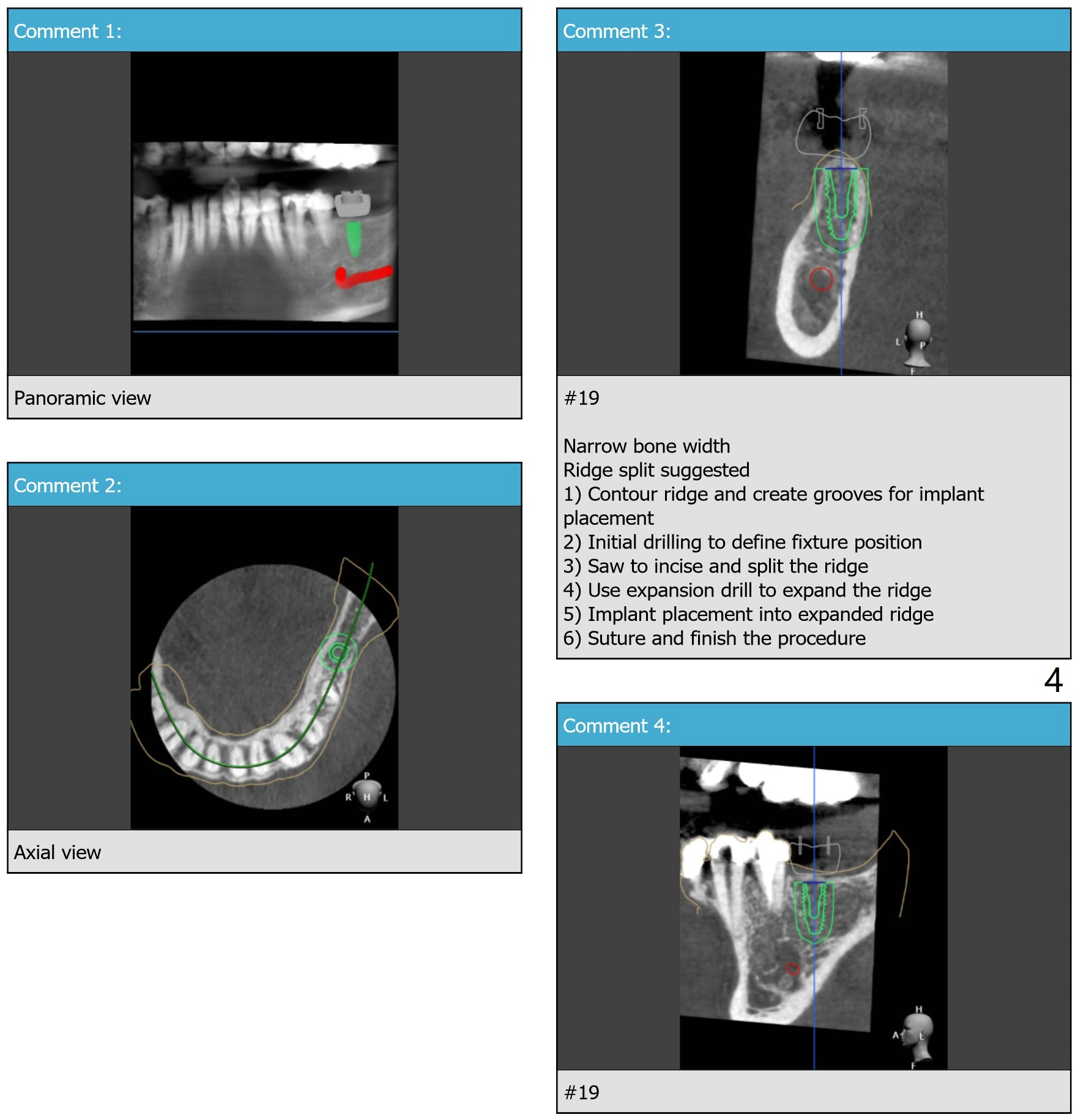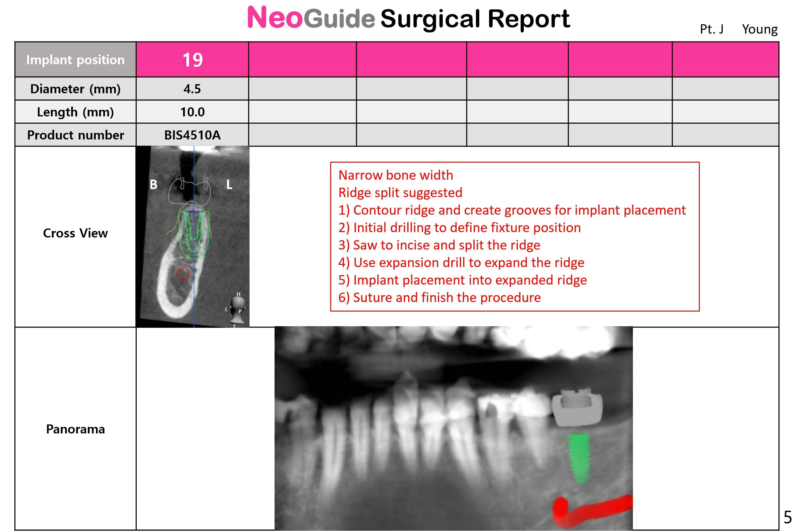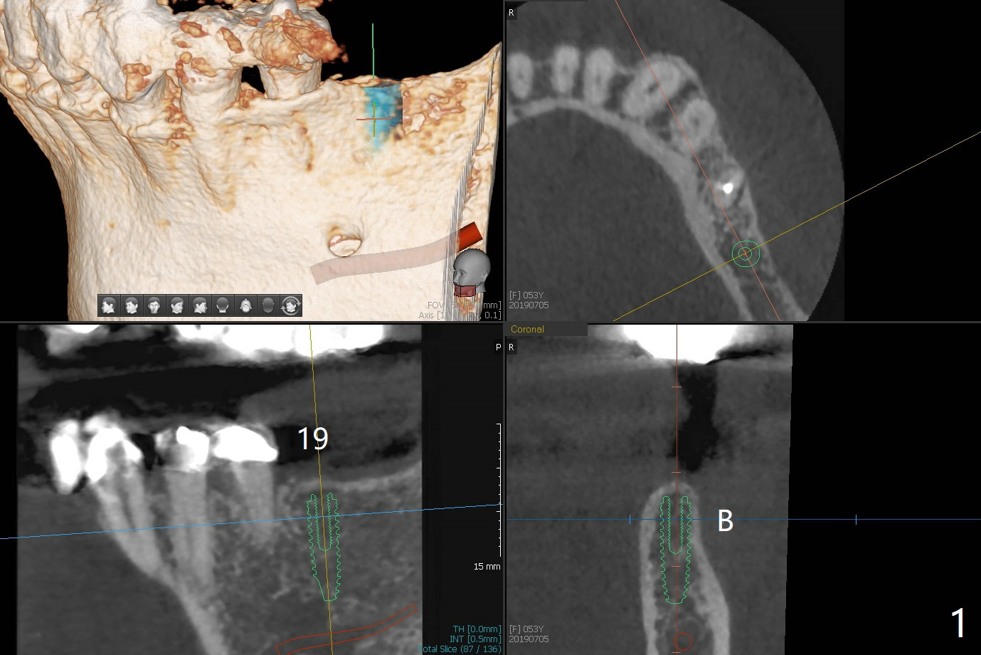 A 53-year-old woman requests implant at #19 after redo #14 crown. The ridge is narrow (holding a 3.5x11.5 mm implant) and apparently low in density (Fig.1). Bone expansion seems necessary. Following use of 2.2 mm drill to the depth, bone expanders will be introduced (1.7/3.1 and 2.4/3.7 mm). After 4.0 mm cortical tap, a 4.0x11.5 mm implant is placed. If torque is high, use 3.5 mm drill. Postop 5x5 cm CT will be taken. Also take pre- and post-op photos of the buccal plate. Prepare surgical handpiece and a new thin fissure bur for ridge split as well as split saw block. Use a UF implant, in consistent with that at #11.