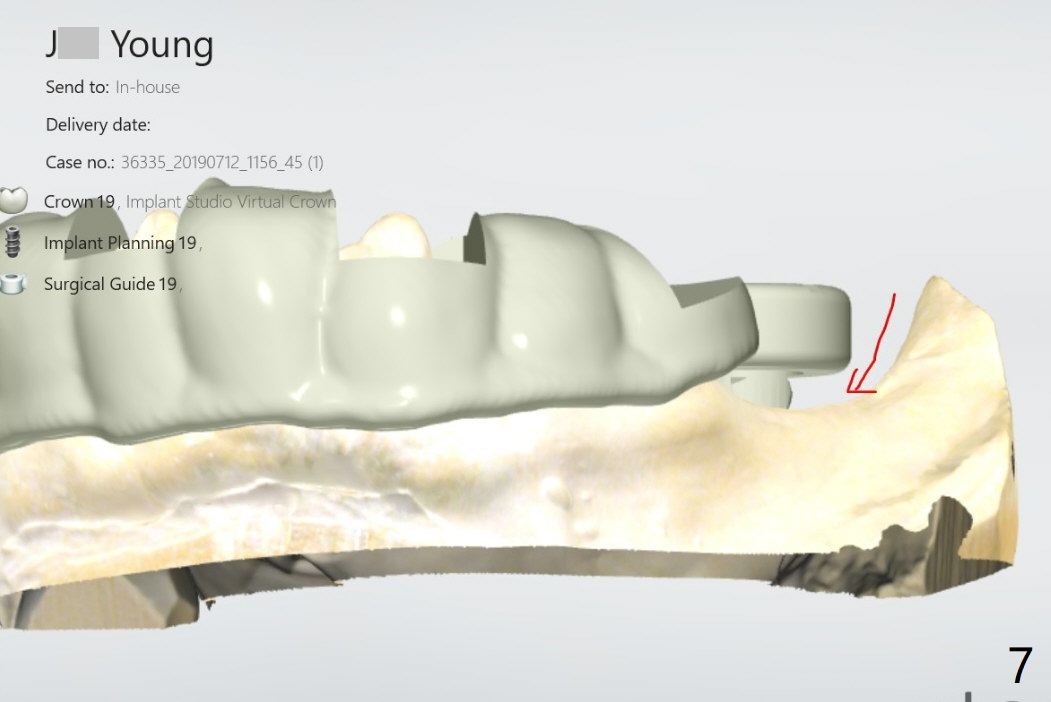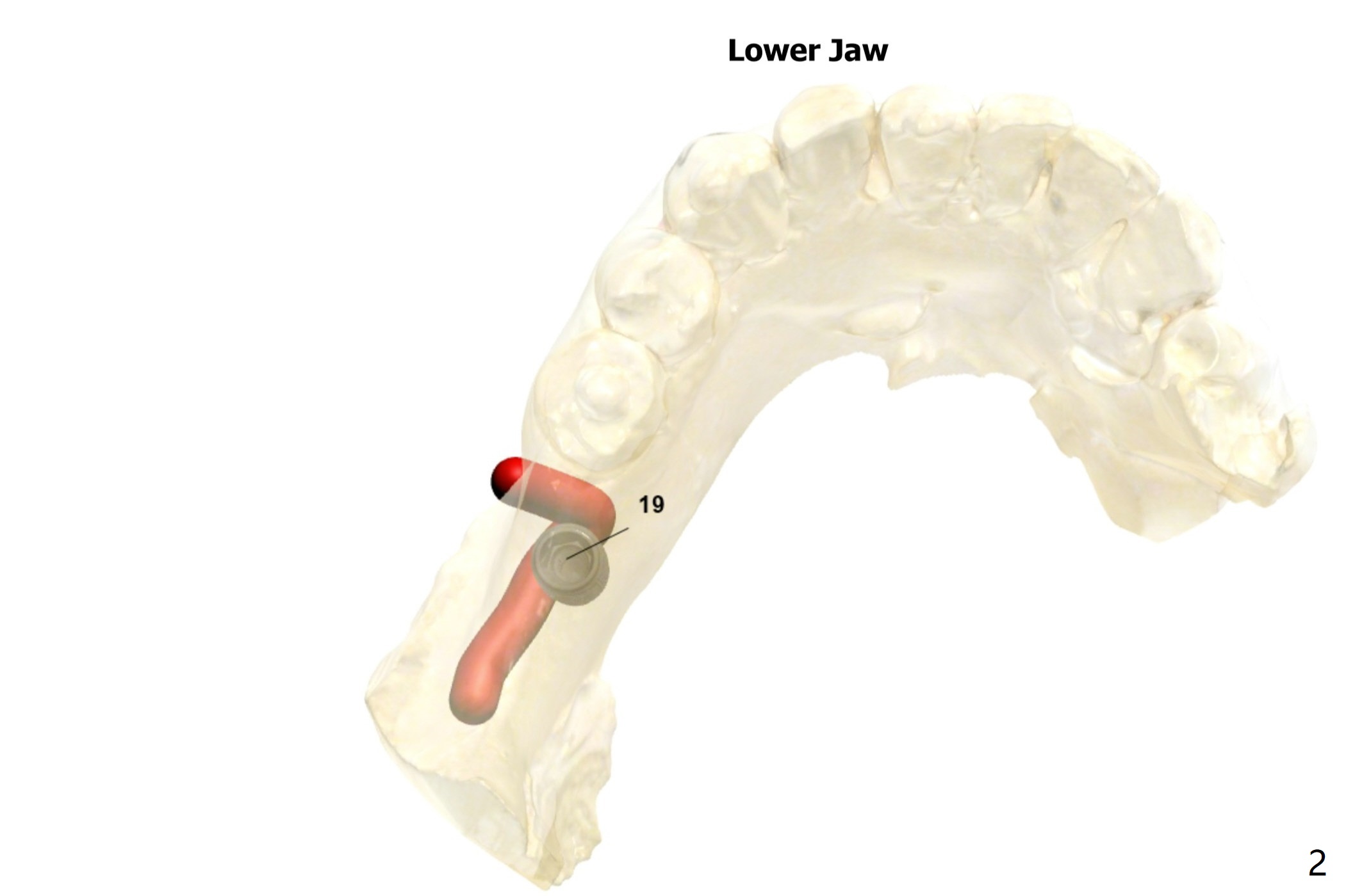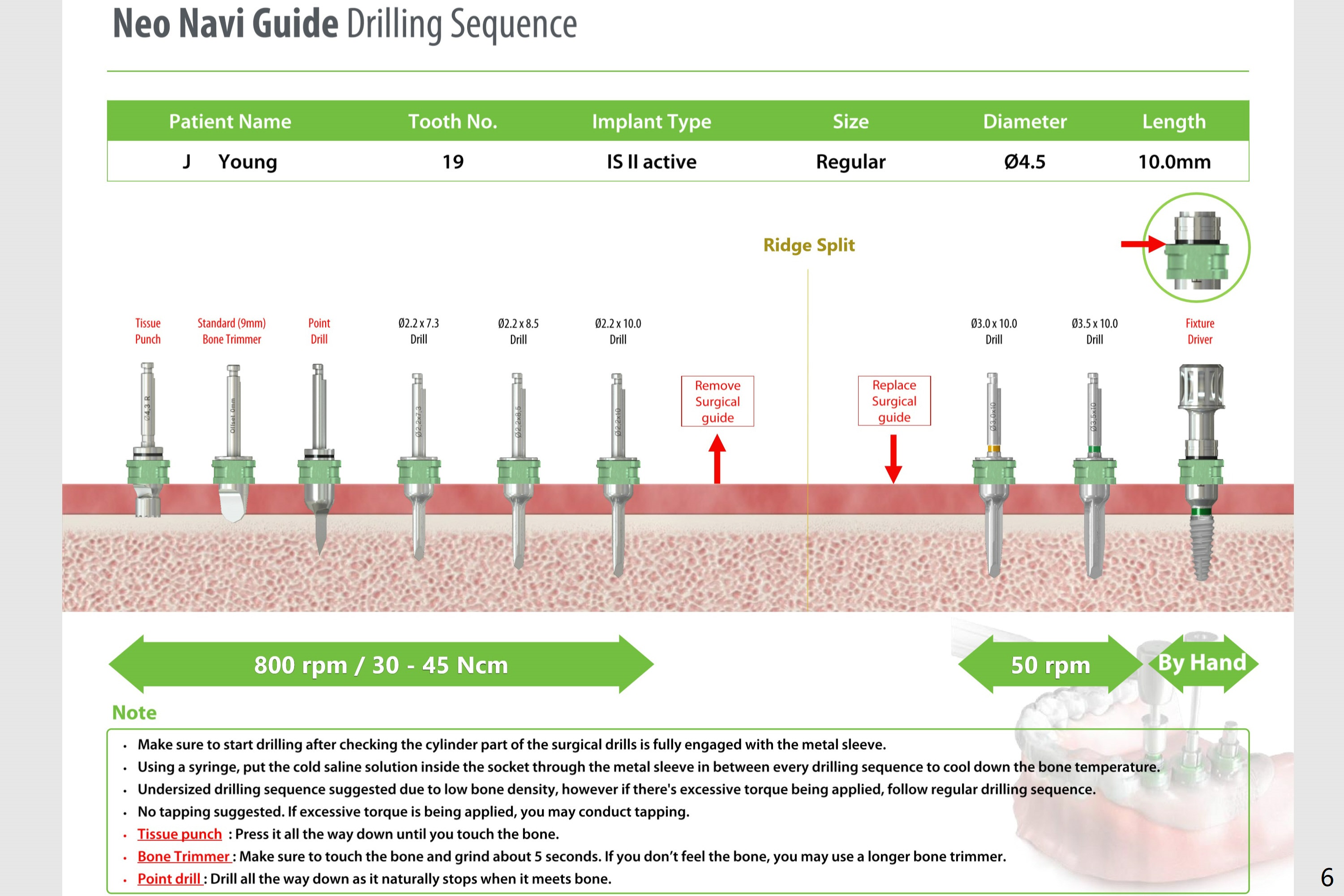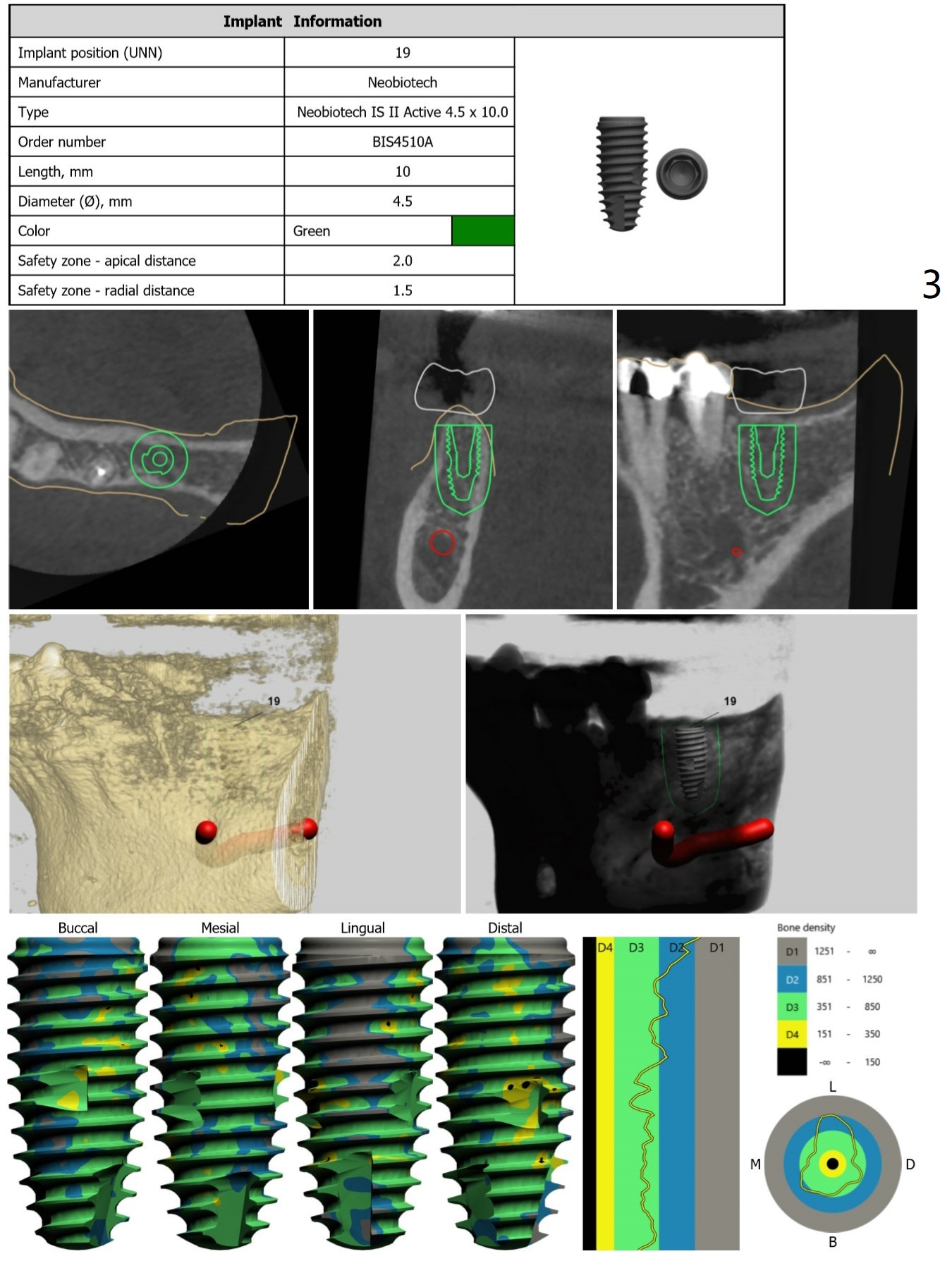 A 53-year-old woman requests implant at #19 after redo #14 crown. The ridge is narrow (holding a 3.5x11.5 mm implant) and apparently low in density (Fig.1). Bone expansion seems necessary. Following use of 2.2 mm drill to the depth, bone expanders will be introduced (1.7/3.1 and 2.4/3.7 mm). After 4.0 mm cortical tap, a 4.0x11.5 mm implant is placed. If torque is high, use 3.5 mm drill. Postop 5x5 cm CT will be taken. Also take pre- and post-op photos of the buccal plate. Prepare surgical handpiece and a new thin fissure bur for ridge split as well as split saw block. Use a UF implant, in consistent with that at #11.