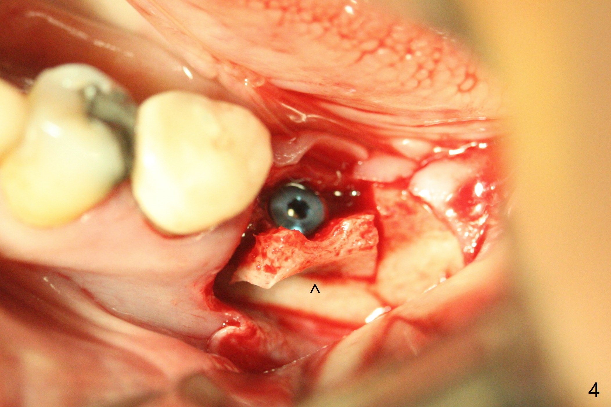 The guide is reseated for final drilling until 3.5x10 mm. The buccal plate starts to fracture when a 4x10 mm IS dummy implant is being inserted; the fracture gets worse when a 4.5x10 mm final UF implant is placed (Fig.4 ^).