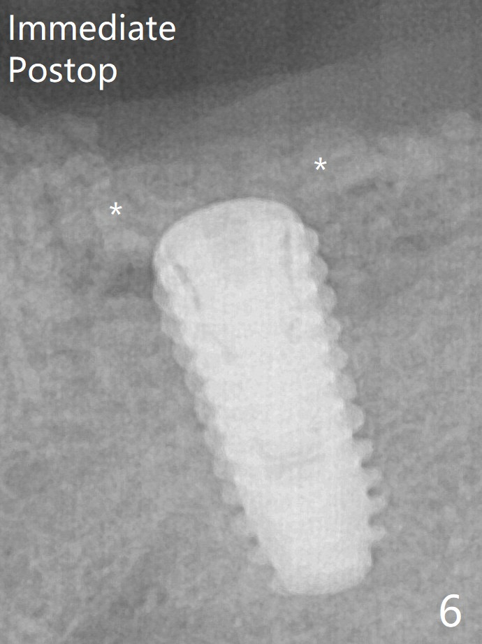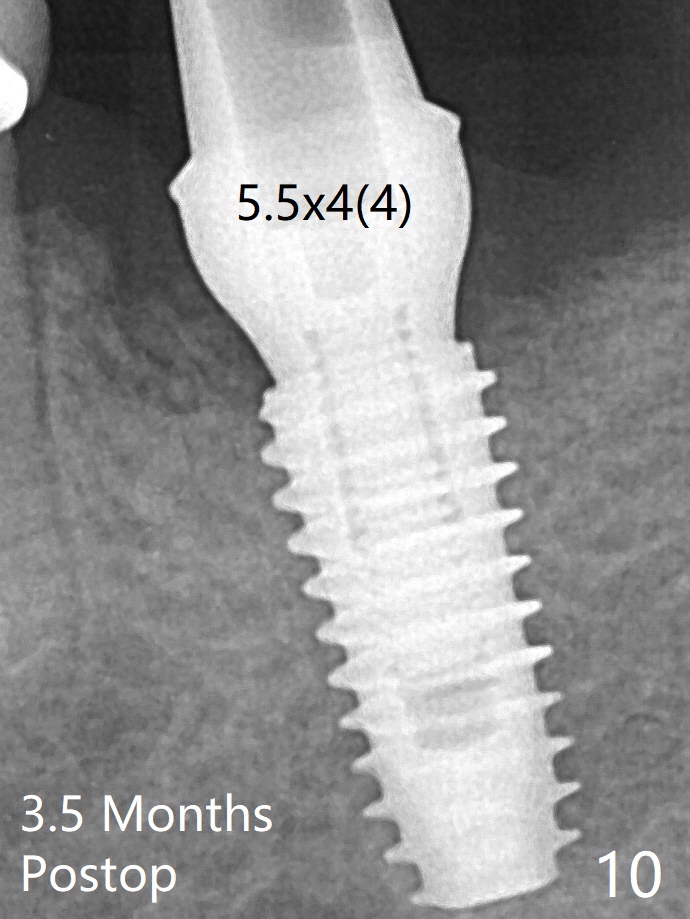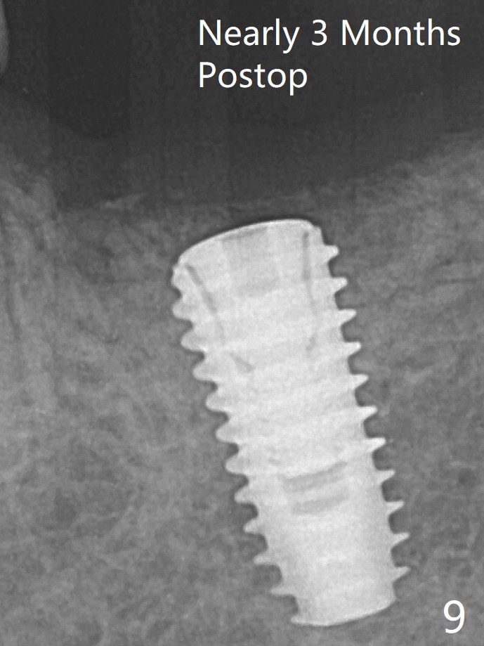 Allograft is placed around the fractured ridge (Fig.6*) before suturing. The ridge appears to have healed nearly 3 months postop (Fig.9). In uncover, the implant plateau is covered with bone; surgical handpiece is used to remove the overlying bone before removing the healing screw. Bone loss in the near future is expected to be minimal if more implants can be placed on the right side. A 5.5x4(4) mm abutment is placed 3.5 months postop (Fig.10).