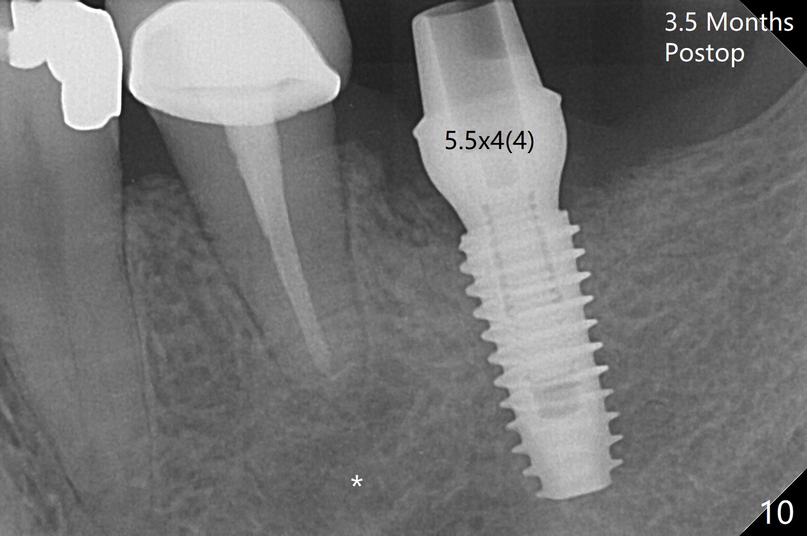 The tooth #20 develops lingual abscess when the patient returns for abutment placement 3.5 months postop (Fig.10 *). Extraction and implant are apparently needed.