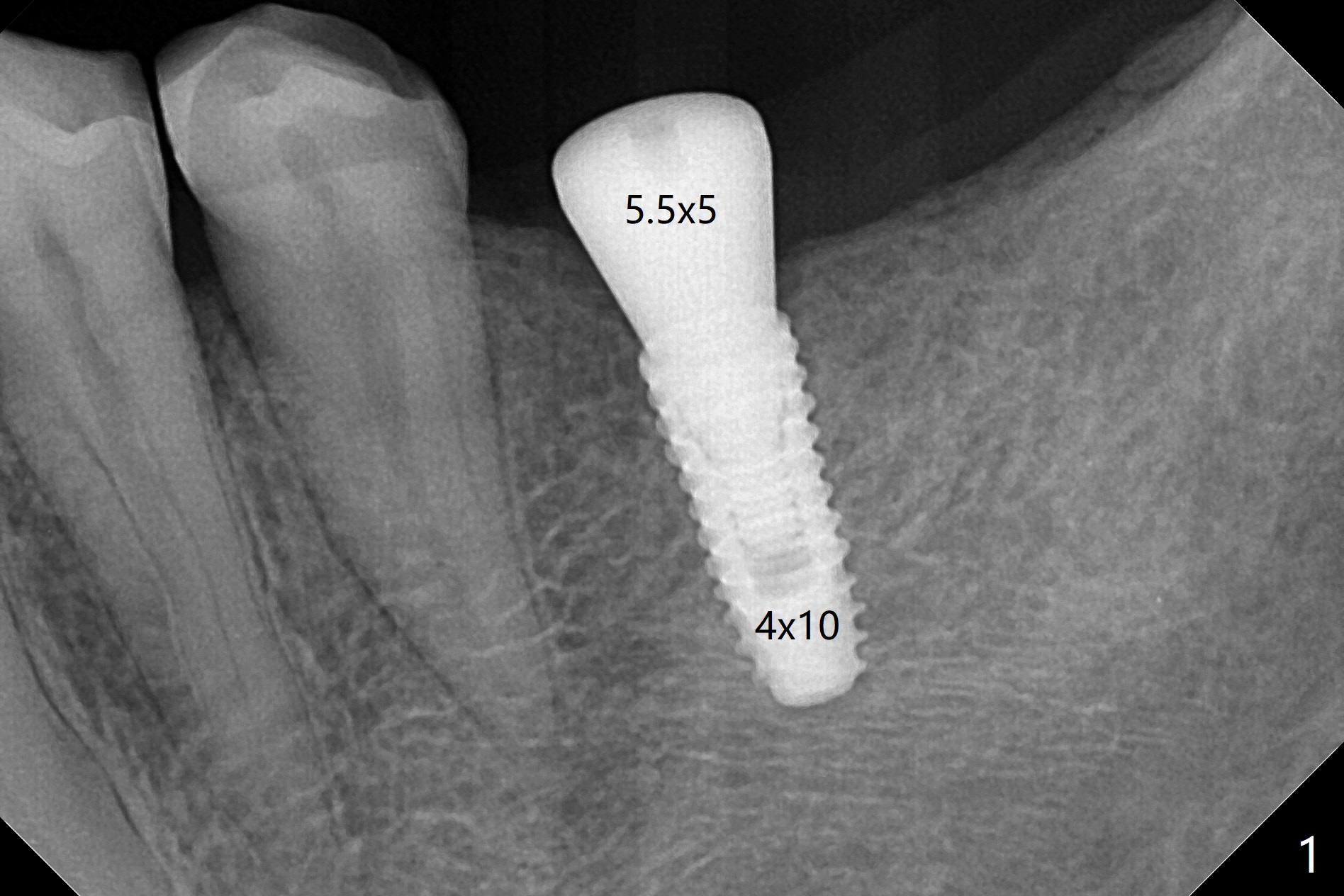 术前即刻发现19号牙位牙槽嵴角化龈不宽,所以选择切开,另一个好处是植体植入后可以清楚观察到植体(5-10 Ncm)刚刚好位于舌侧牙槽嵴下,而且后者最薄,与设计一致。使用6毫米Profile Drill后,观察斜坡也容易,最后放置5.5x5毫米愈合基台(图一:好像没有就位)。缝合后覆盖牙周敷料。