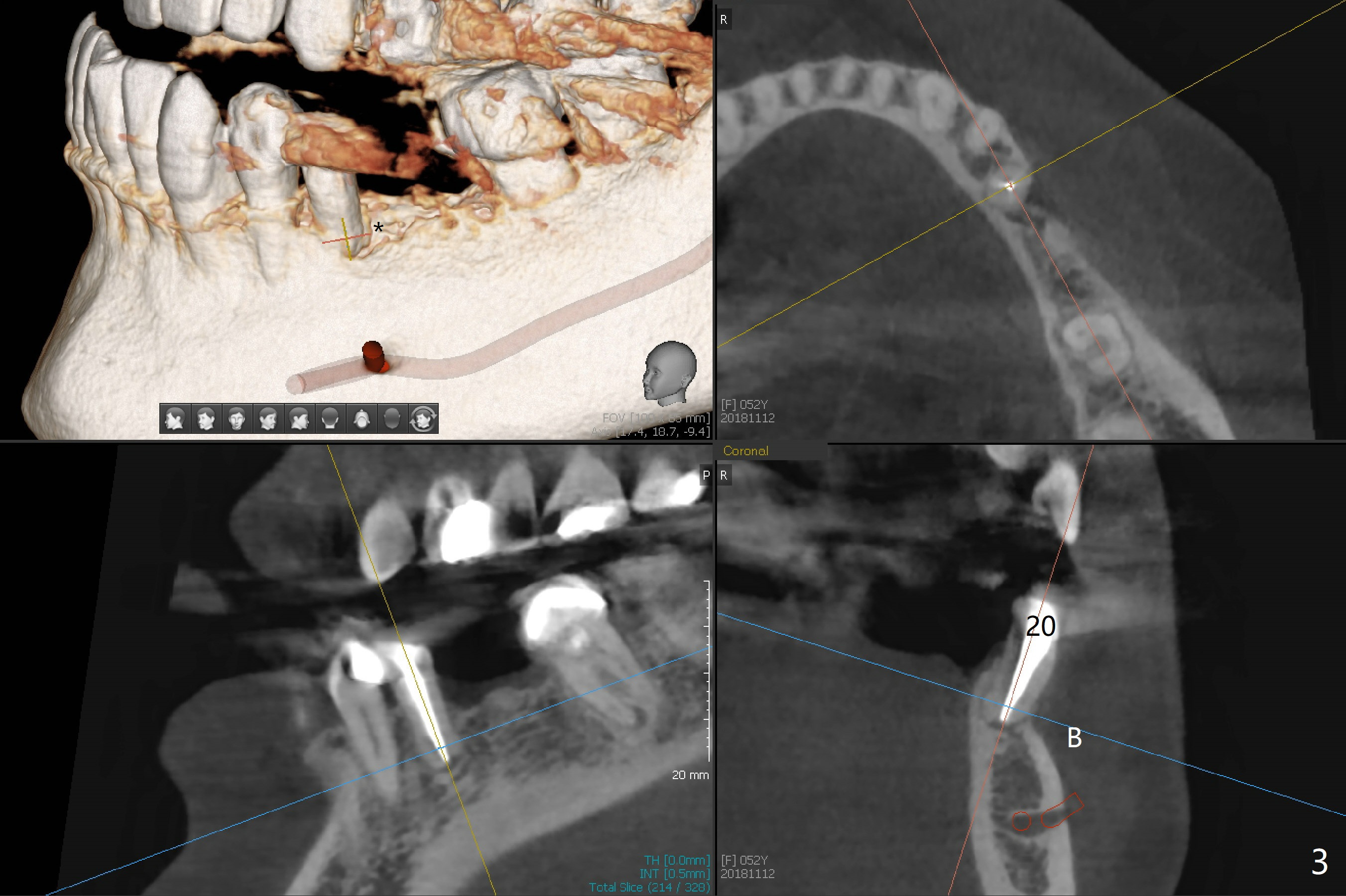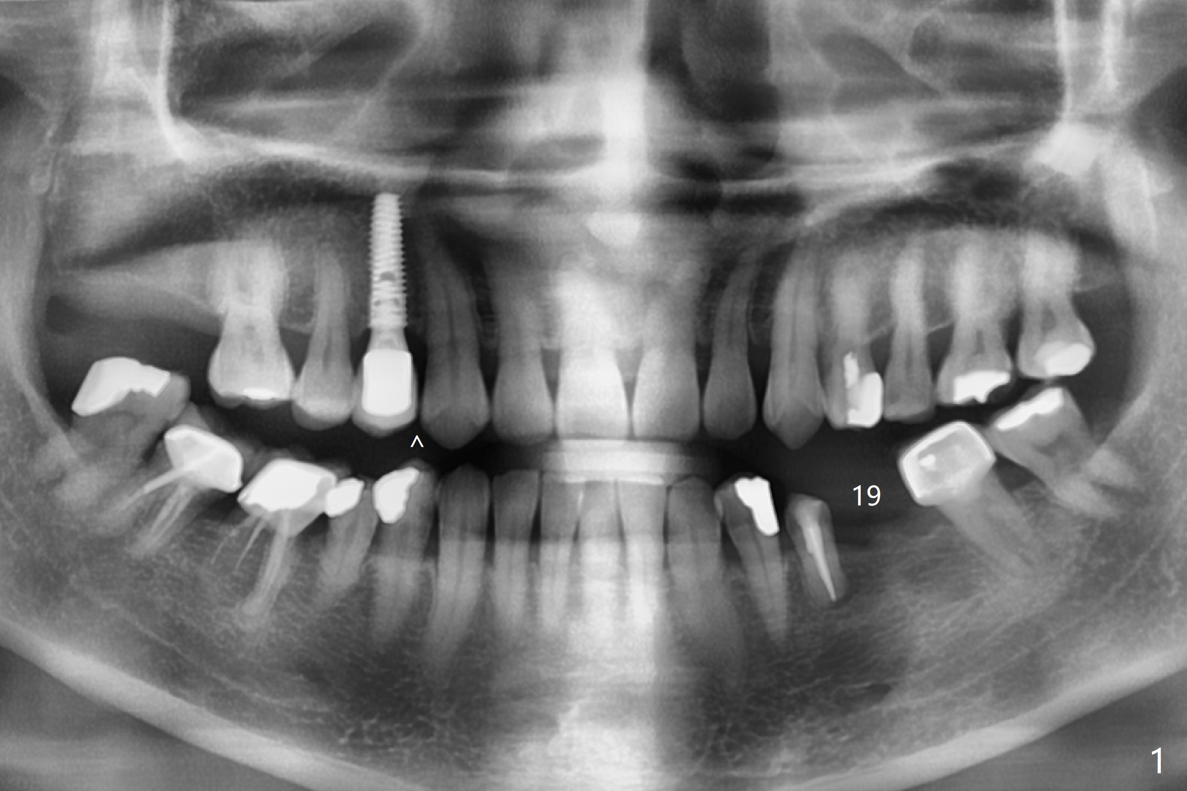 A 52-year-old woman requests an implant at #19 (Fig.1). Her other 2 concerns are the diastema between #5 implant crown and the tooth #6 (Fig.1 (^),2) and whether the tooth #20 is stable enough for crown after sectioning #18-20 FPD and RCT (Fig.1,3 (disto(*)-buccal (B) bone loss)). The ridge at #19 seems to be narrow; a 4x10 mm IS implant appears to be appropriate for the site (Fig.4). Since Magicore has a narrow core and aggressive fins, a 4.0 or 4.5x9(3) mm implant is apparently a good fit. After osteotomy, remove guide, use perio probe to determine crest level and place Magicore