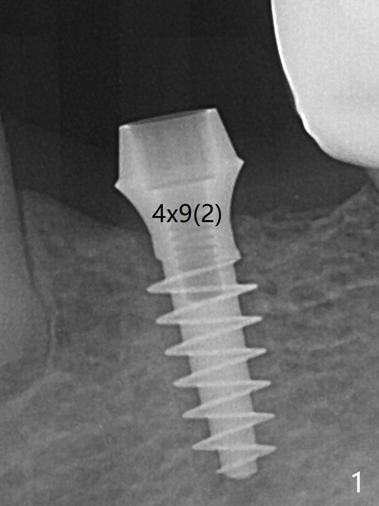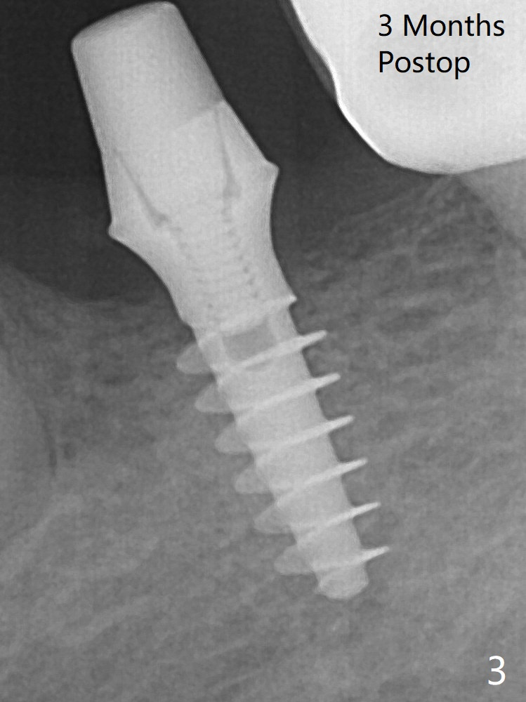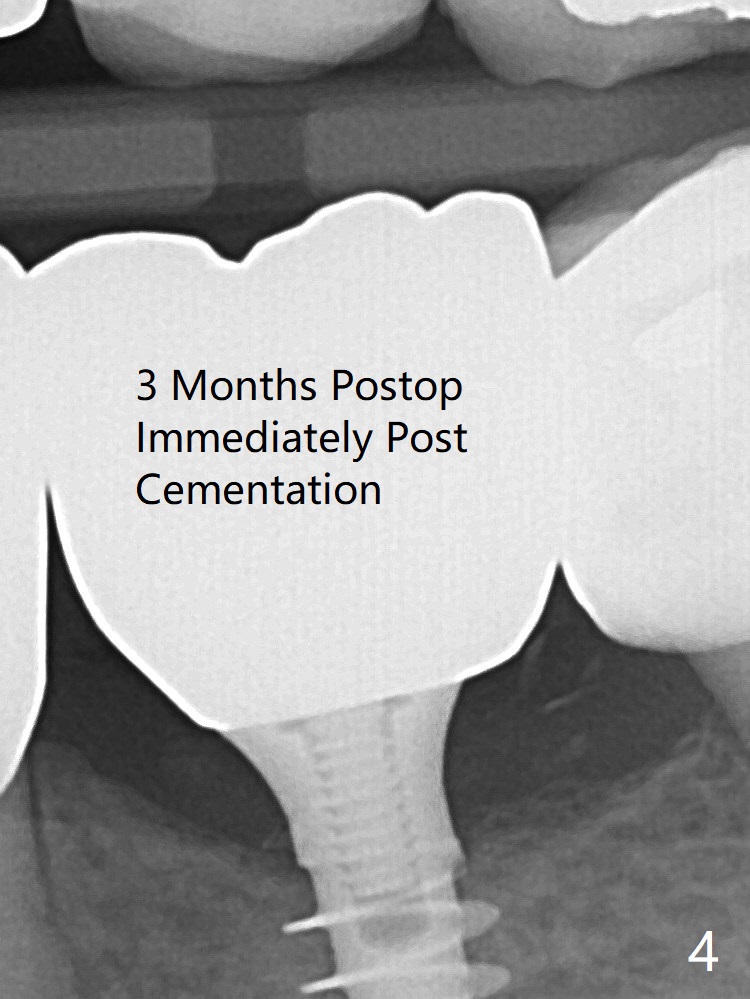 After finishing osteotomy at #19 according to IS drill sequence for 4x10 mm implant except cortical tap, a 4x9(2) mm Magicore is placed with ~ 50 Ncm (Fig.1). Thin threads are less traumatic with less bone loss. The implant with 4.5x3 mm solid abutment is stable for impression nearly 3 months postop (Fig.3). Appreciate the distinct thread pattern of Magicore 3 months 1 week postop, immediately post cementation (Fig.4).