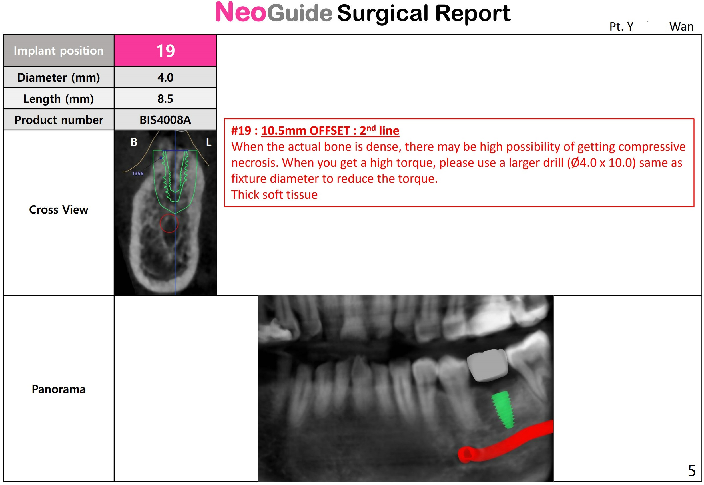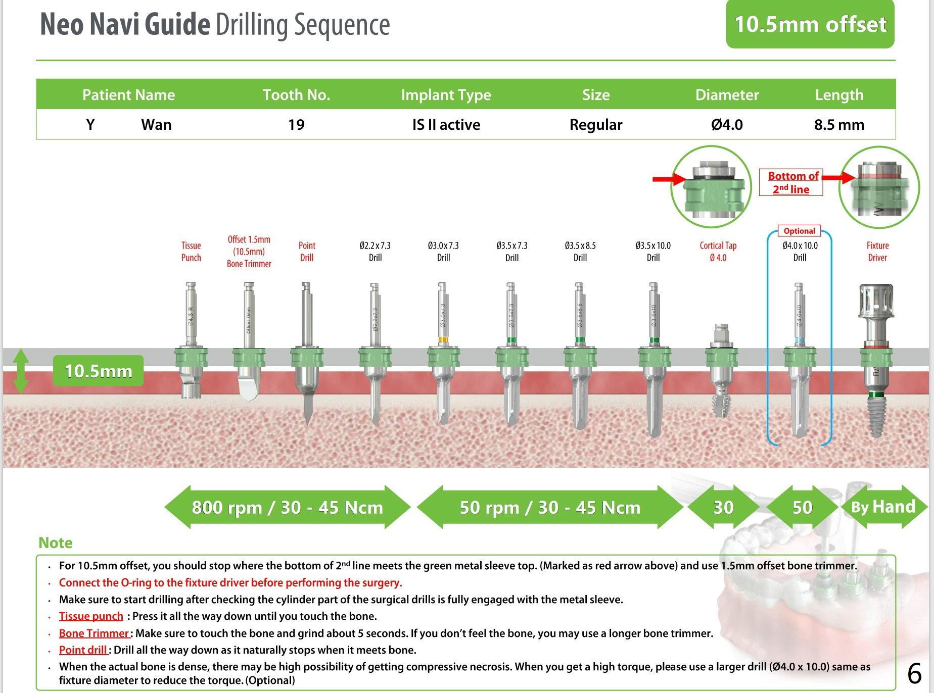 A 64-year-old woman, diabetes, high cholesterol under control, + osteoporosis, taking med once a week. Ask the patient whether #18 RCT retreatment has been done by a specialist. If there is time, finish 9, 21,22 composite. Question: Is this guide made from scan or impression? What should be done before dipping the guide into Chlorhexidine? Since UF 3.8x8.5mm implant will be placed, change the last drill from 3.5x10 to 3.0x10 mm. Use 5.5 mm profile drill.