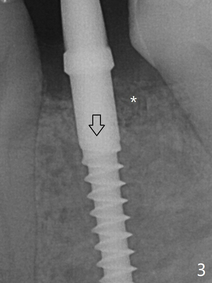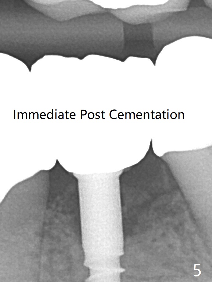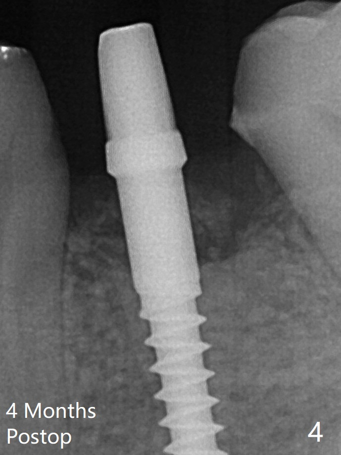 With the implant placed a little deeper (Fig.3 arrow), bone graft is placed (*), followed by suture. There is no bone loss with retention of bone graft 4 months postop; after reprep of the neighboring teeth, impression is taken (Fig.4). The three crowns are cemented 4.5 months postop (Fig.5).