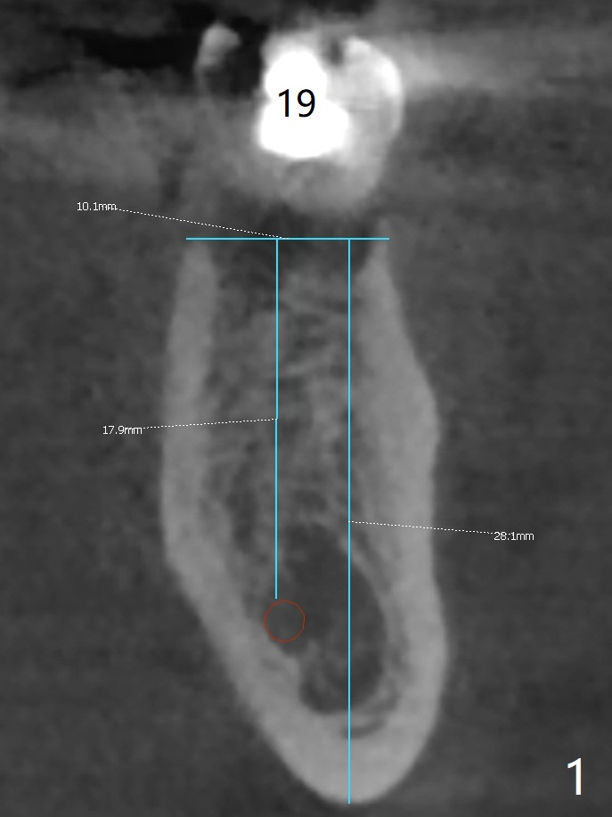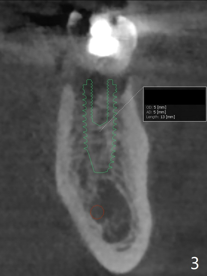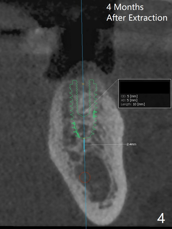 A 54-year-old man has crack at the tooth #19 (Fig.1). The pain gets worse when he returns to home country. The tooth is extracted without bone graft. Four months later, the buccolingual width reduces from 10.1 mm to 5.6 mm (Fig.2). A shorter implant (13 vs. 10 mm) has to be placed and also deeper (compare Fig.3,4) with higher chance of screw loosening.