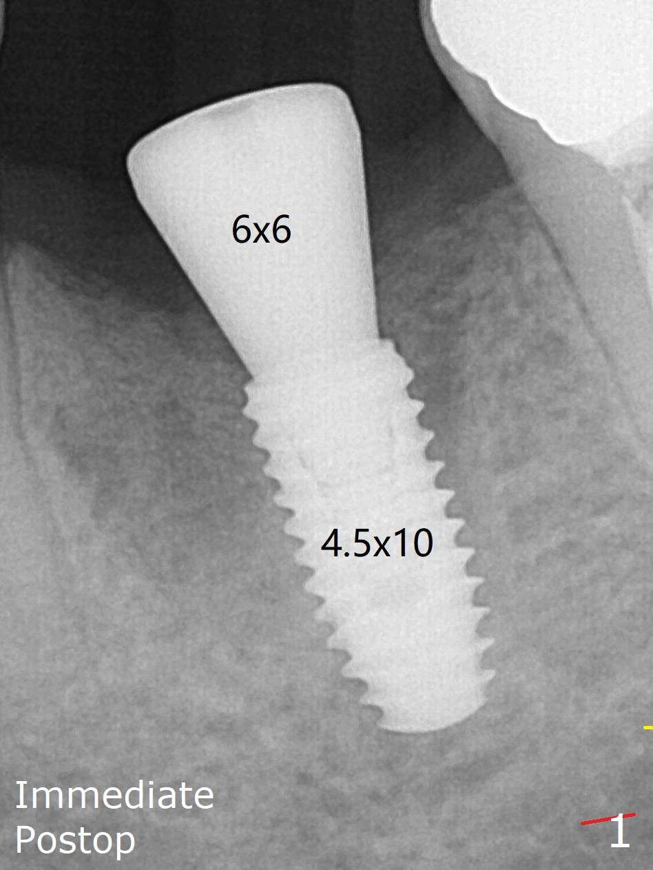 A long abutment is placed for restoration 4 months postop (Fig.3), increasing the chance of abutment screw loosening (as compared to immediate implant) if the abutment is incompletely seated.