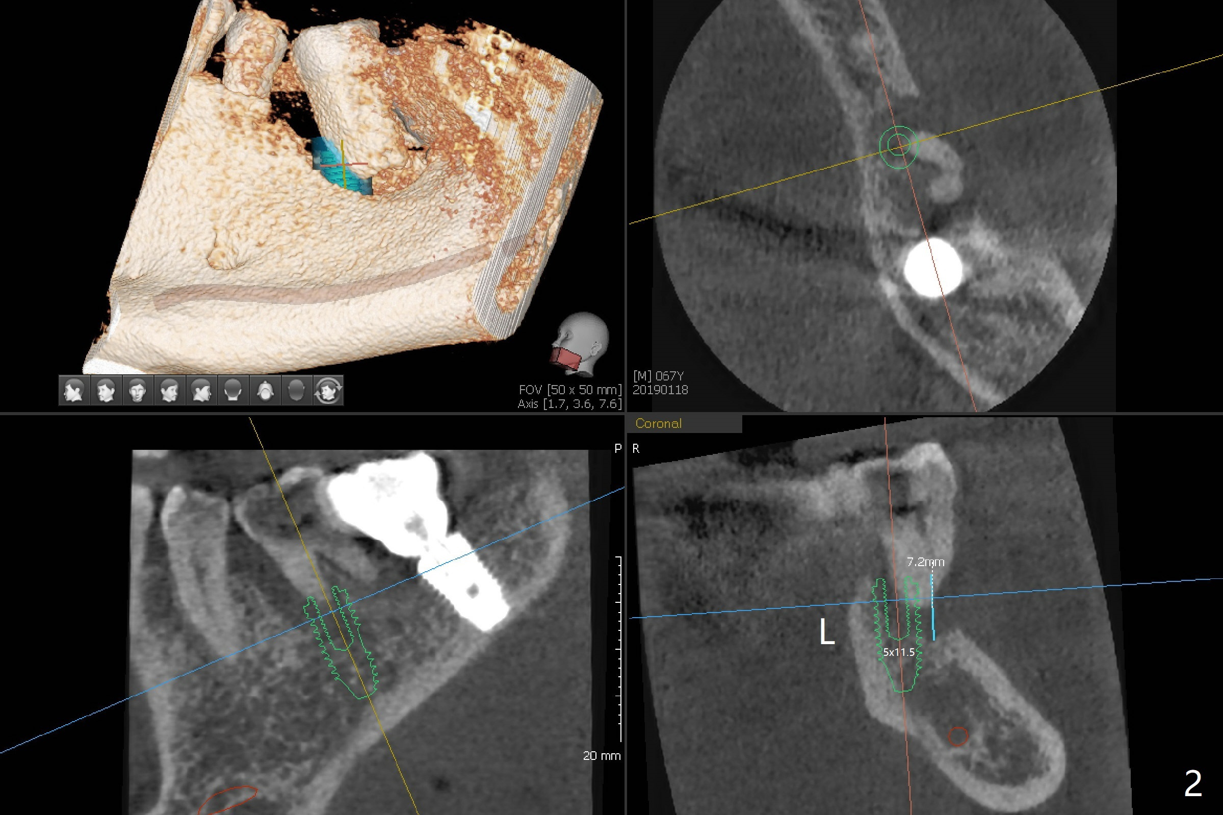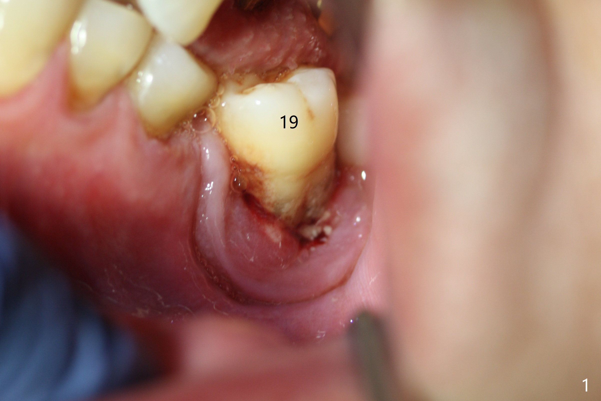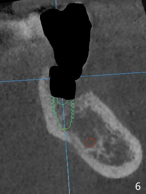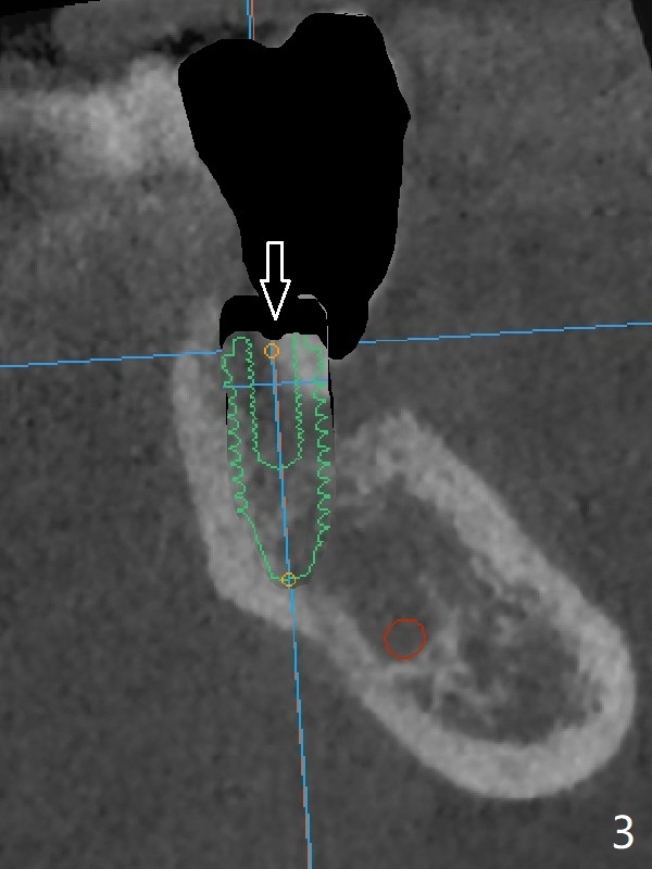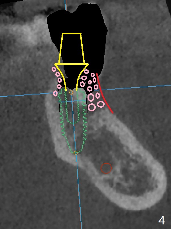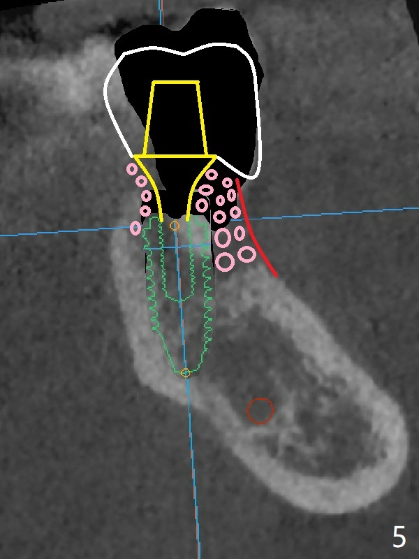 A 67-year-old man requests treatment for the tooth #19 with severe buccal gingival recession (Fig.1). After extraction, a 5x11.5 mm implant will be placed as lingual as possible (Fig.2 L) with ~7 mm buccal implant thread exposure. To reduce the exposure, the implant will be placed deeper, as shown by arrow in Fig.3. PRF membrane and collagen membrane (Fig.4 red line) will be placed against the buccal gingiva, while PRF associated sticky bone (allograft, pink circle) will be packed around the exposed implant threads and a long-cuff abutment (yellow). Finally an immediate provisional (Fig.5 white) will be fabricated to cover the bone graft.