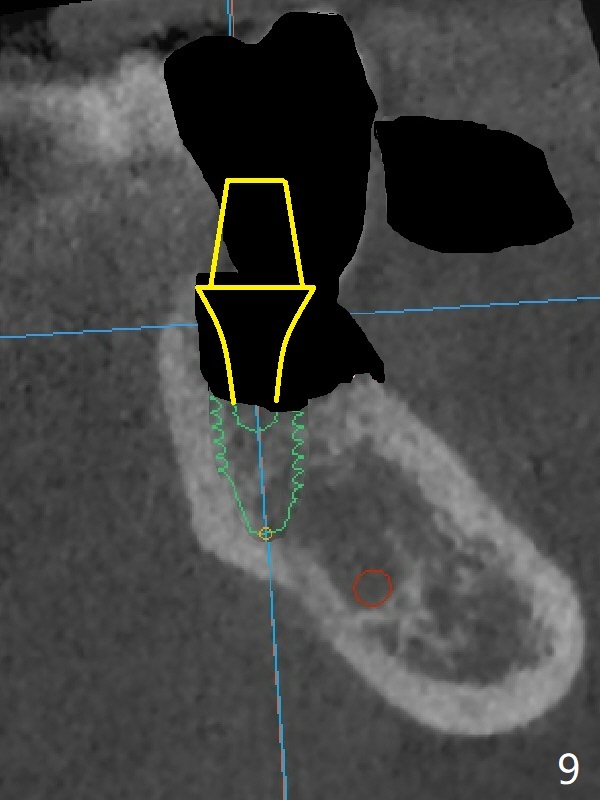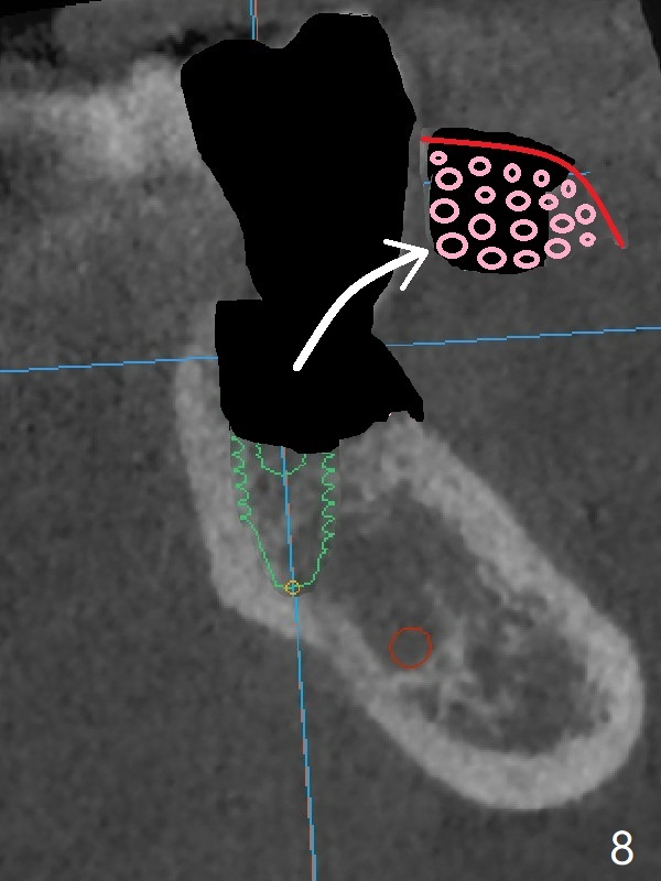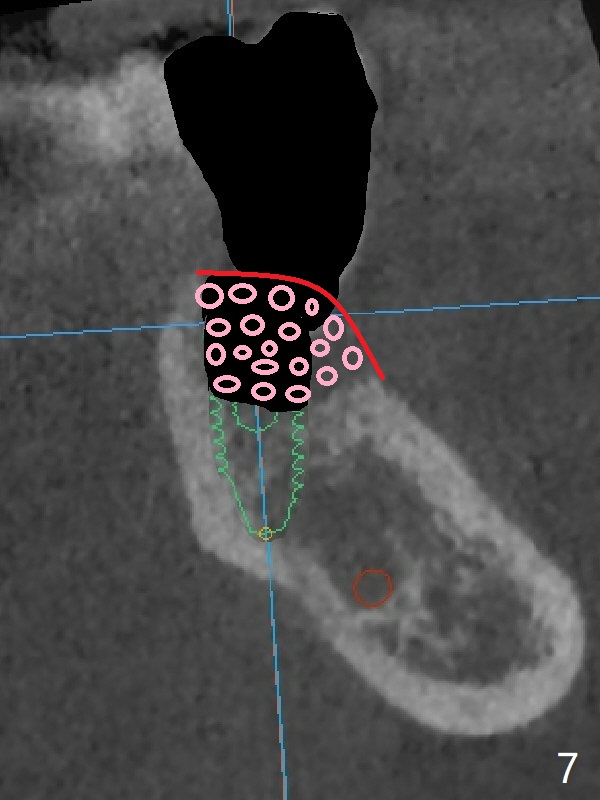 In contrast without implantation after extraction (Fig.6 (ignore green)), the socket may be grafted (Fig.7 pink circles) and covered by PRF membrane (red line). Due to the large socket with severe buccal defect, the graft is more likely to be lost (Fig.8). Several months later, an implant to be placed (Fig.9 green) will be short with unfavorable crown/implant ratio.